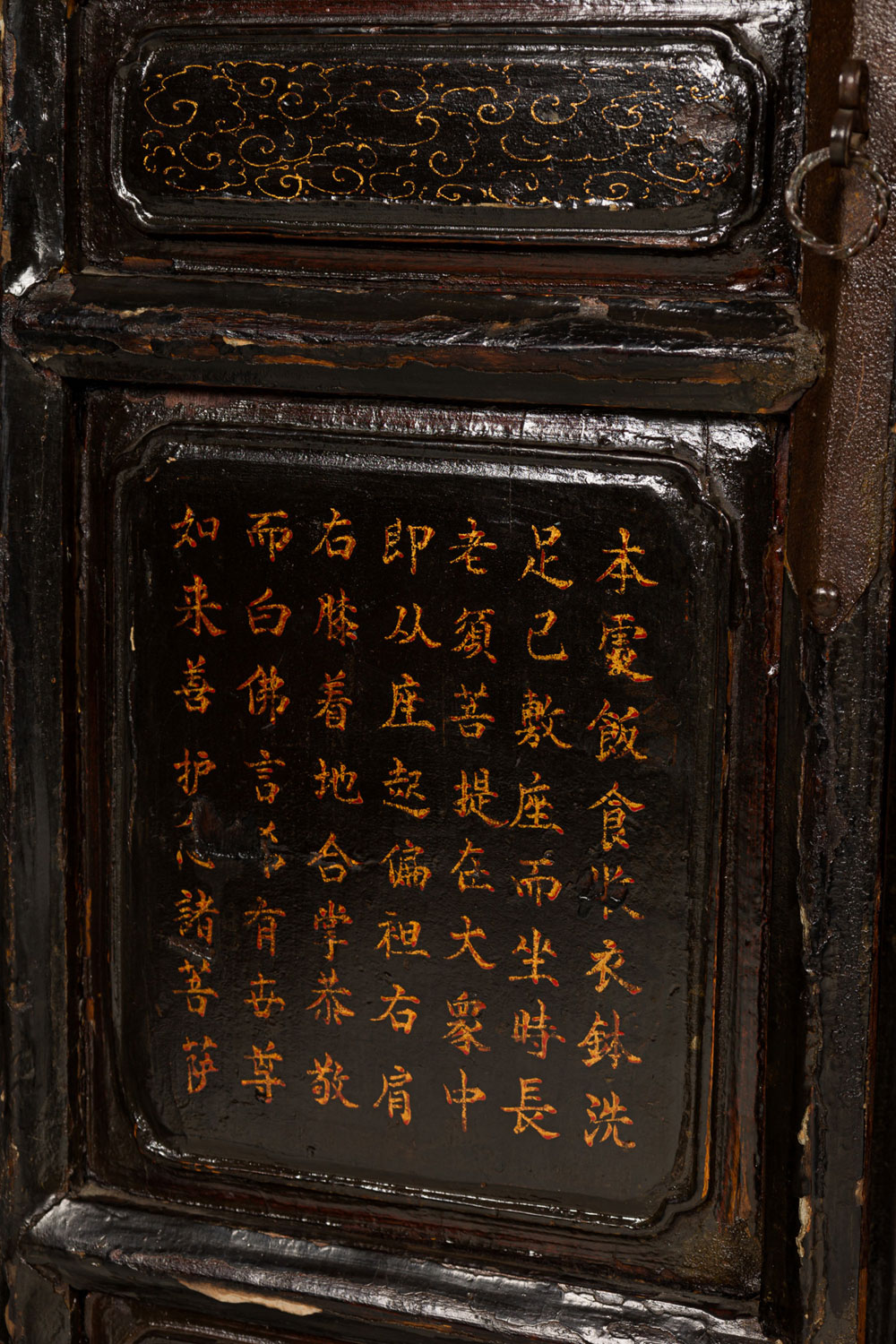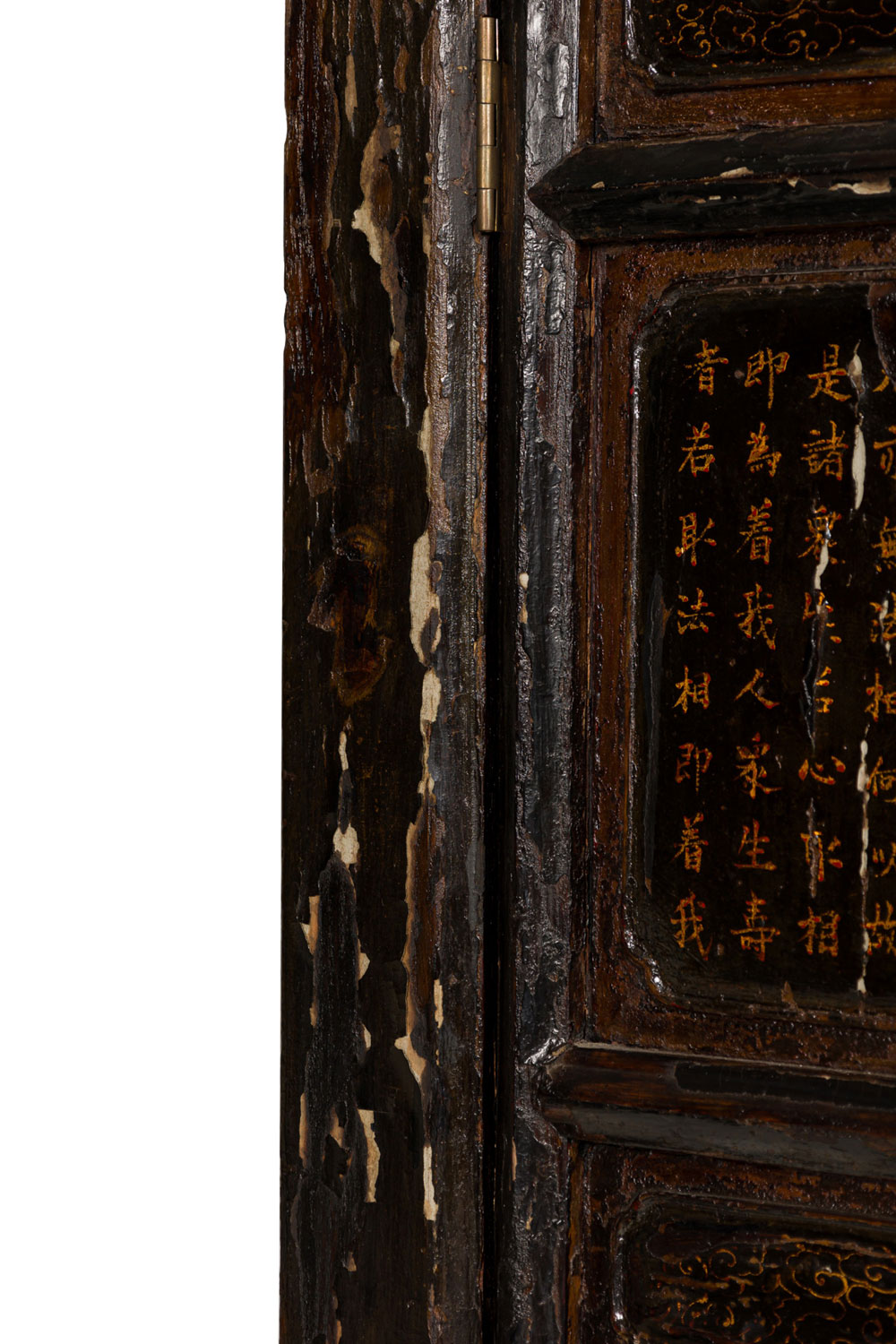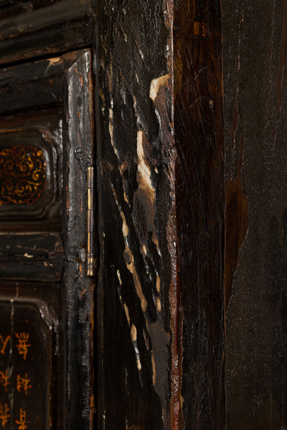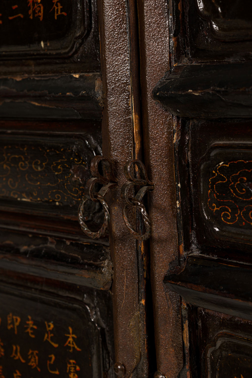 Asian Chinese black lacquered over elm cabinet with two fold-back doors with Chinese character decoration covering front..