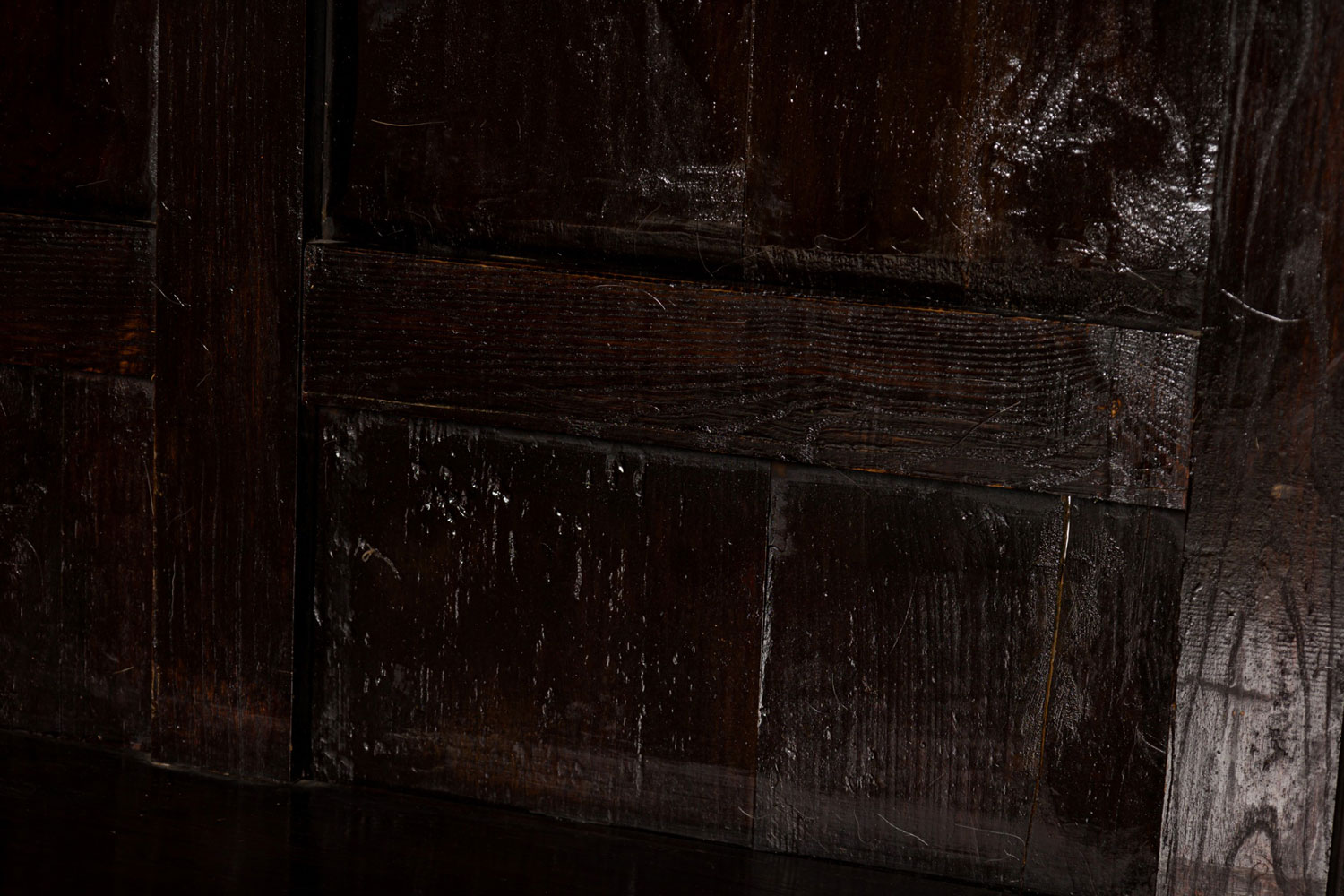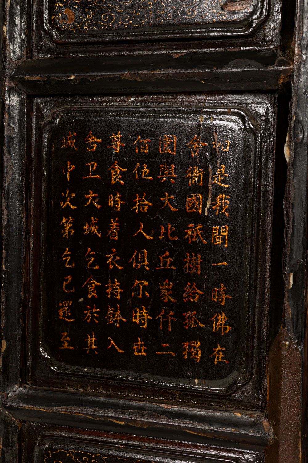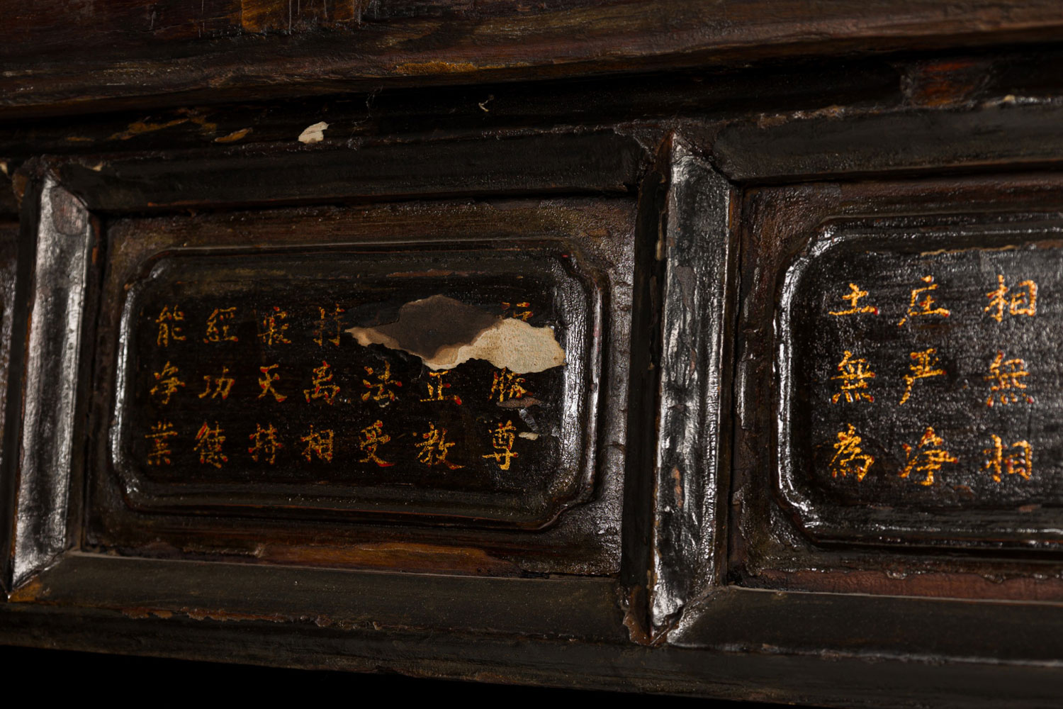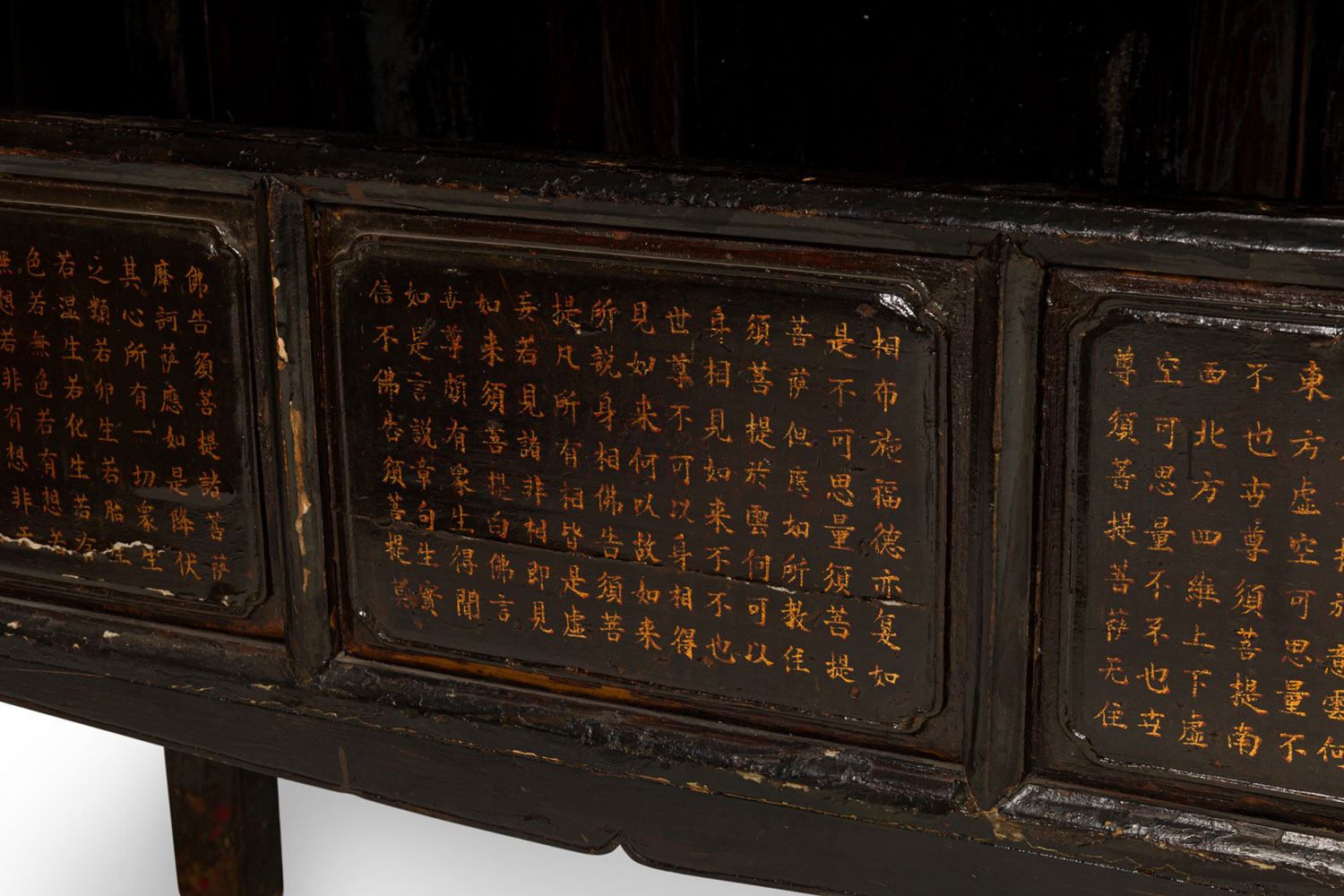 Asian Chinese black lacquered over elm cabinet with two fold-back doors with Chinese character decoration covering front..