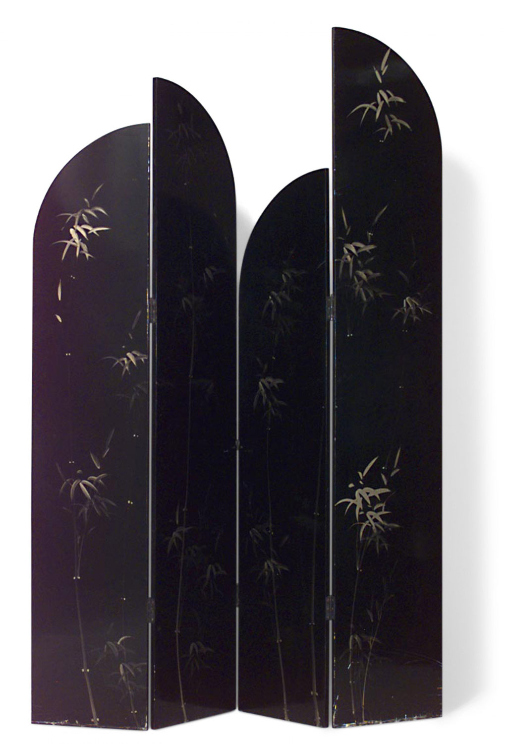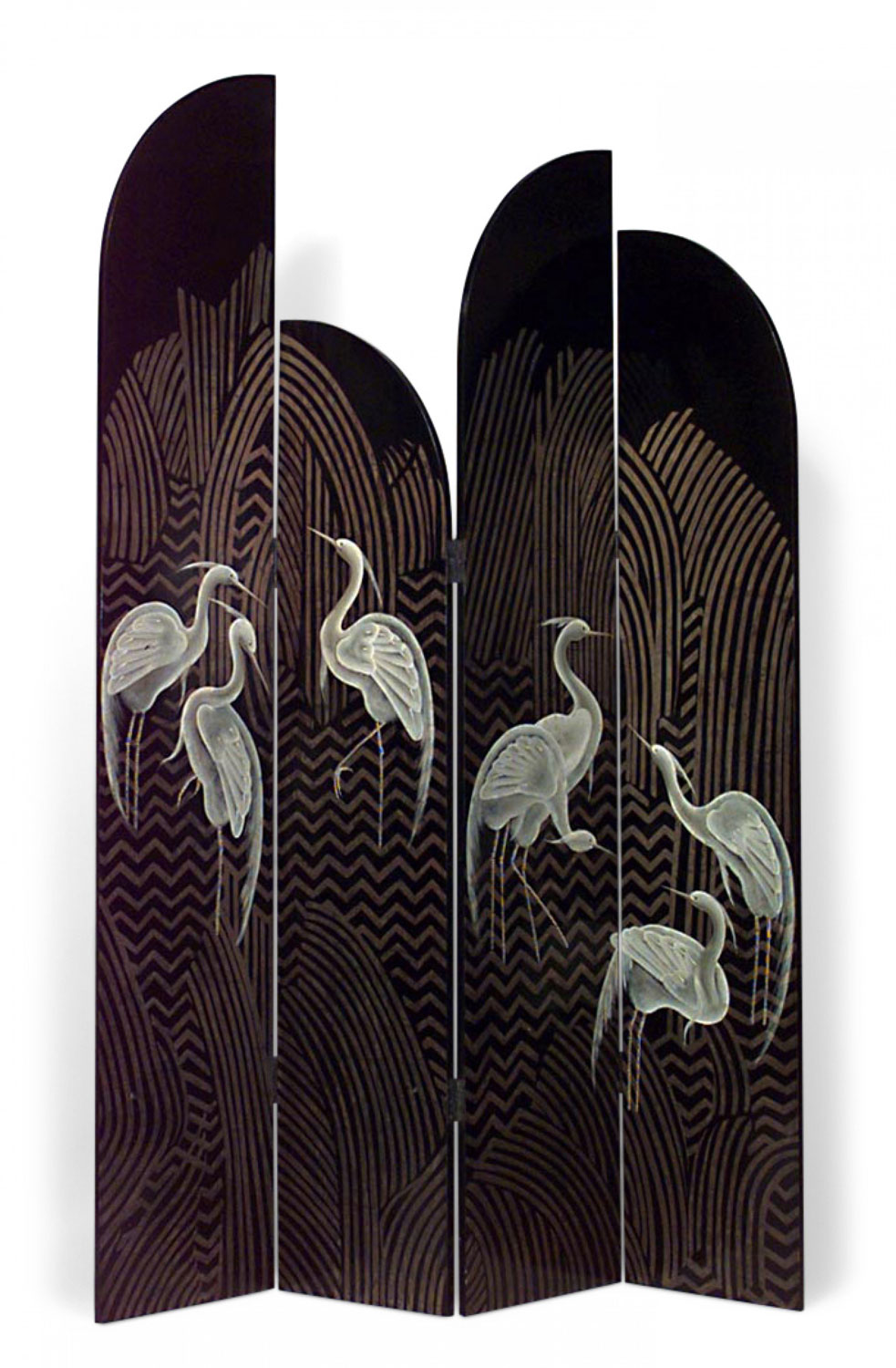 Asian Chinese style (20th Century) black coromandel 4 fold screen with heron design and 4 graduated tier panels.