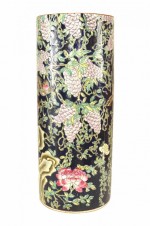 Asian Chinese (20th Century) porcelain cylindrical shaped umbrella stand with dark blue, purple and green decoration of birds and flowers.