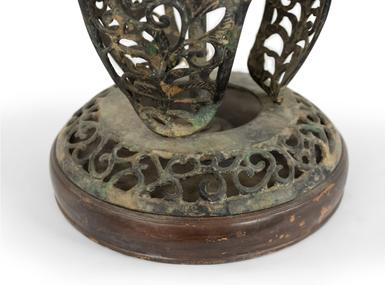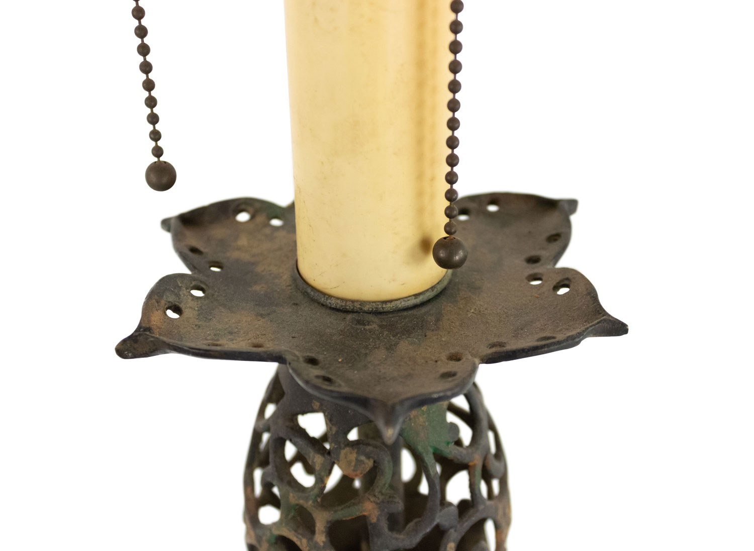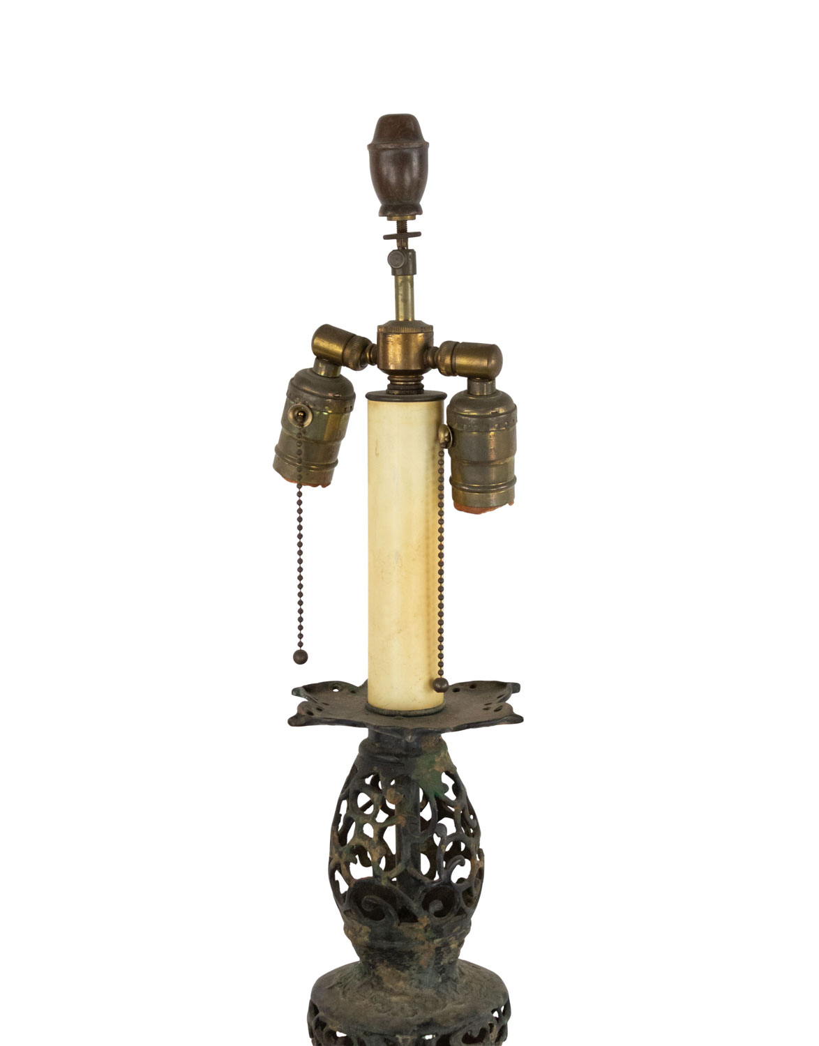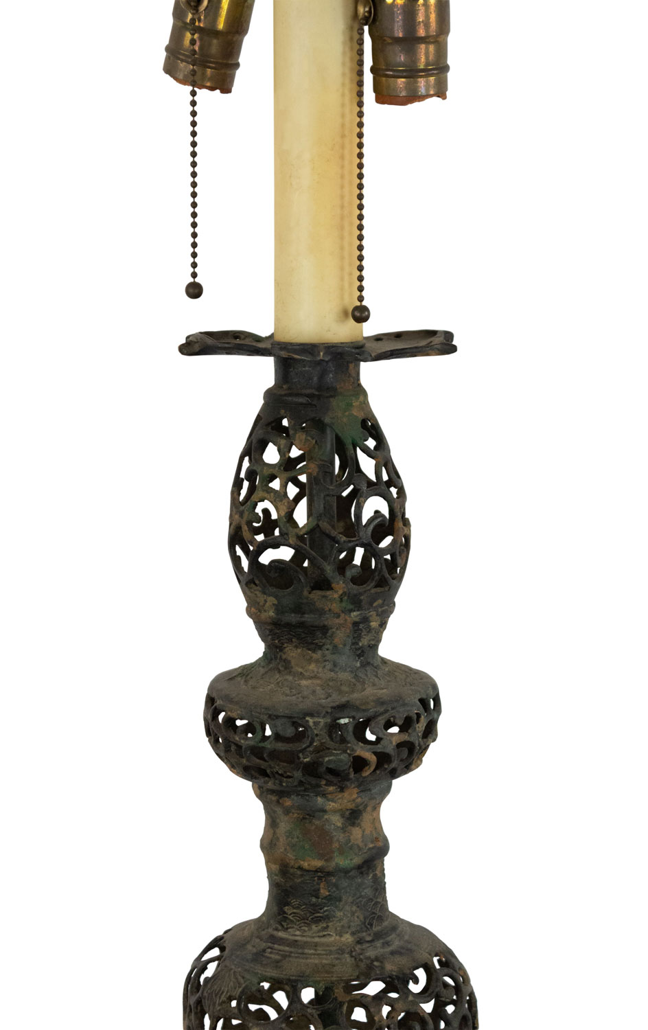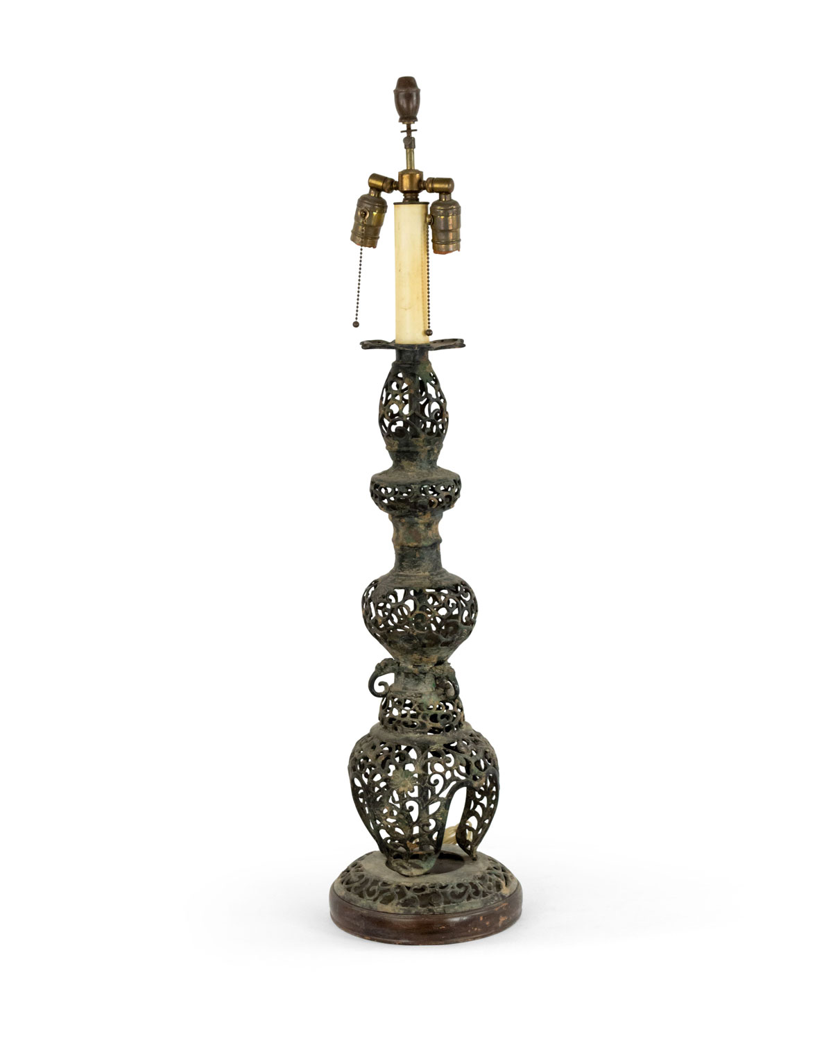 Asian Chinese style (19/20th Century) tall black iron filigree design tiered table lamp on a round base..