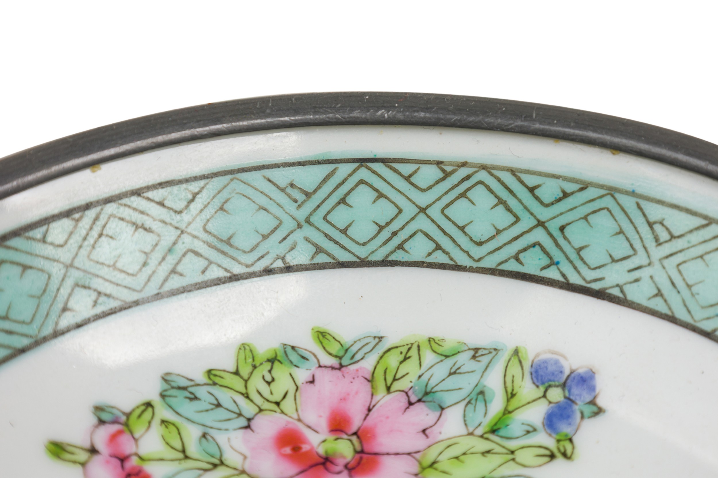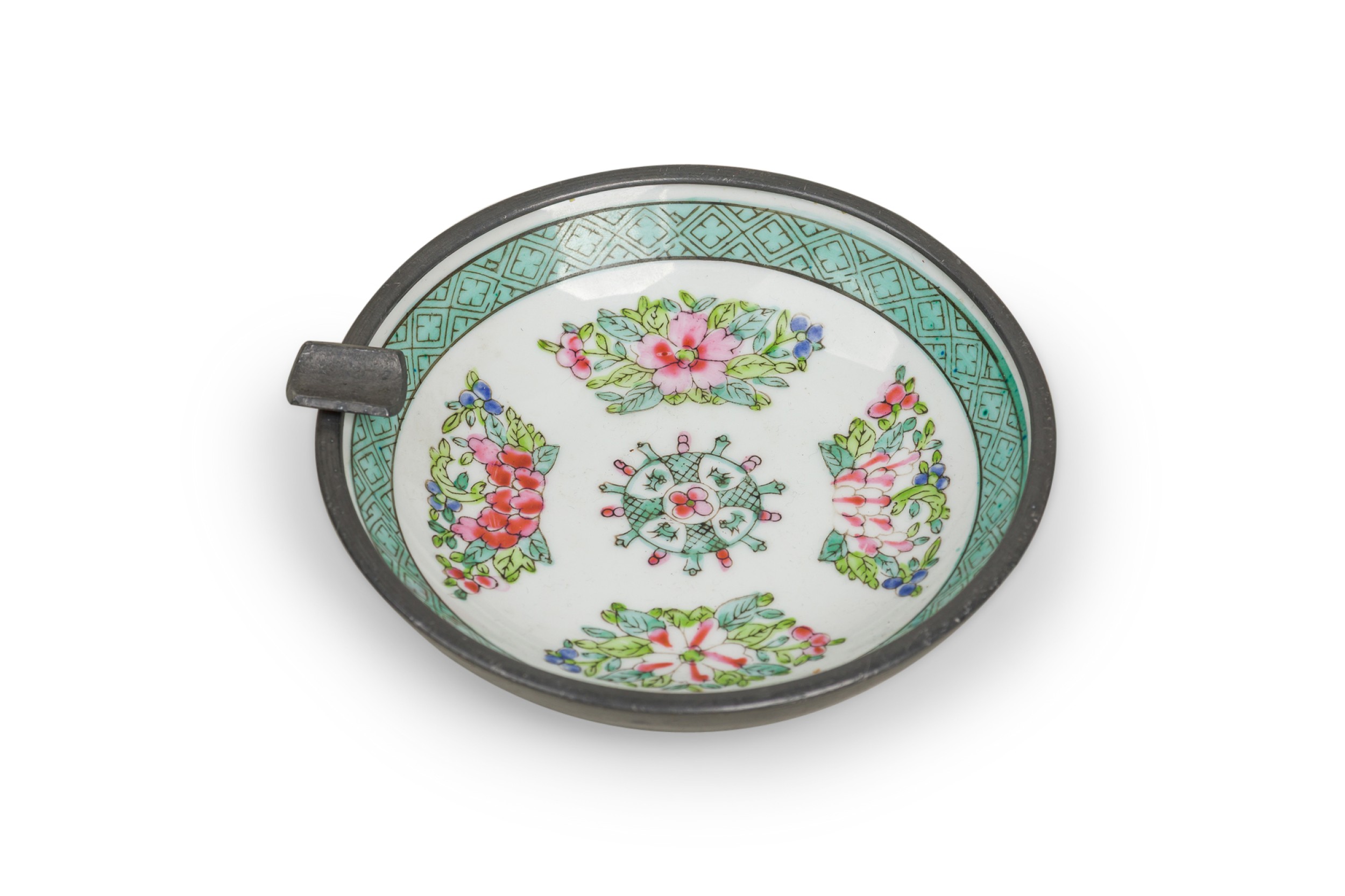 Asian Chinese style Mid-Century blue/green and white porcelain and pewter clad ashtray bearing floral details and geometric border with an elegantly placed cigarette holder