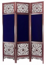 Asian Chinese style (19th Century) teak 3 fold screen with filigree carved top and bottom and blue velvet center..