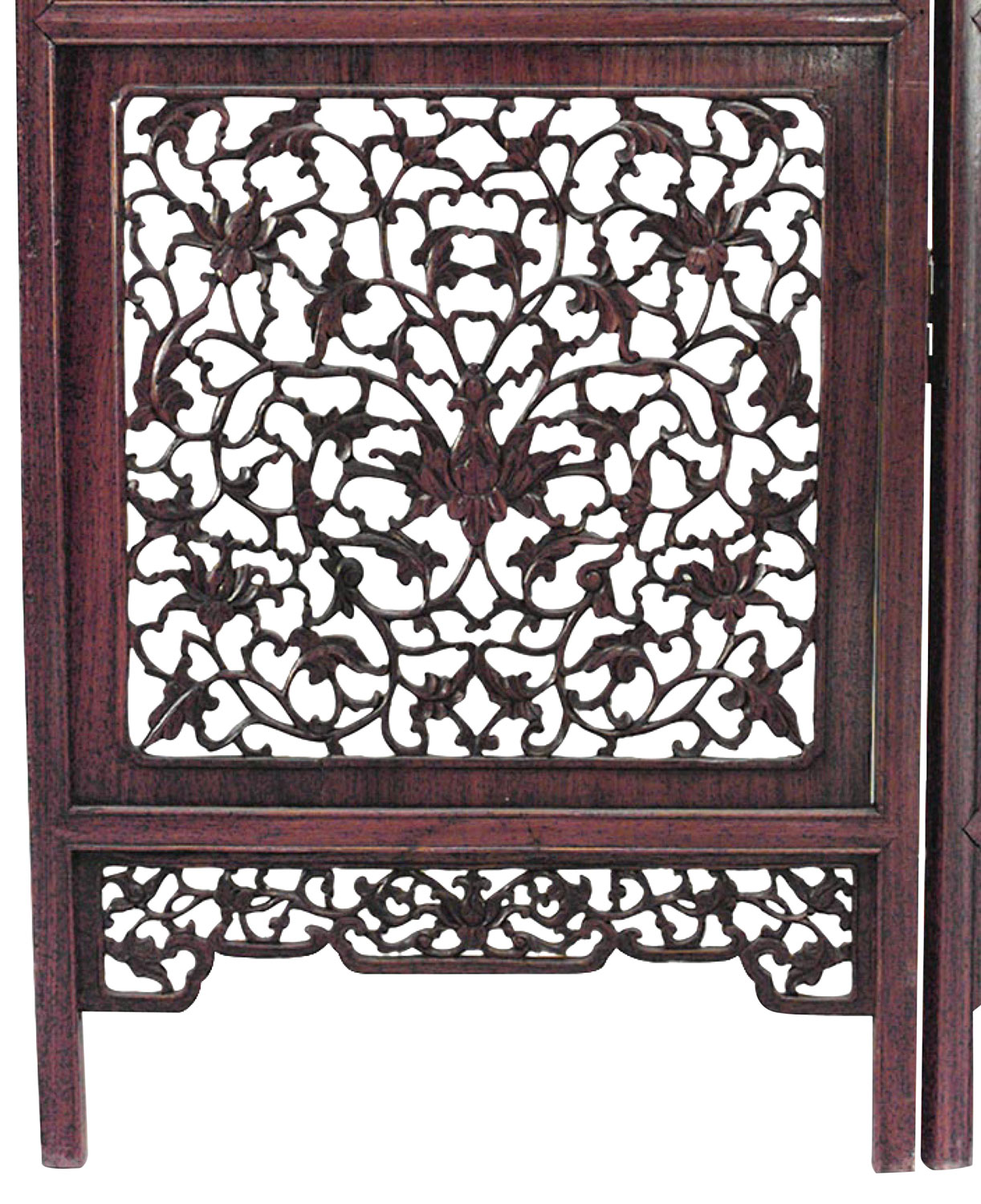 Chinese Teak 3-Fold Screen with Carved Filigree and Velvet Upholstery