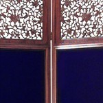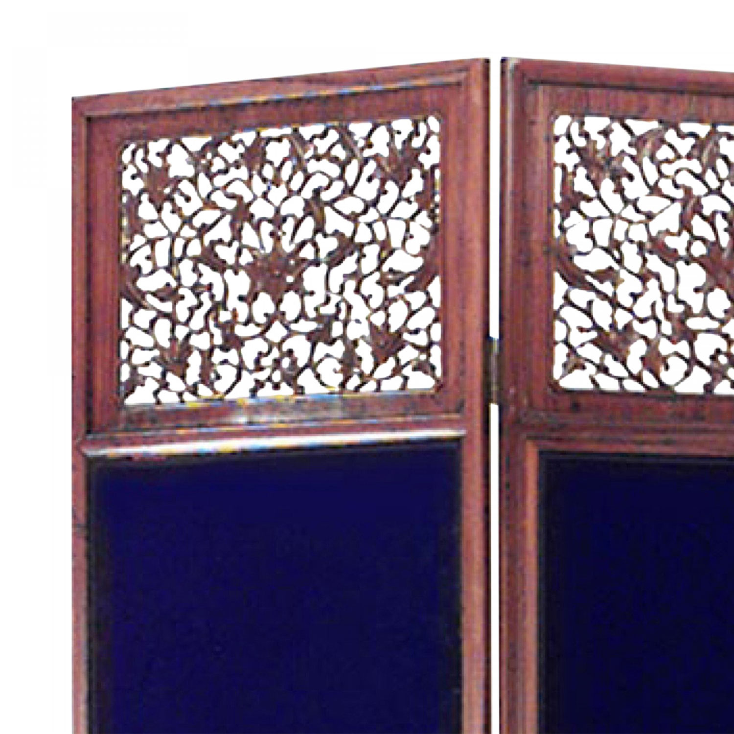 Asian Chinese style (19th Century) teak 3 fold screen with filigree carved top and bottom and blue velvet center.