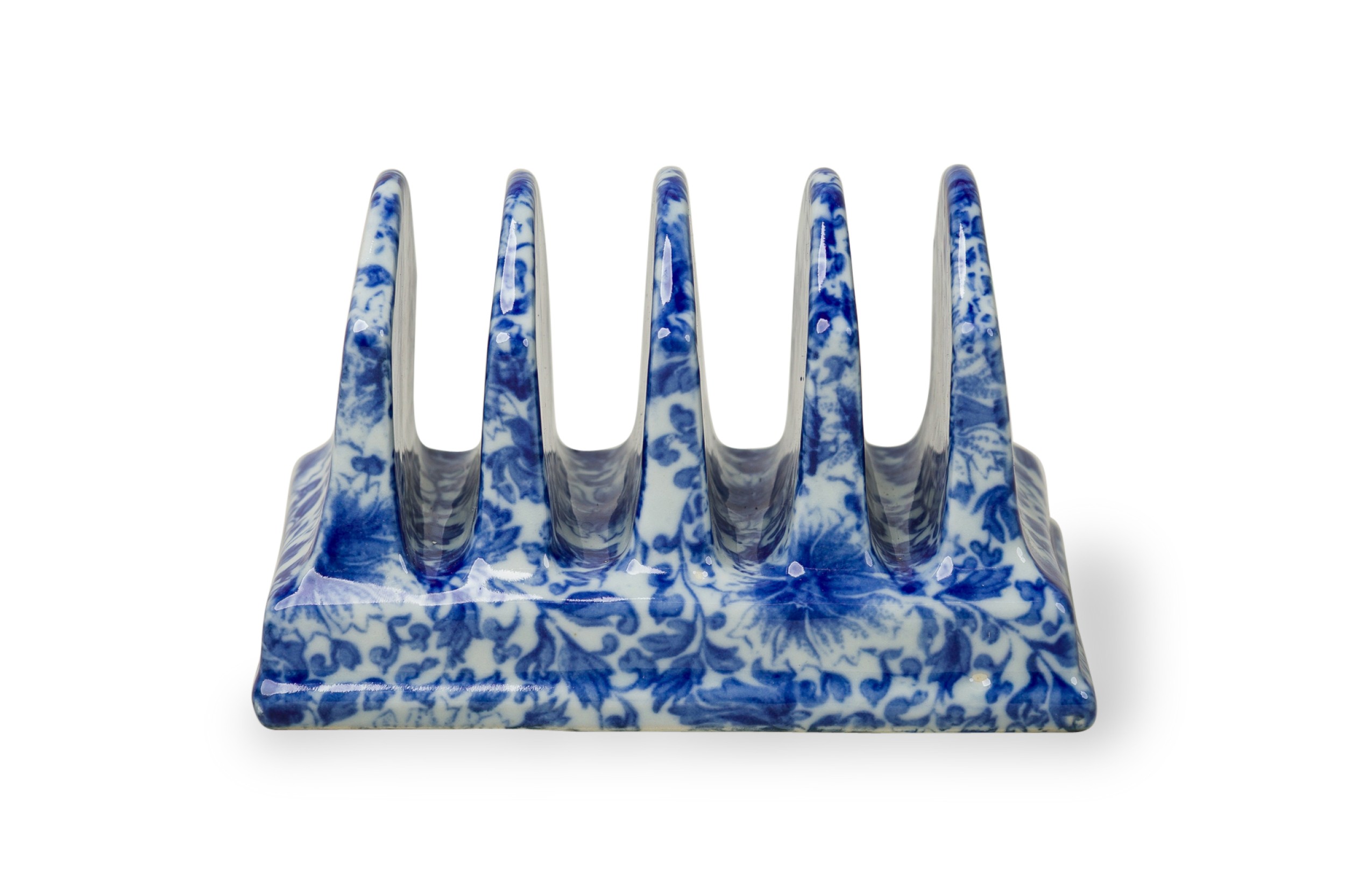Chinese Transferware blue and white floral decorated ceramic napkin / toast rack with four compartments on a rectangular base (marked on bottom).