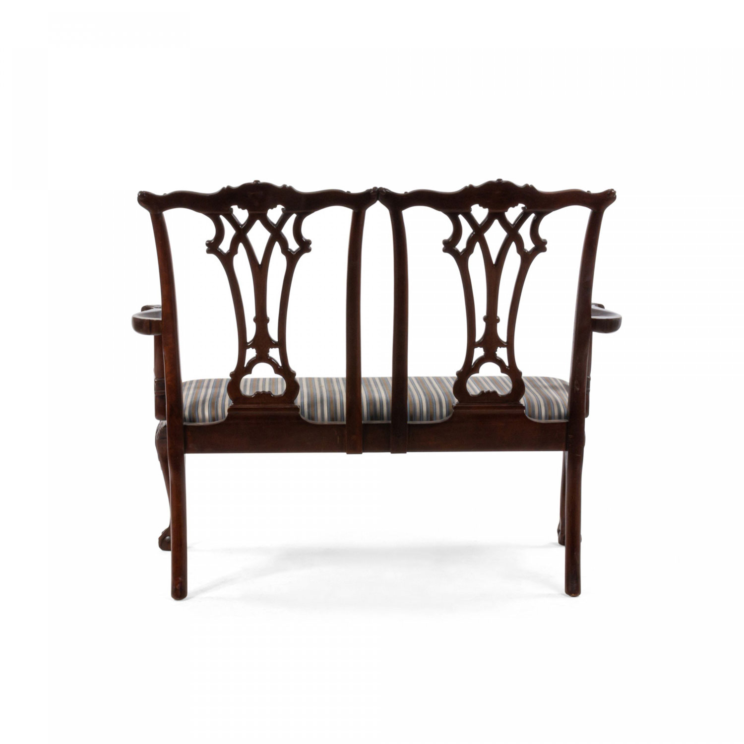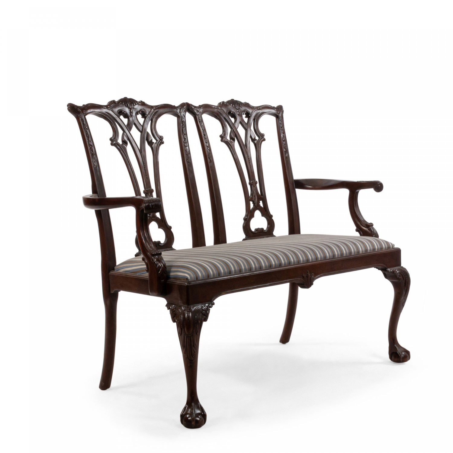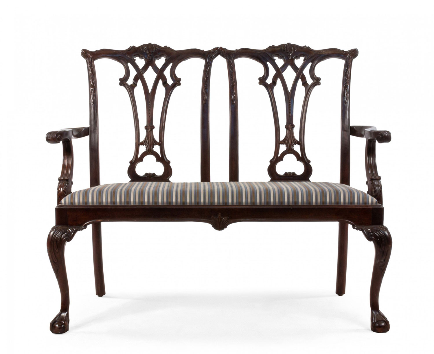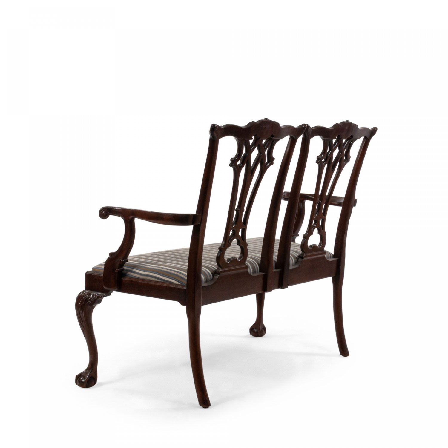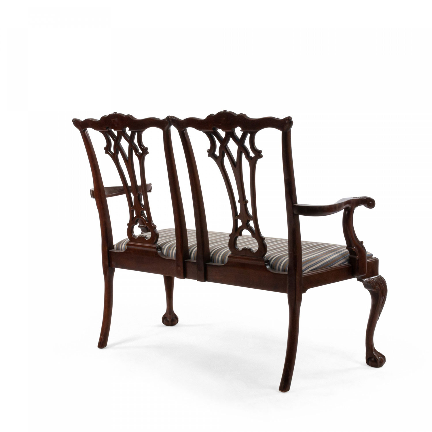English Chippendale style (late 19th Cent) mahogany loveseat with open carved double chair back having beige & blue striped upholstered seat supported on cabriole legs with ball & claw feet..