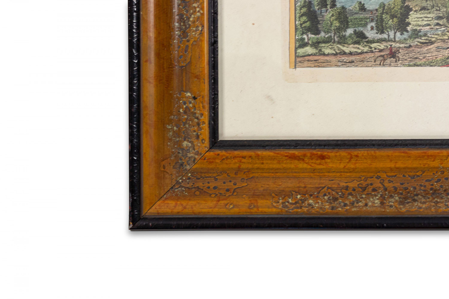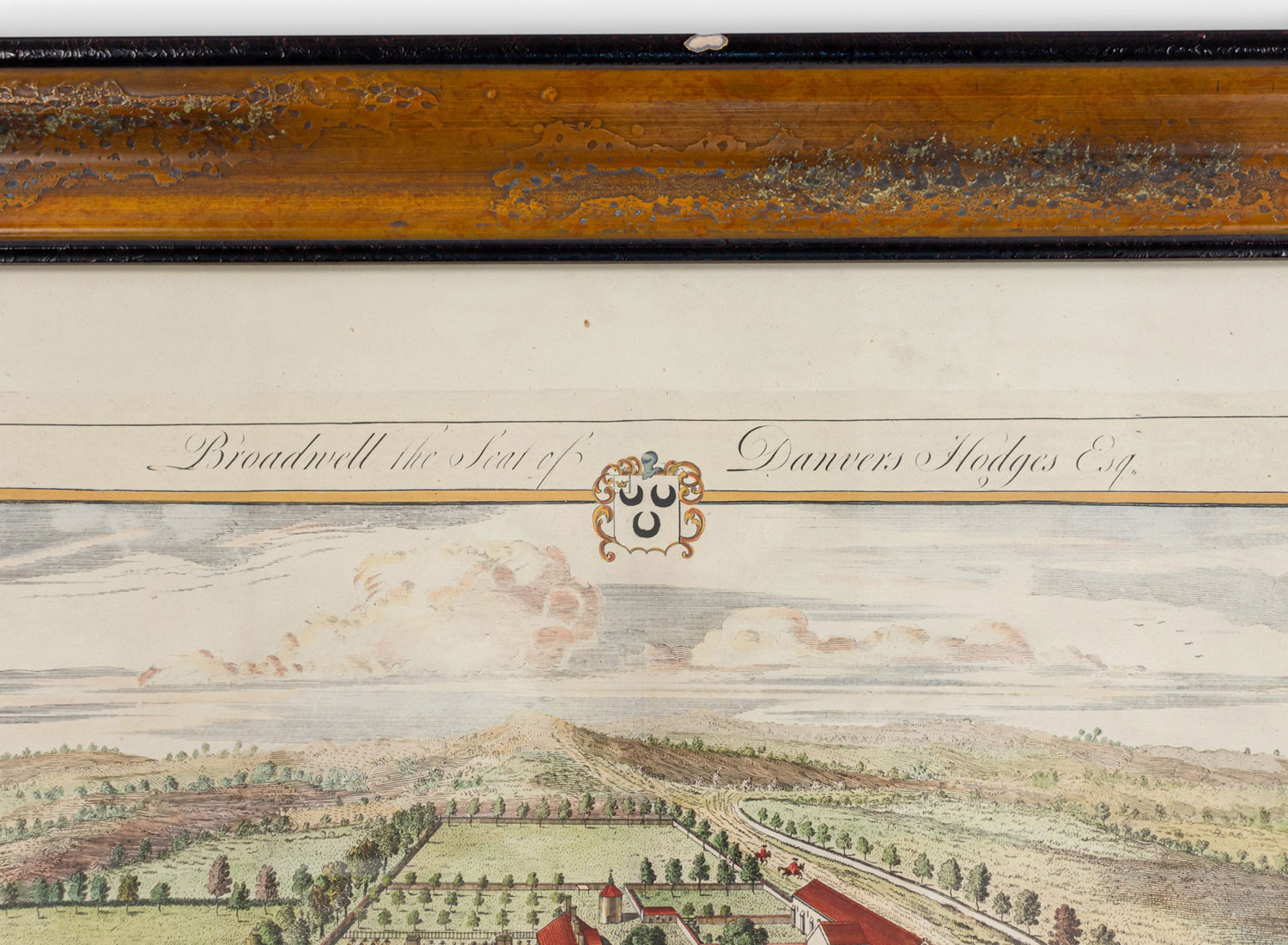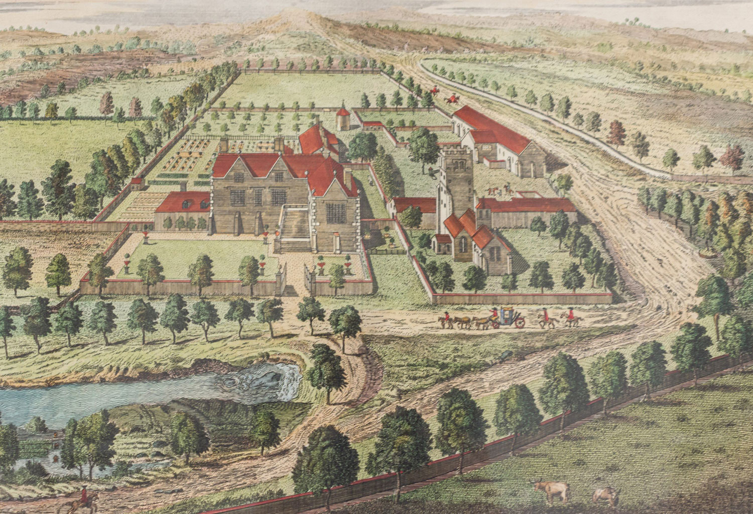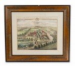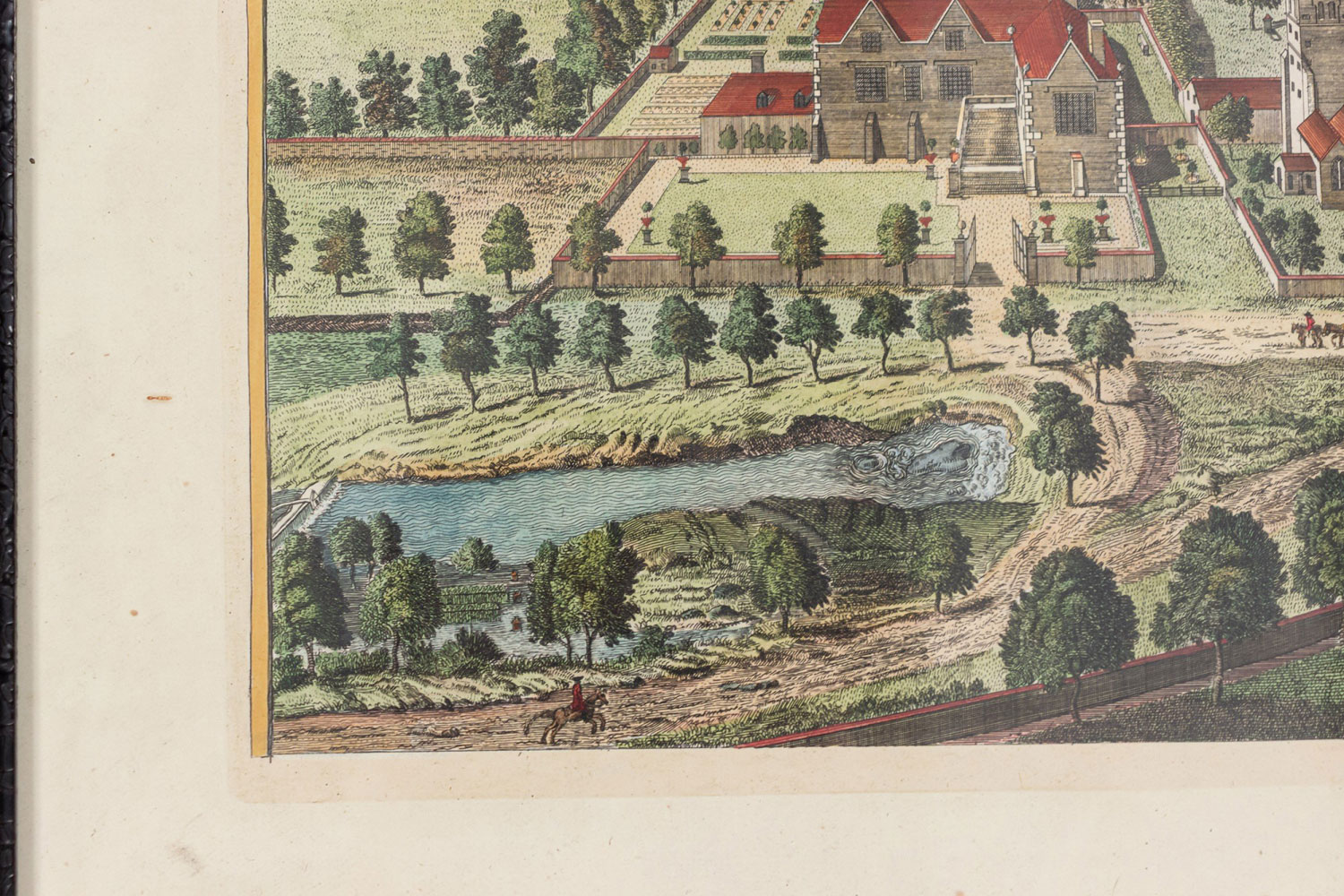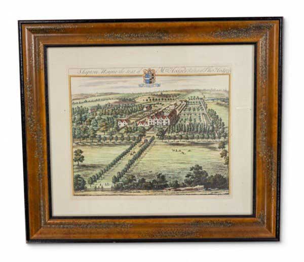 English Victorian color lithograph of the aerial view of an English estate in white matting and a rectangular wood & black trimmed frame (Companion piece: 062454)