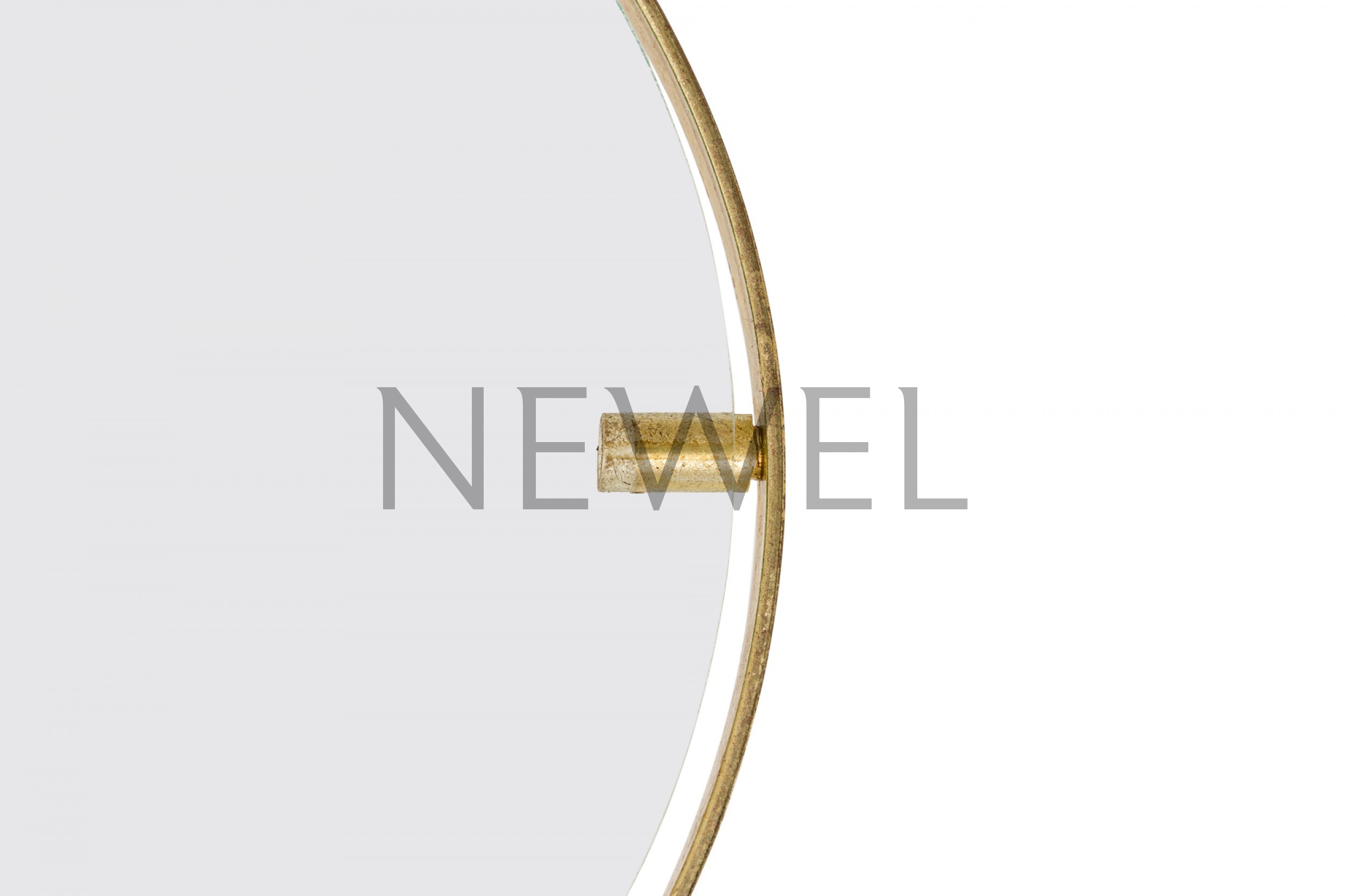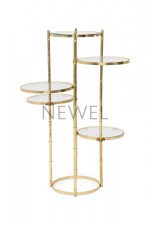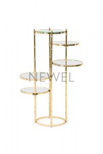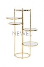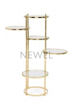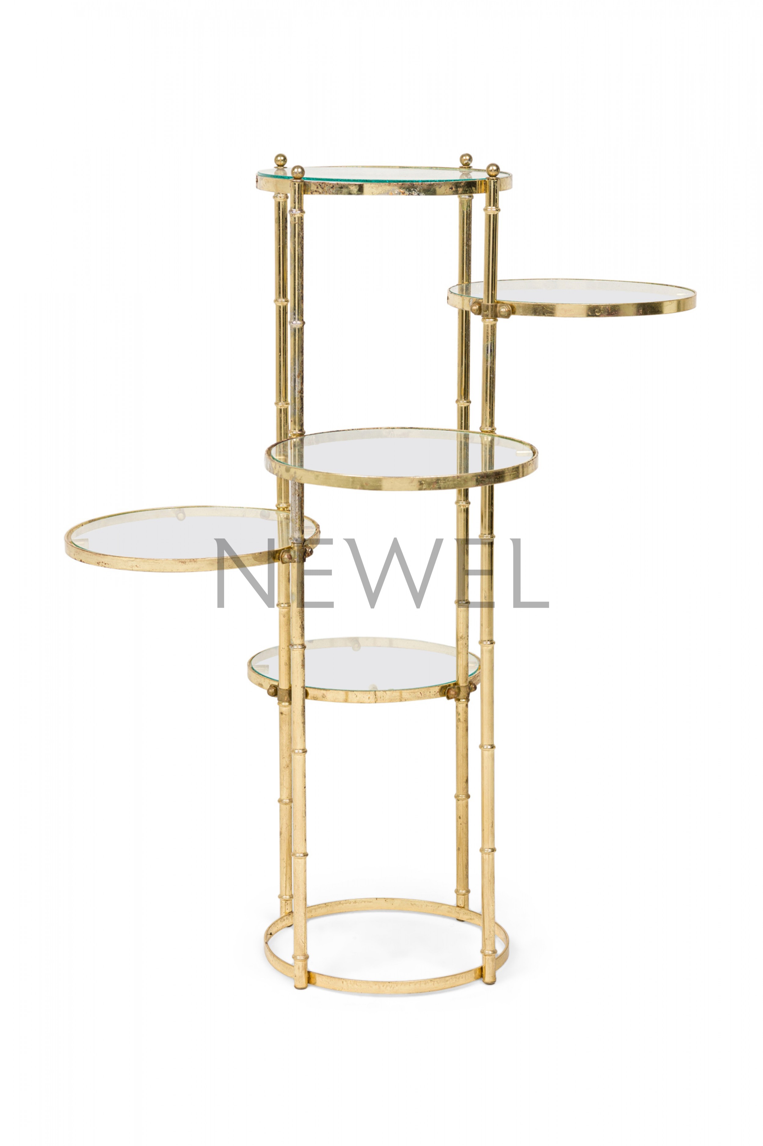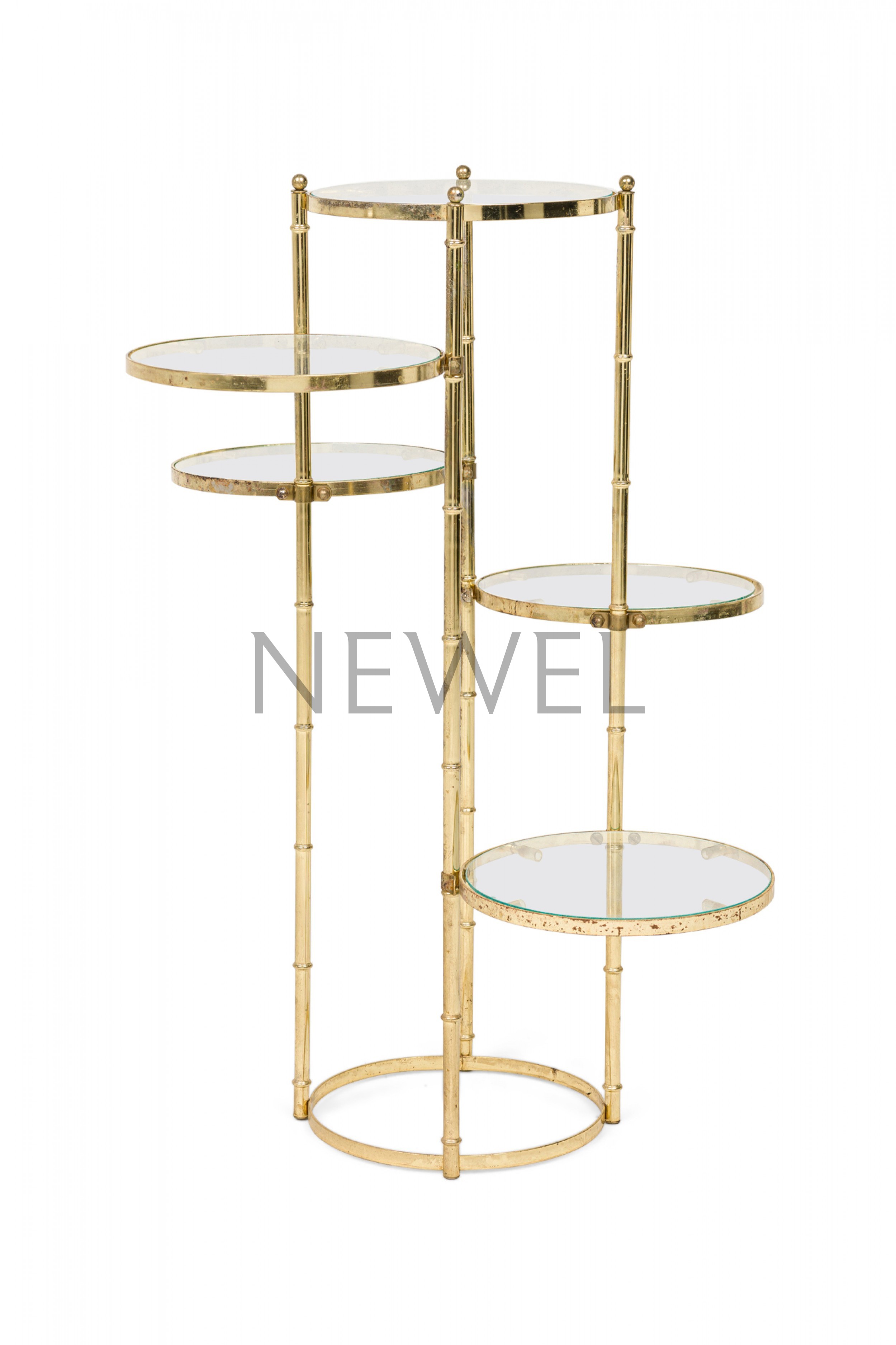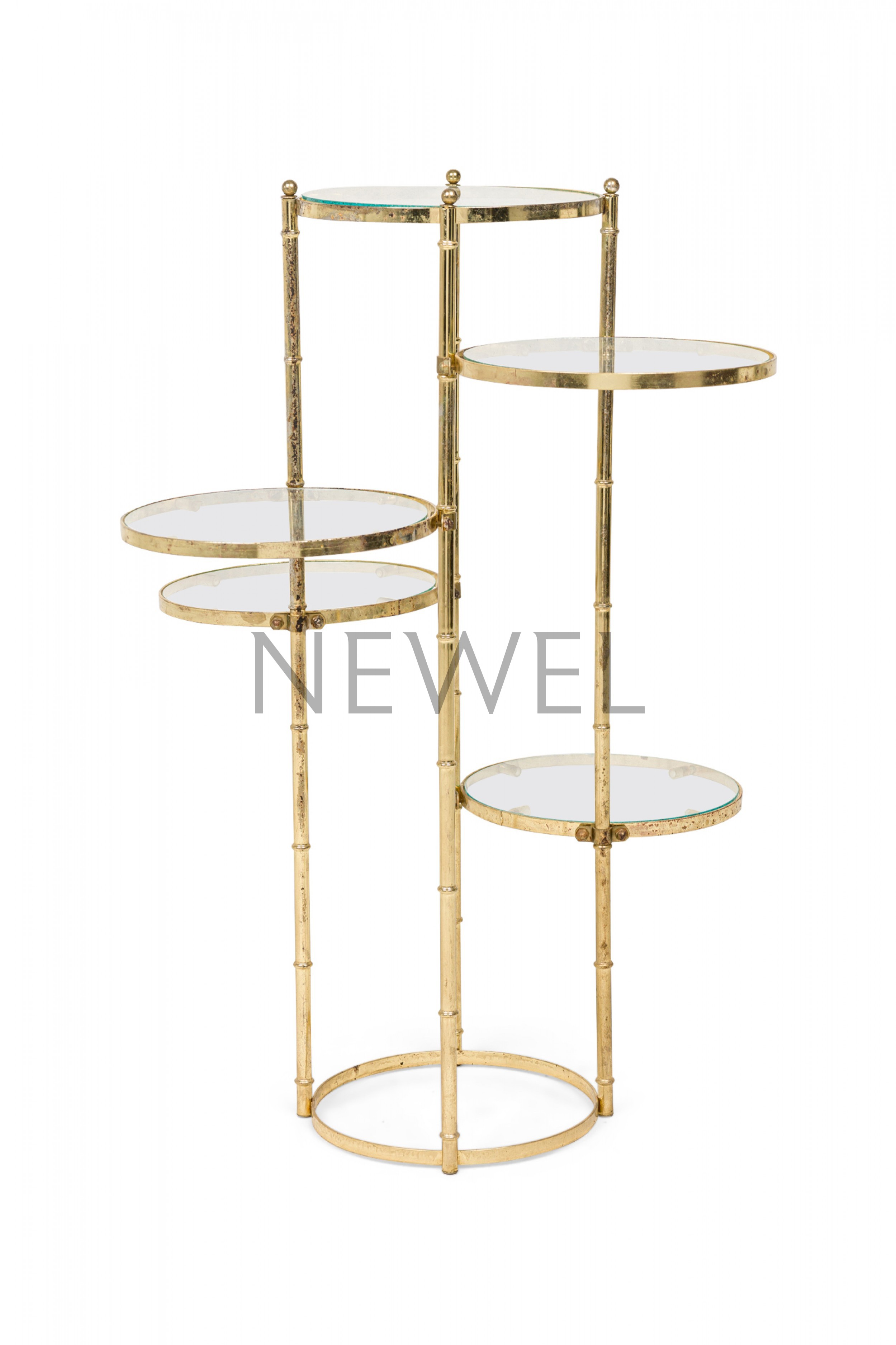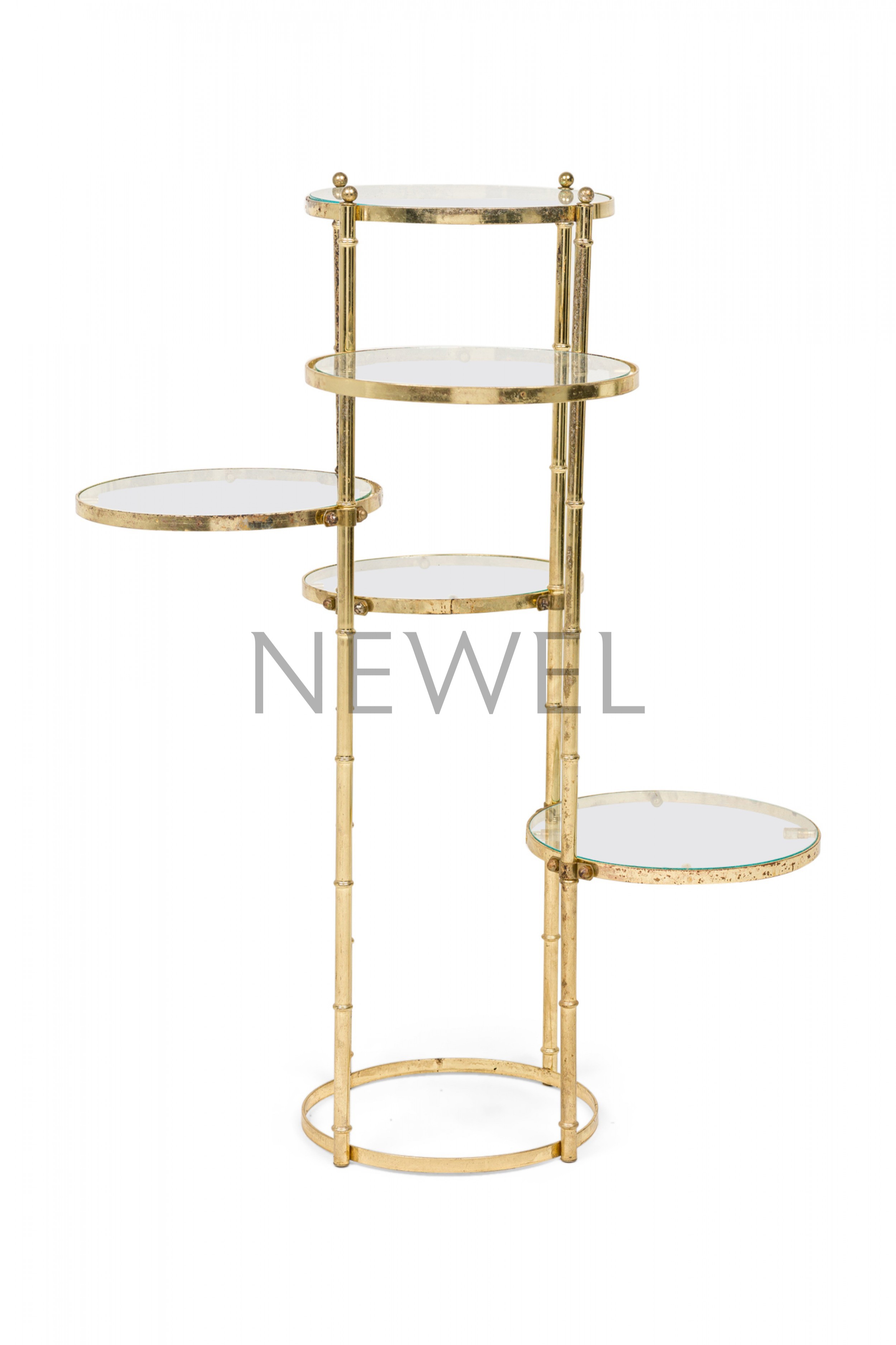 Contemporary American plant stand with a gilt metal frame supporting 5 tiered circular shelves with clear glass tops, spiraling down the exterior of central four-post frame with a circular base.