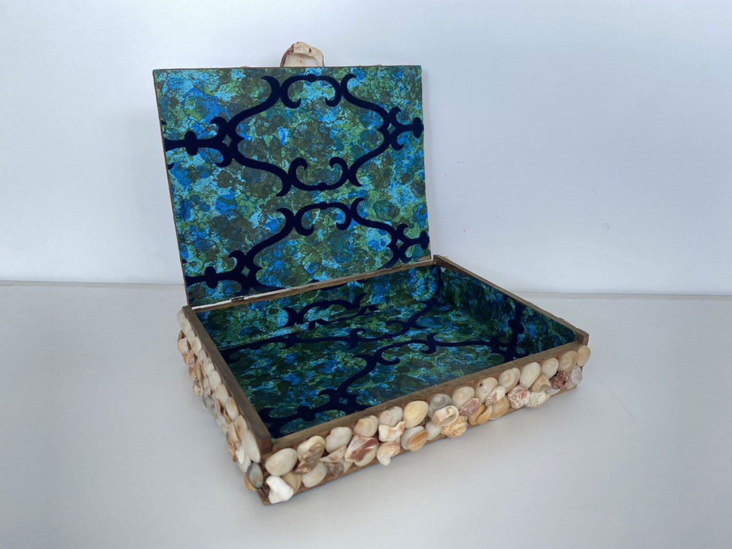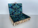 Contemporary American Modern rectangular box, with an applied seashell veneer and green, teal and blue patterned interior..