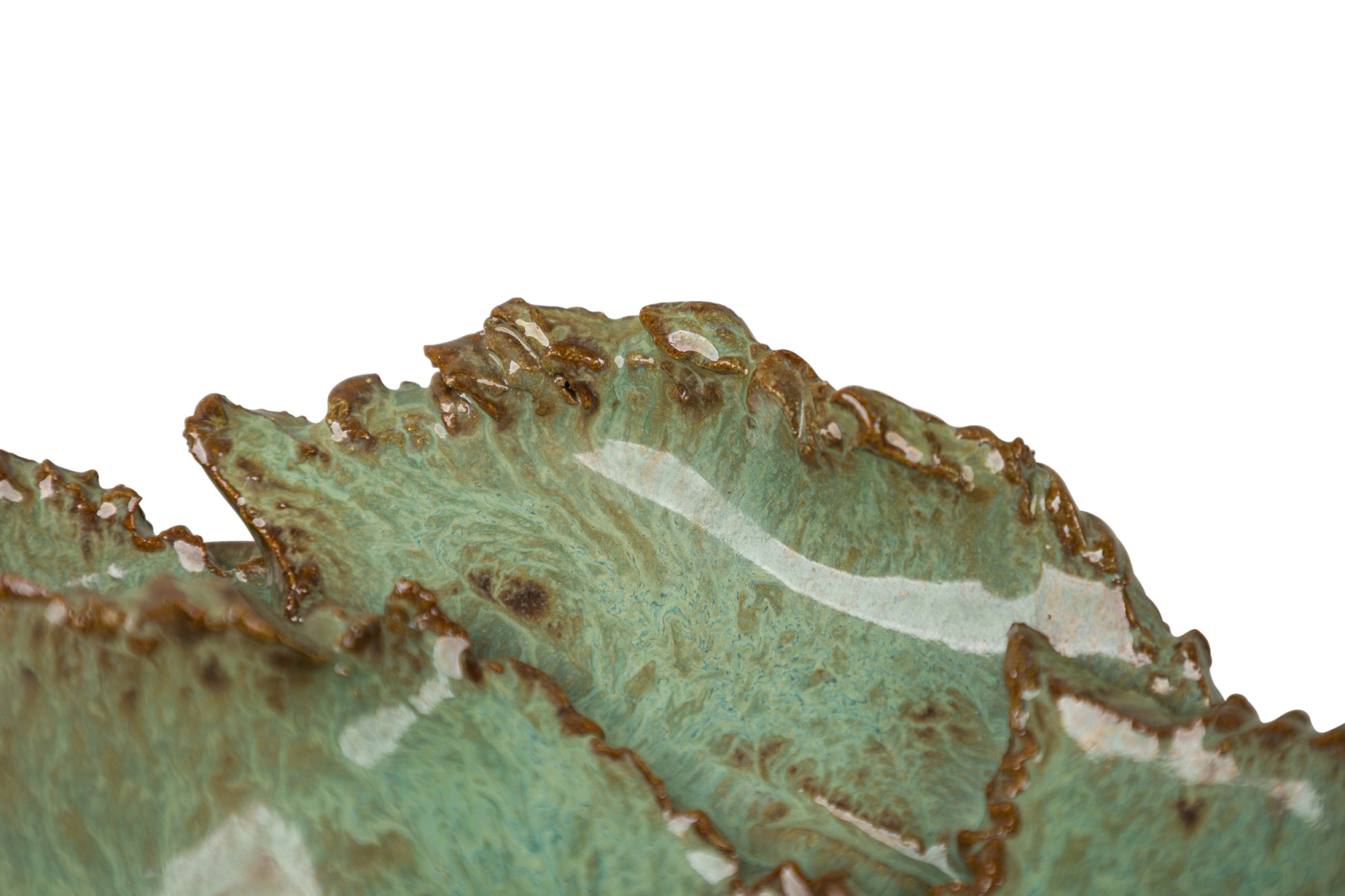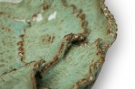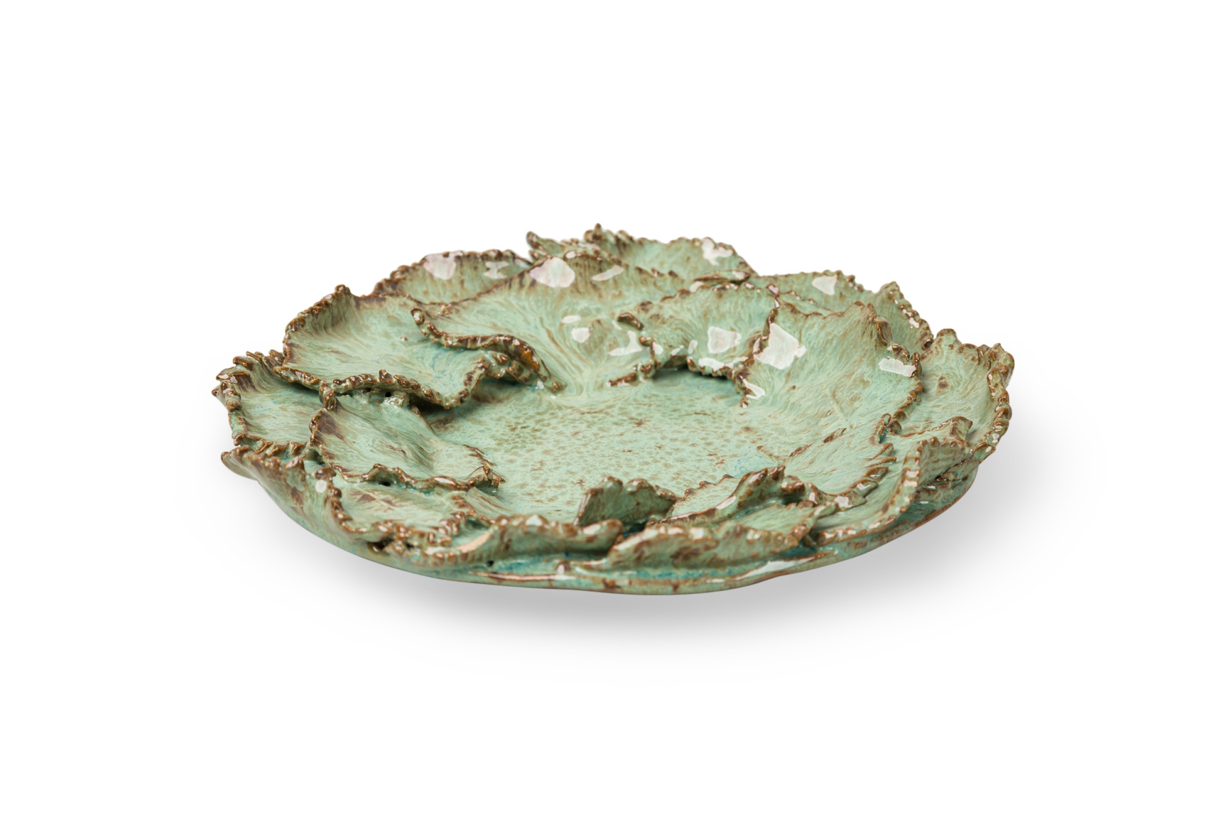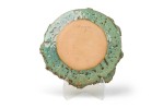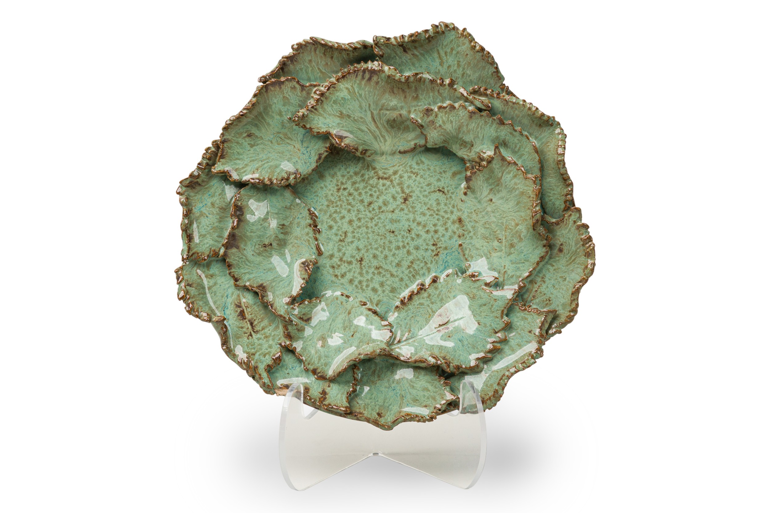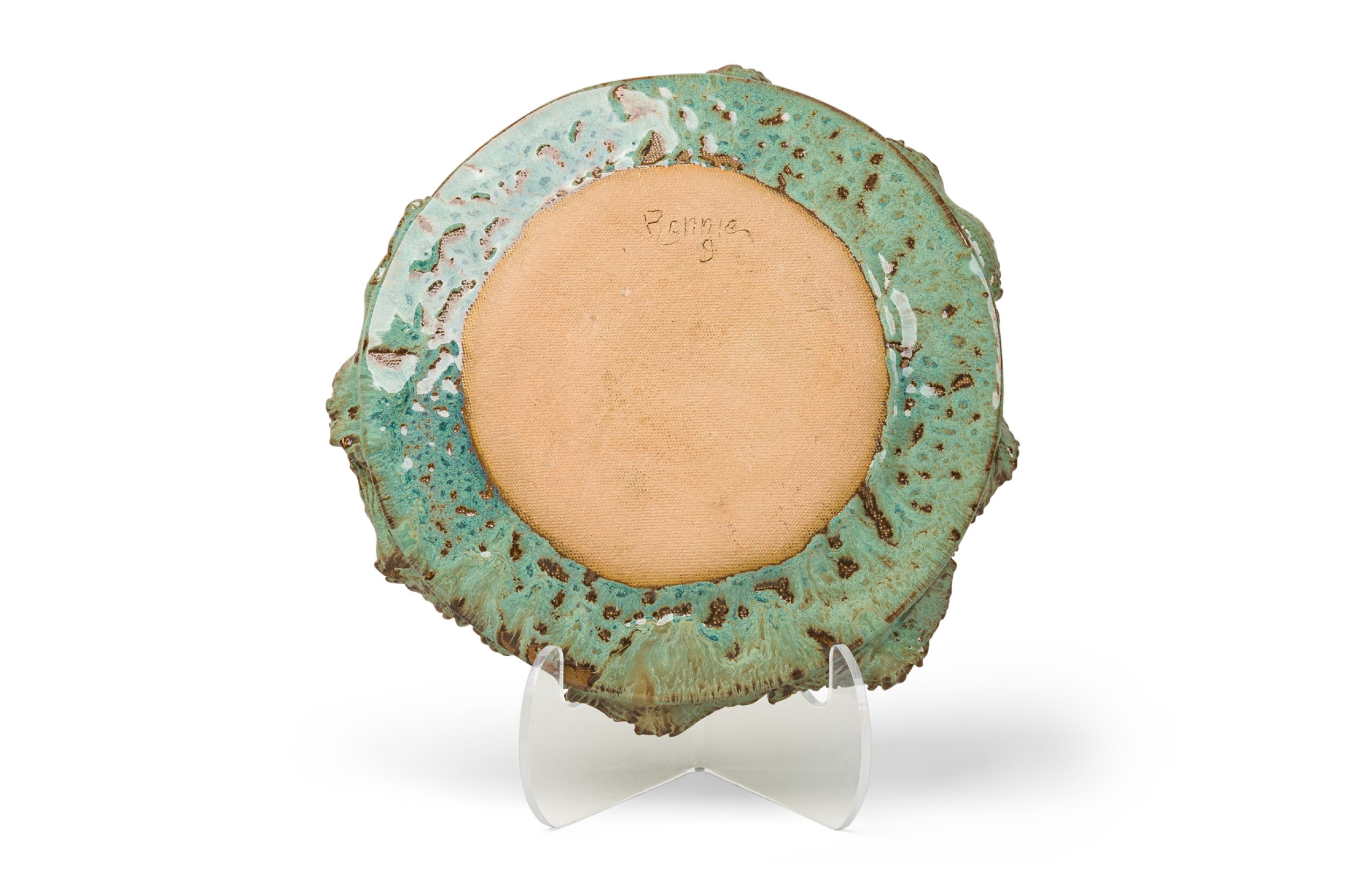 American Contemporary stoneware foliated teal plate with brown edges (signed on back).