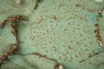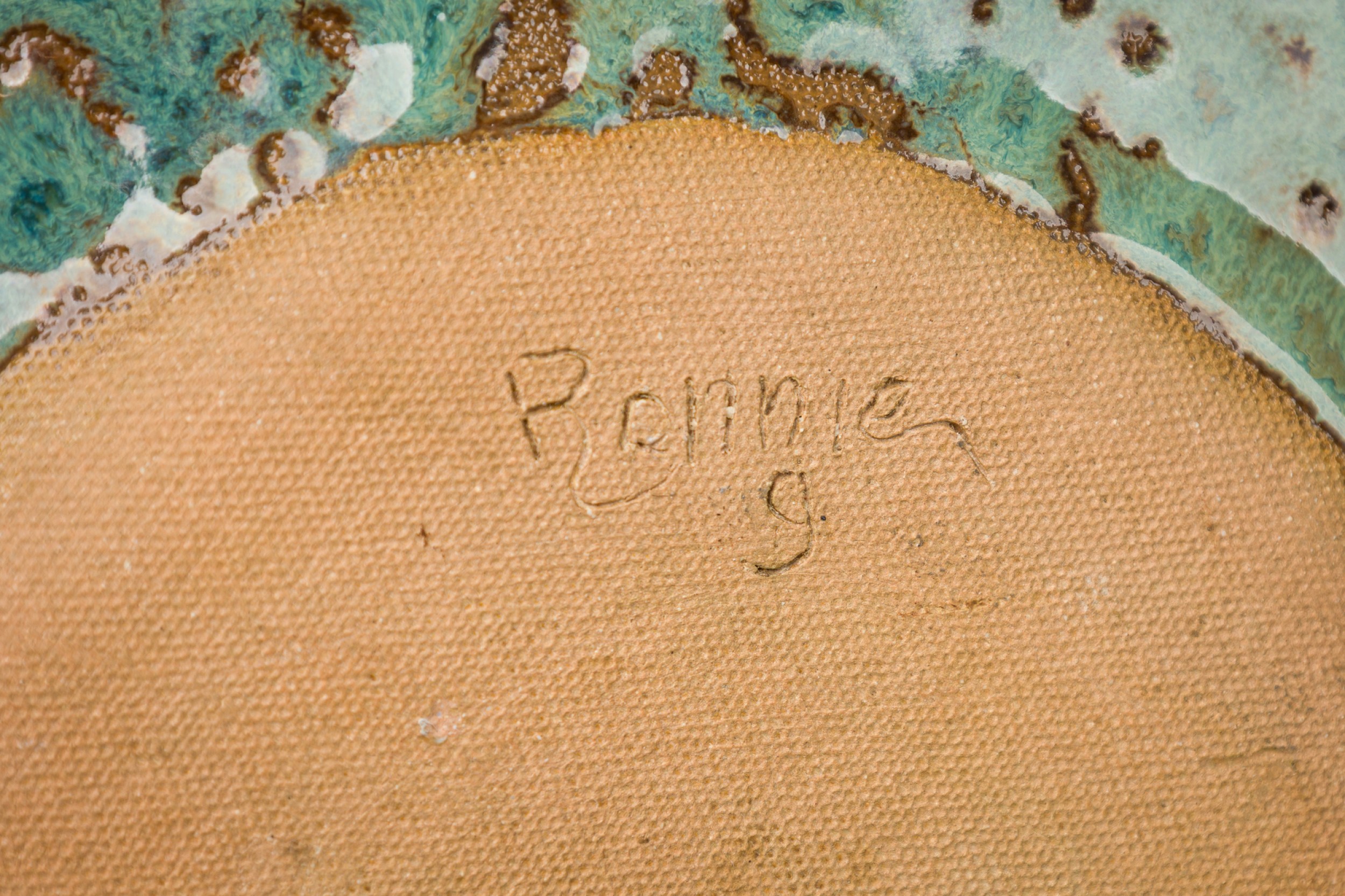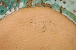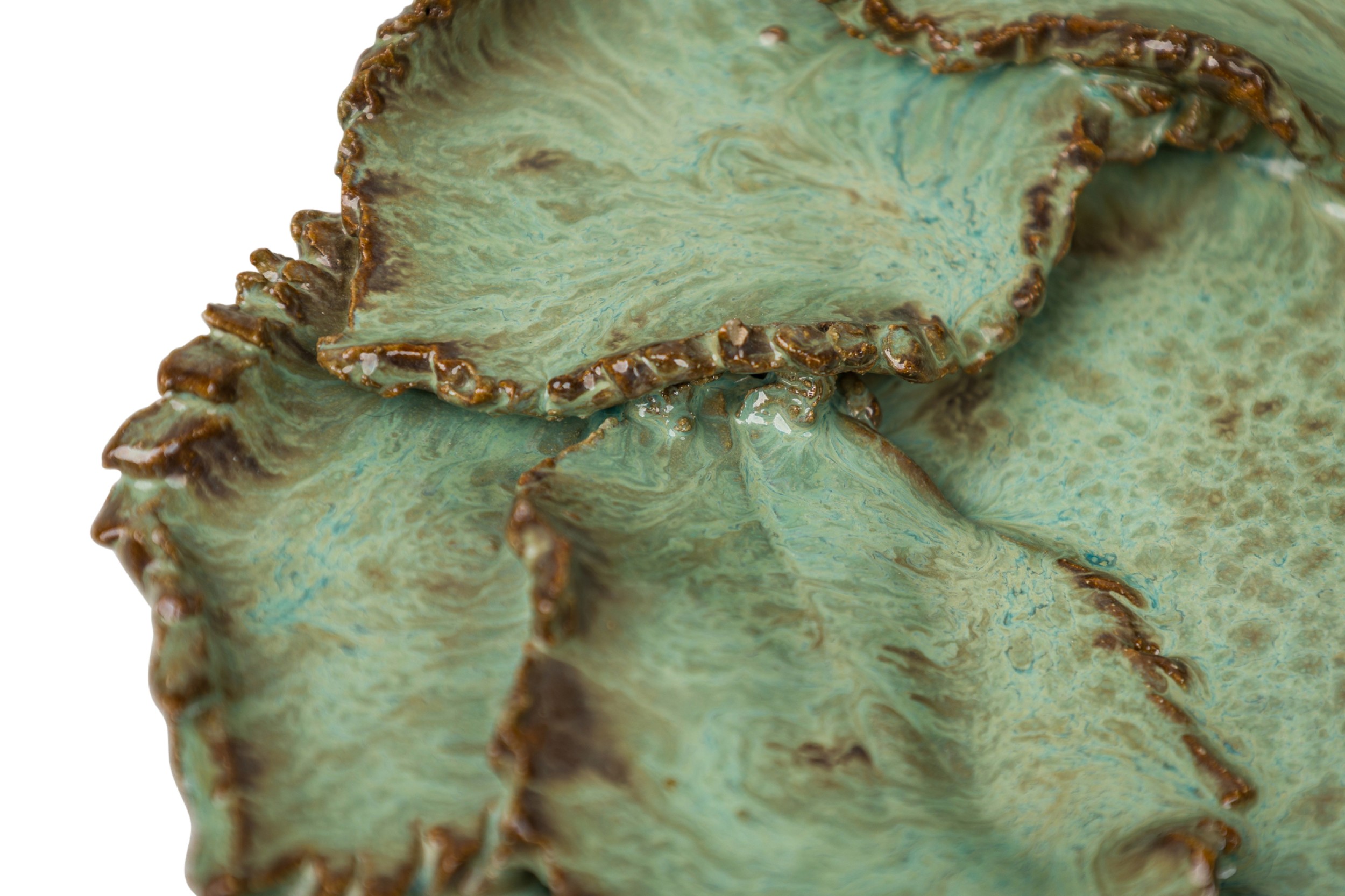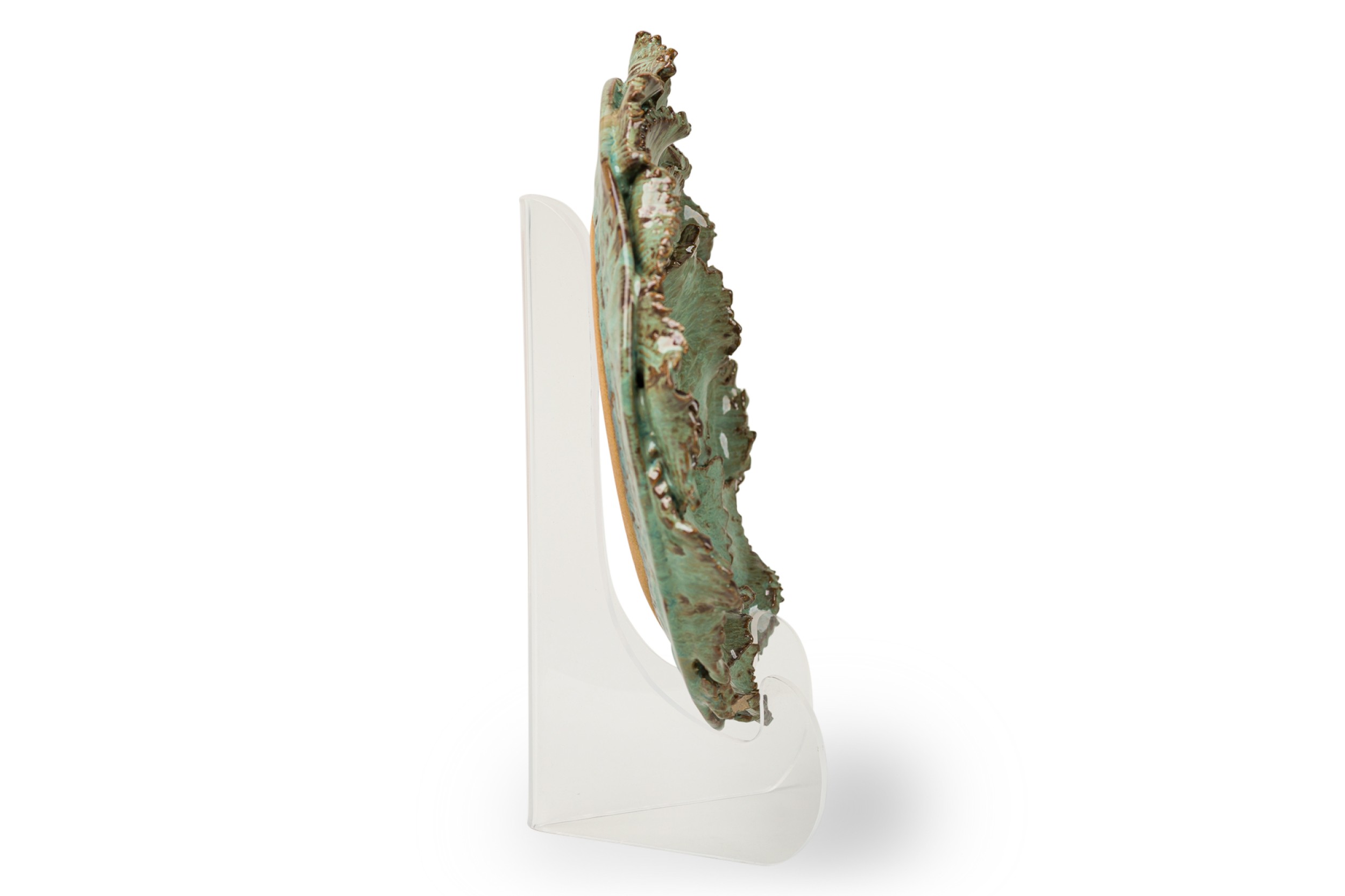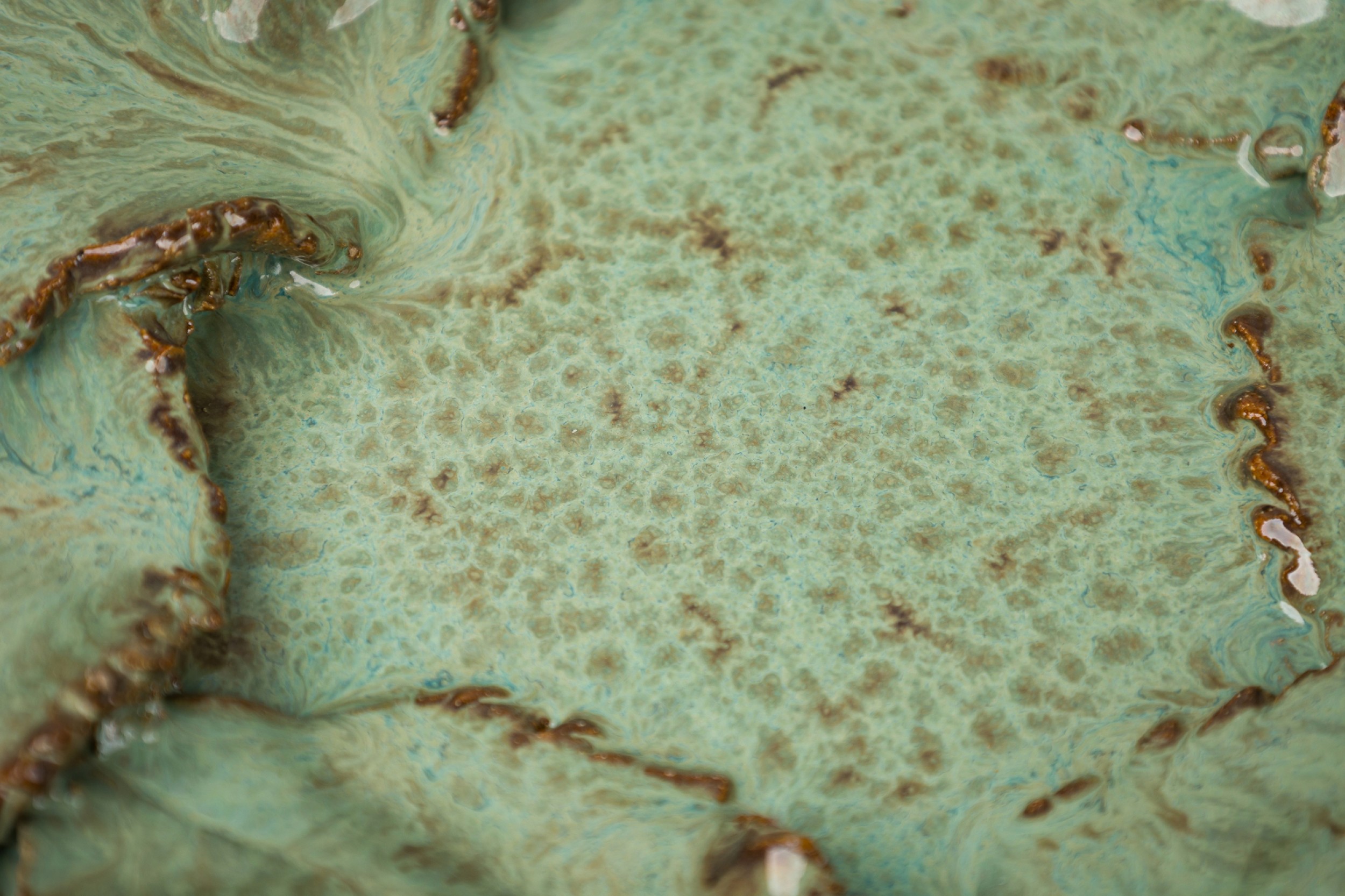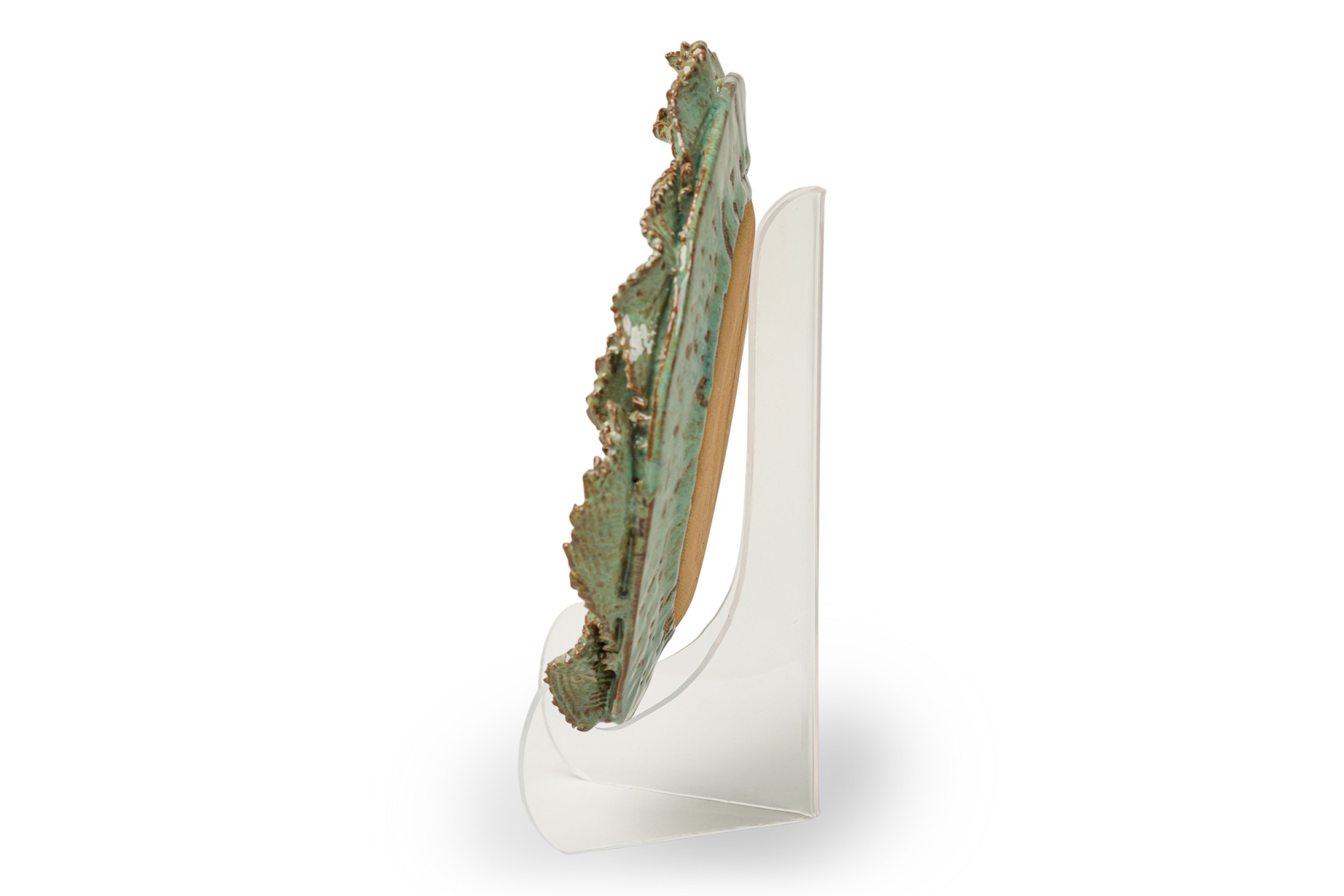 American Contemporary stoneware foliated teal plate with brown edges (signed on back).