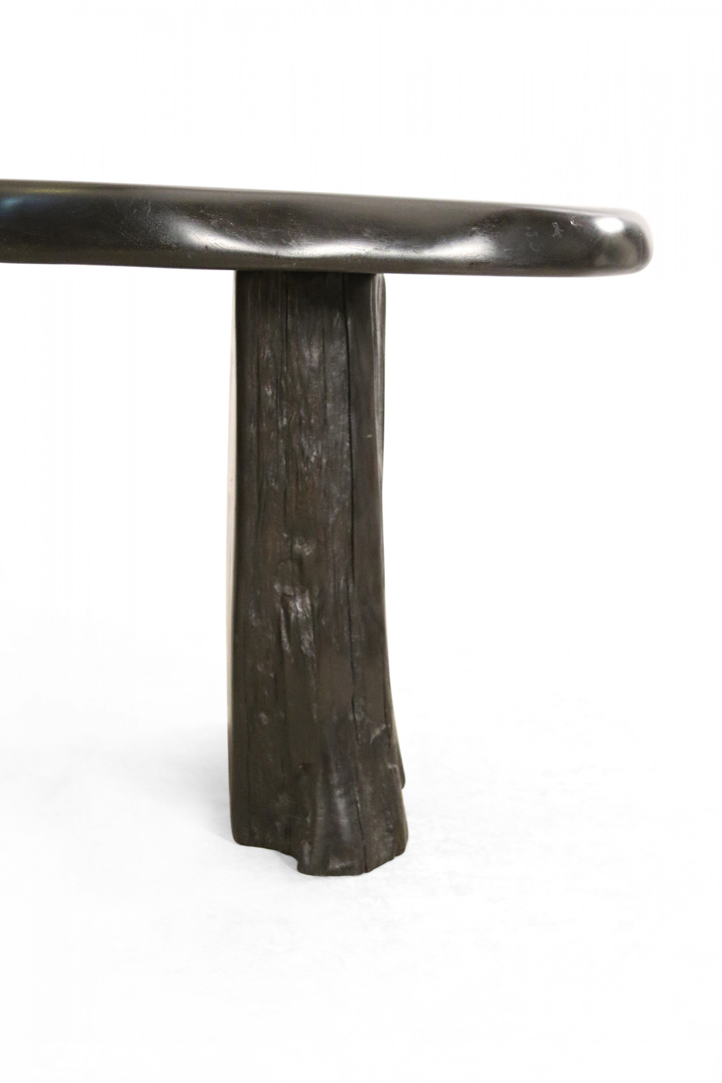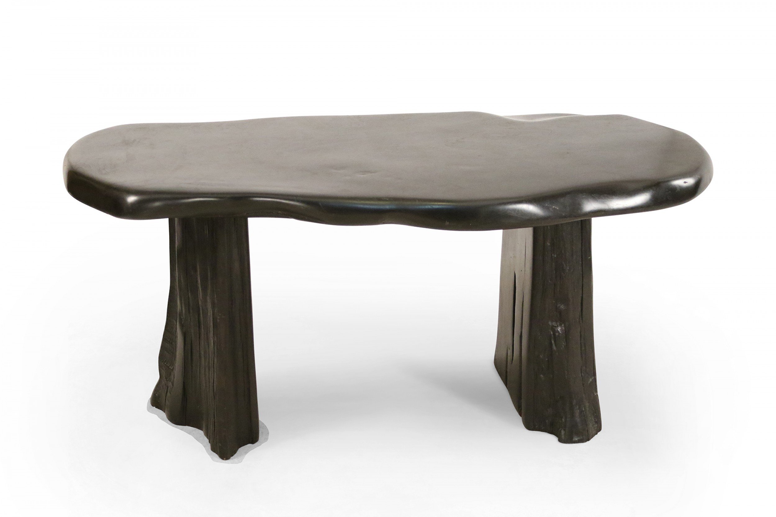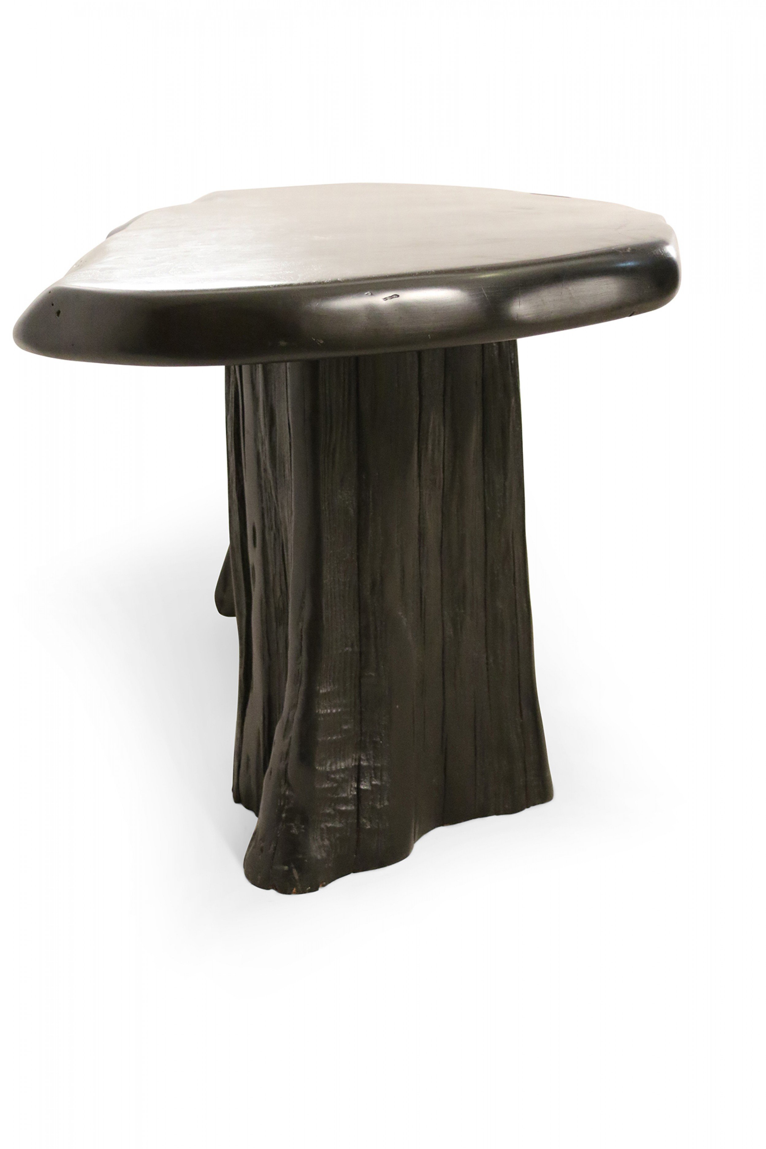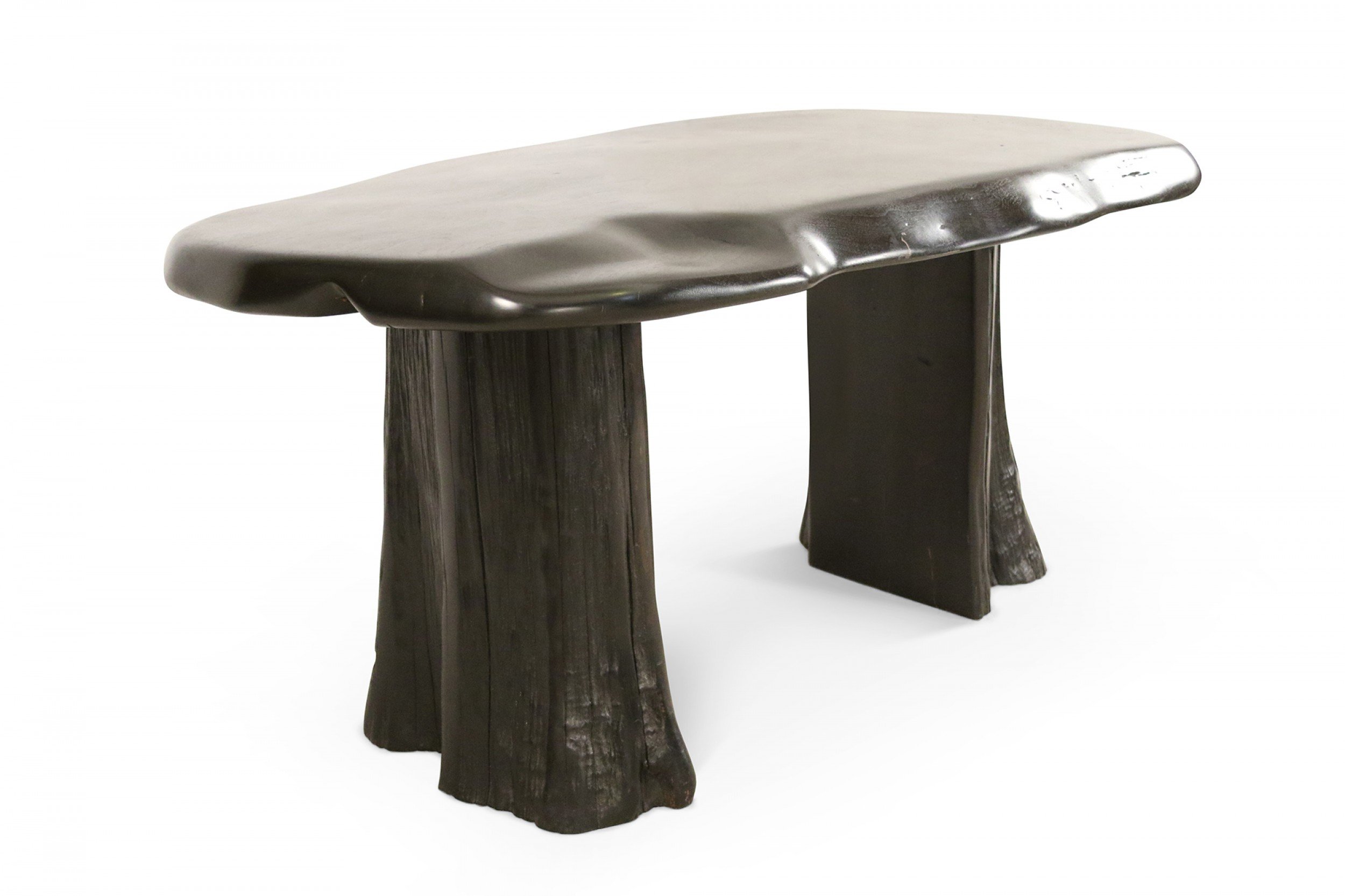 1950 black painted desk / console table with an irregularly shaped table top on two carved legs with a tree trunk design. (originally purchased Chahan Gallery Paris)