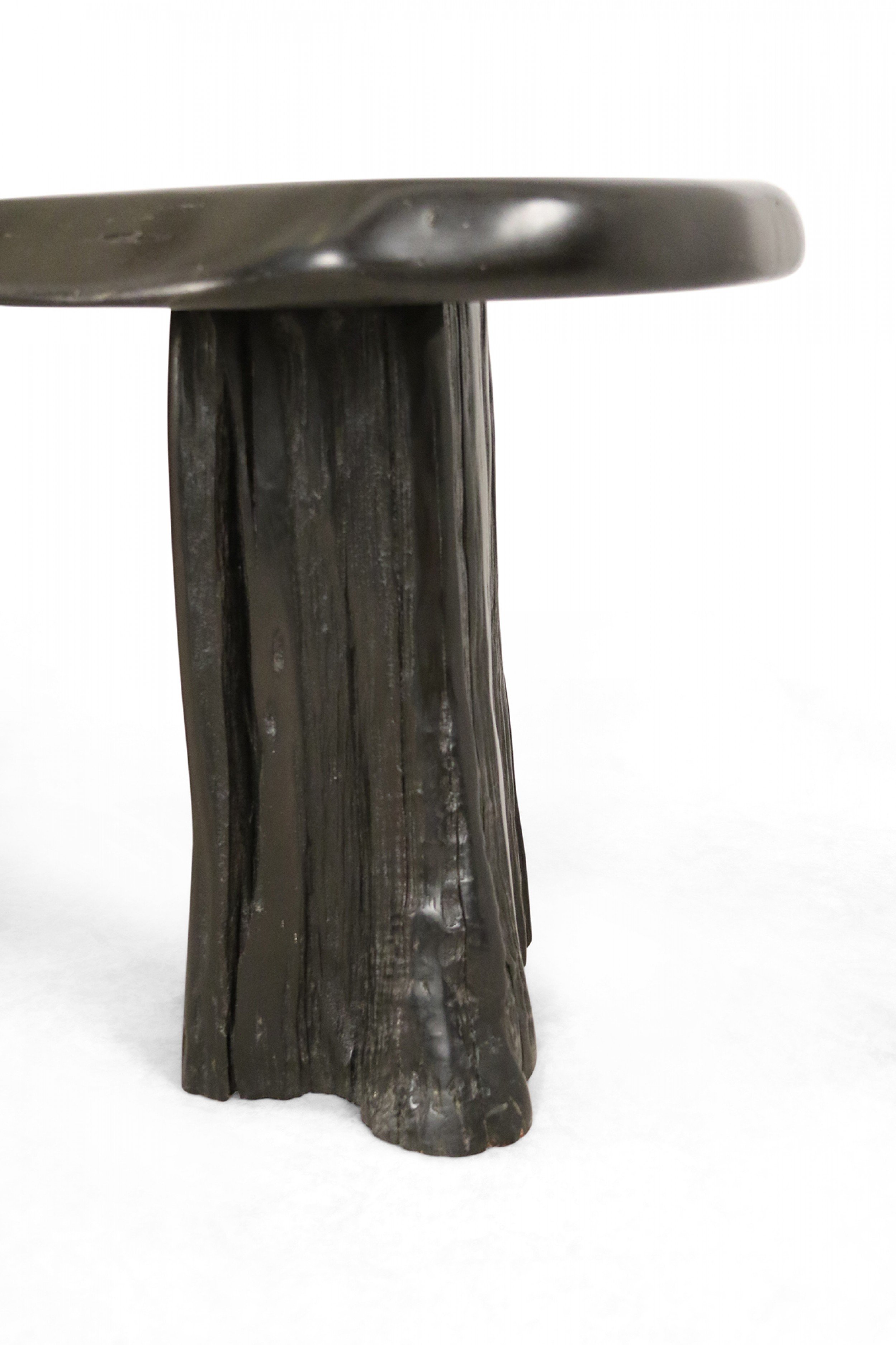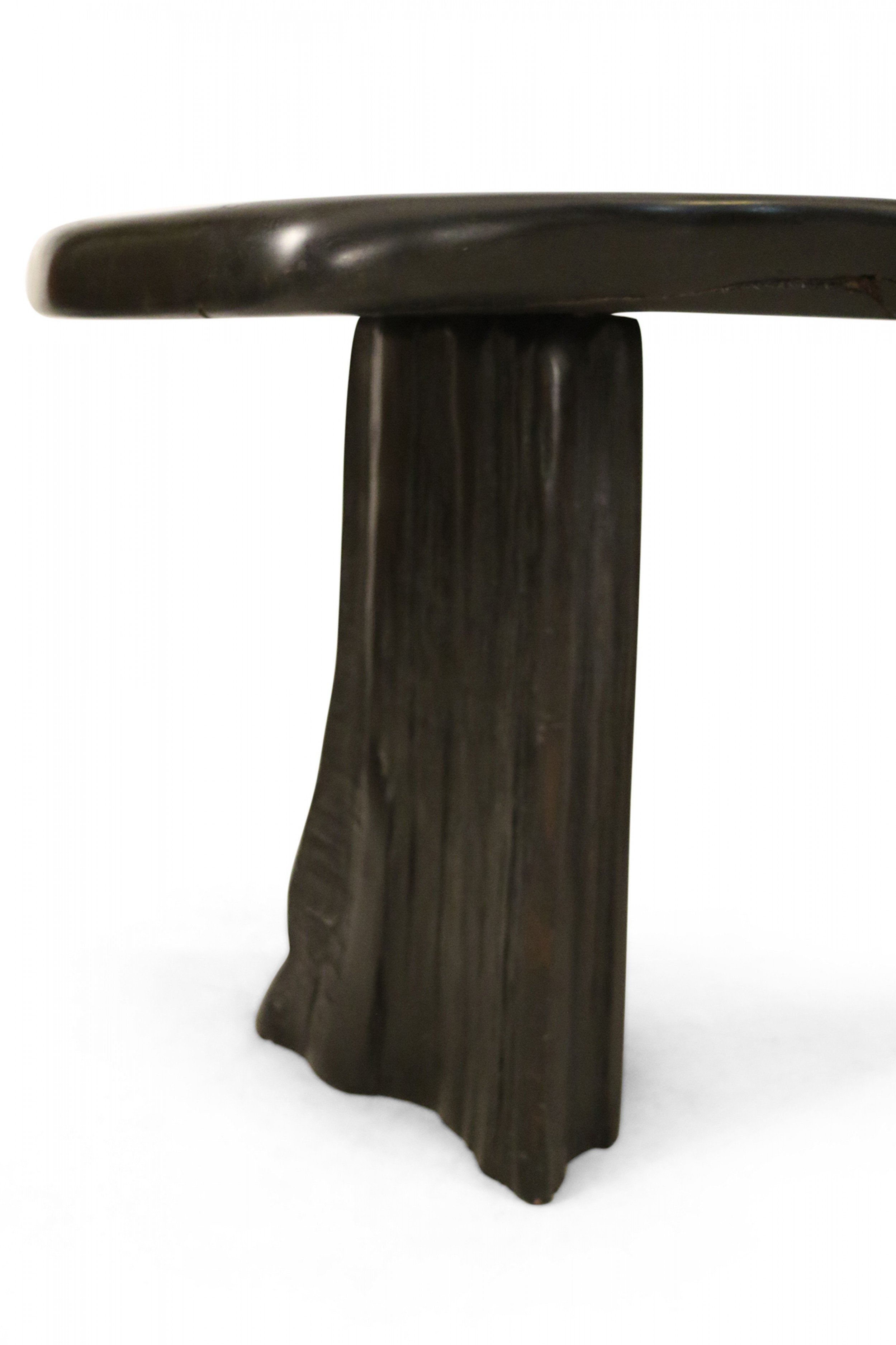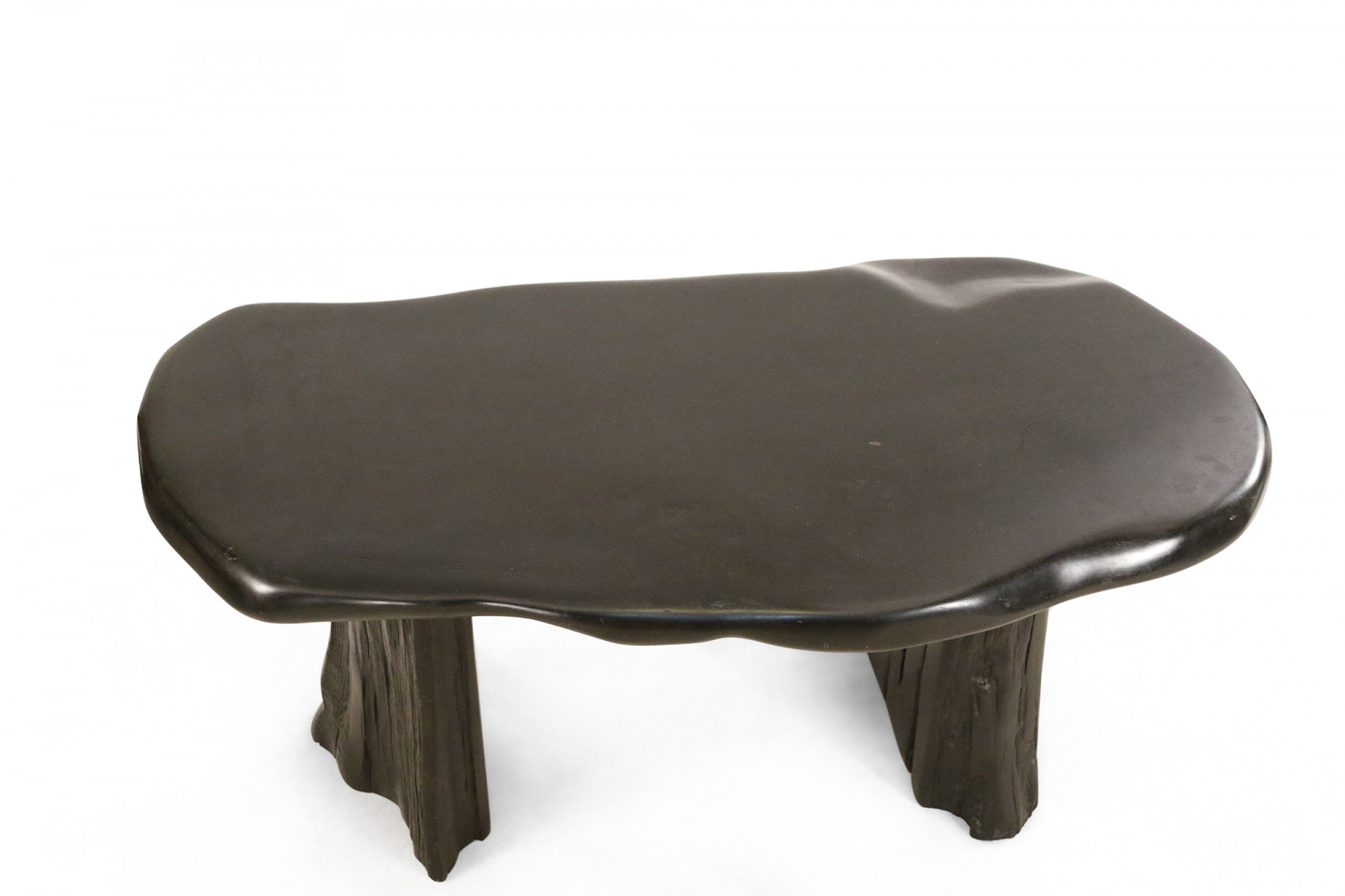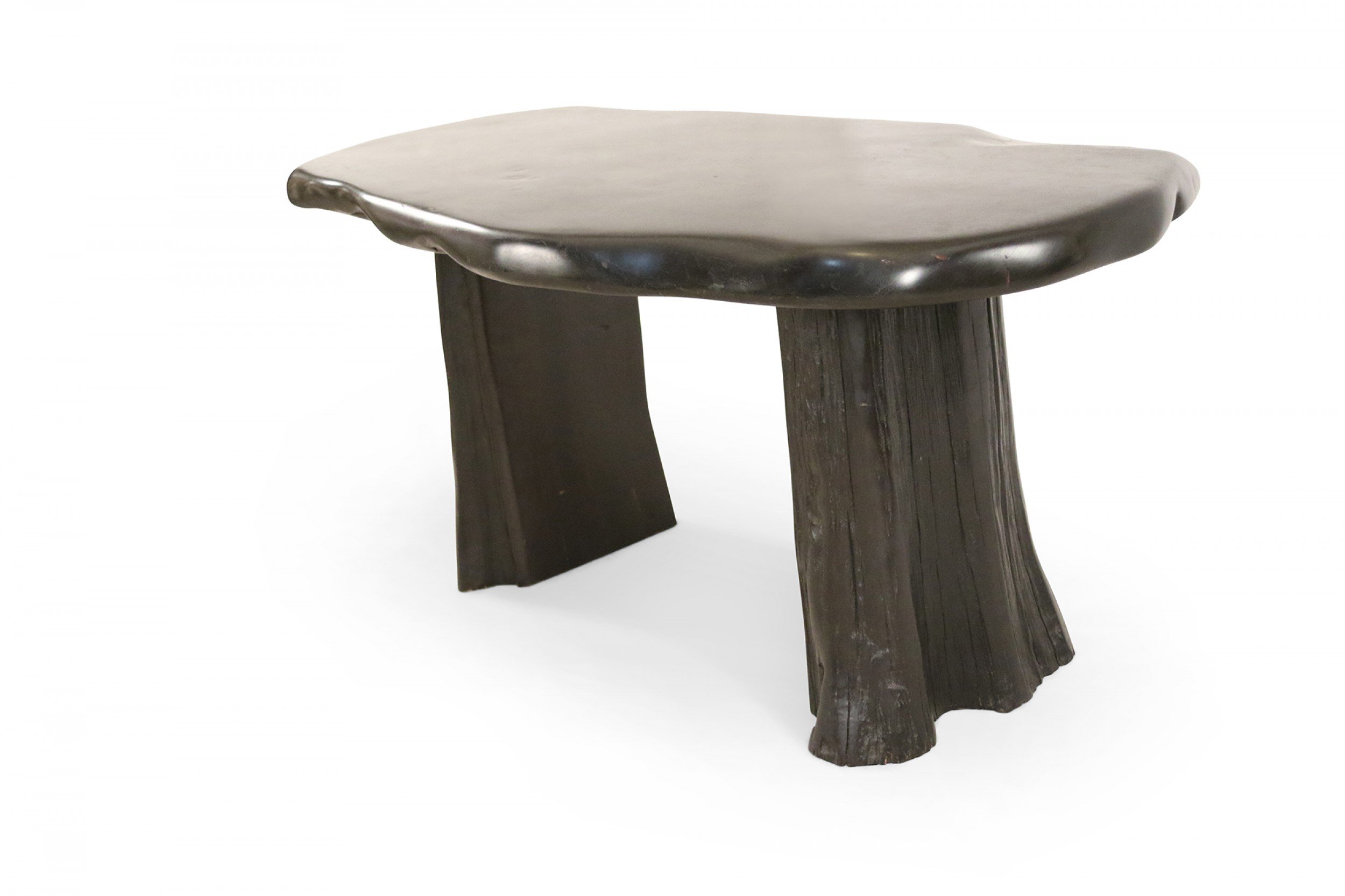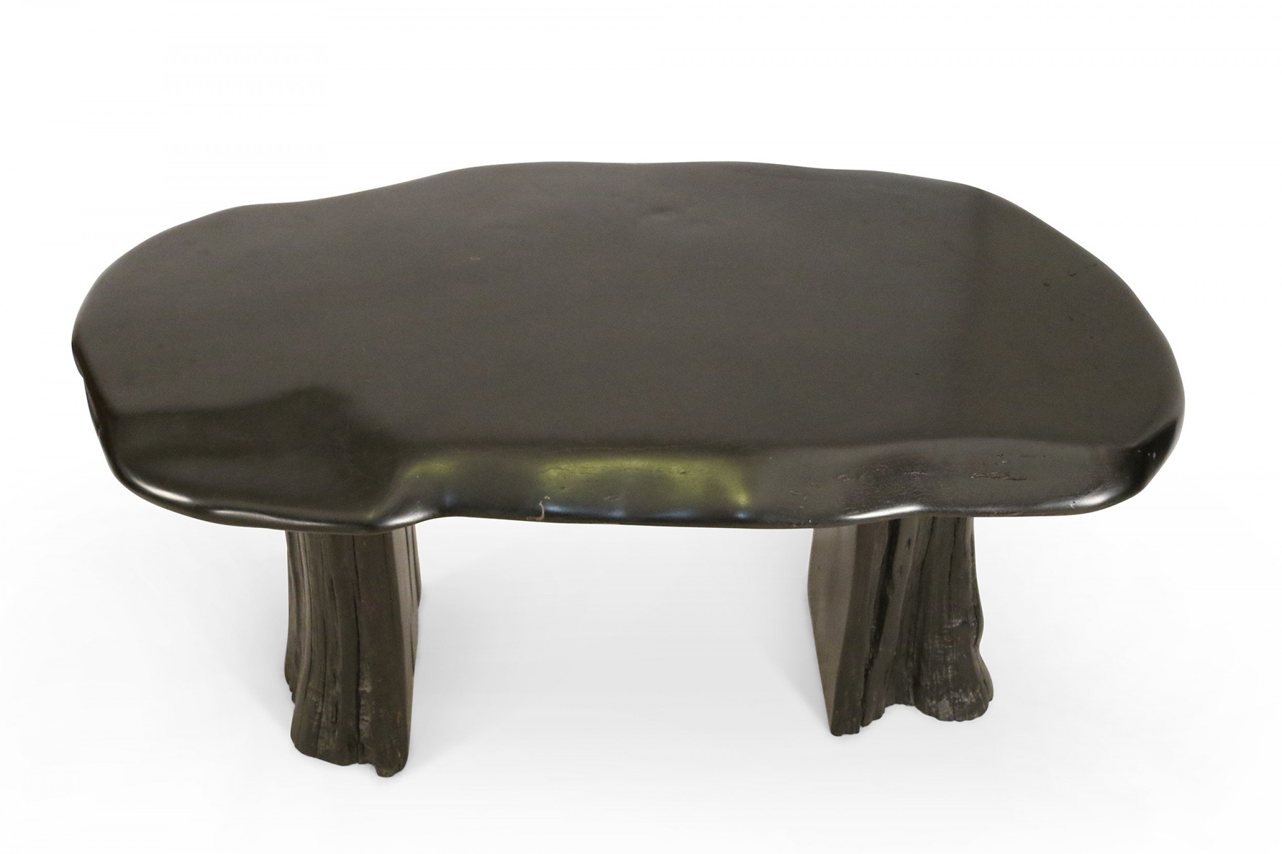 1950 black painted desk / console table with an irregularly shaped table top on two carved legs with a tree trunk design. (originally purchased Chahan Gallery Paris)