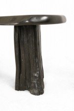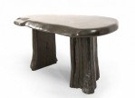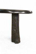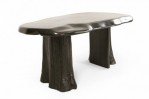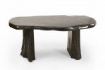 1950 black painted desk / console table with an irregularly shaped table top on two carved legs with a tree trunk design. (originally purchased Chahan Gallery Paris).