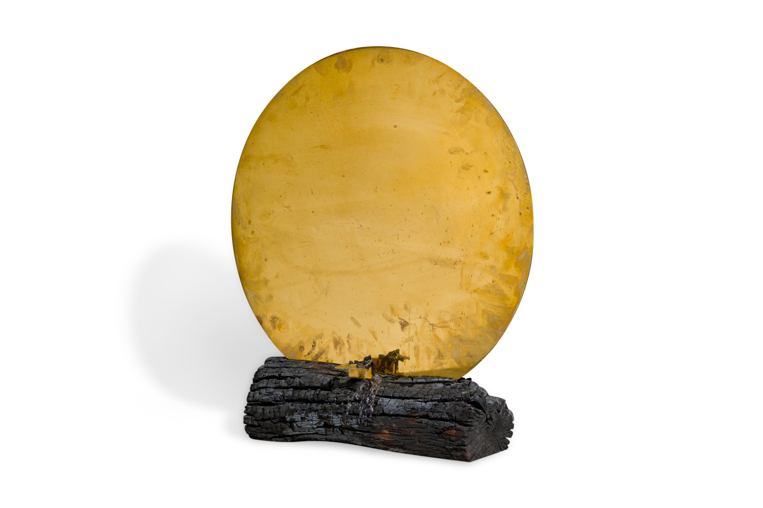 Contemporary candle holder with a burned plum wood base featuring a brass candlestick juxtaposed with a polished brass mirror (DESSISLAVA MADANSKA)