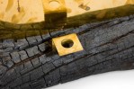 Contemporary candle holder with a burned plum wood base featuring a brass candlestick juxtaposed with a polished brass mirror (DESSISLAVA MADANSKA).