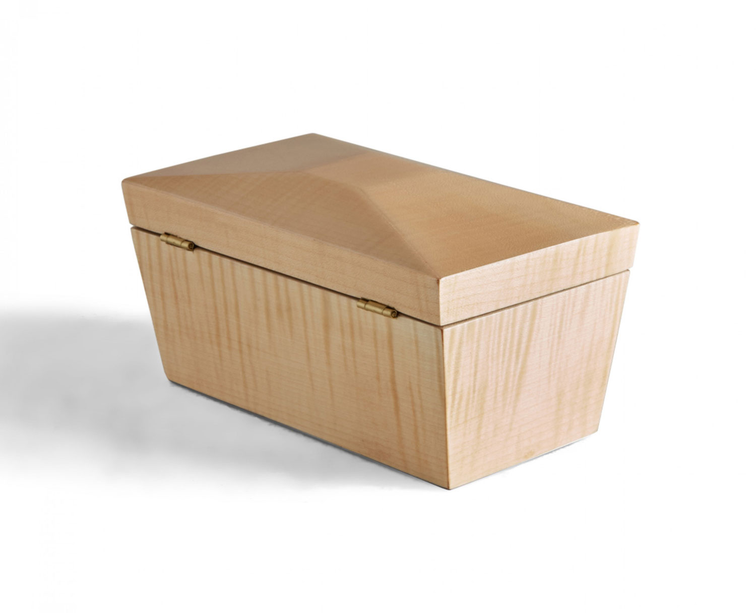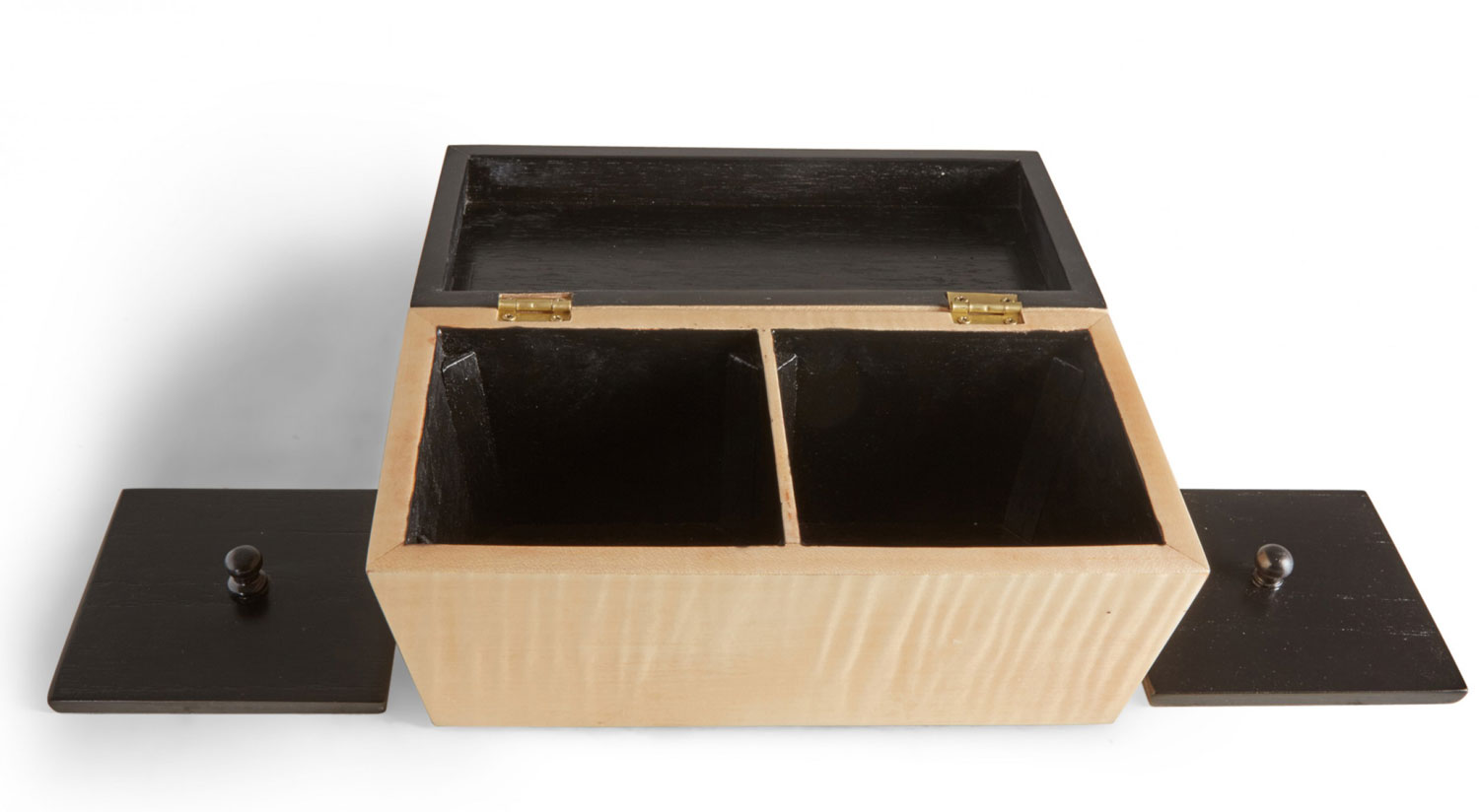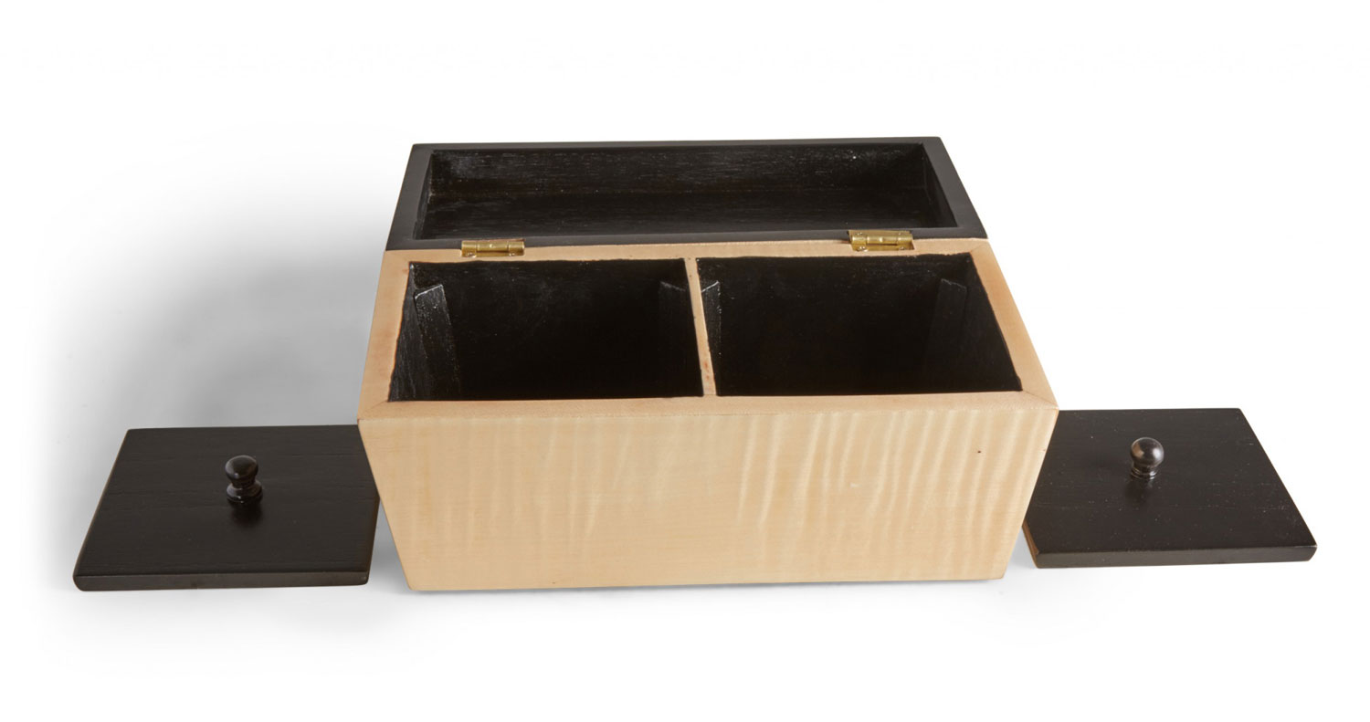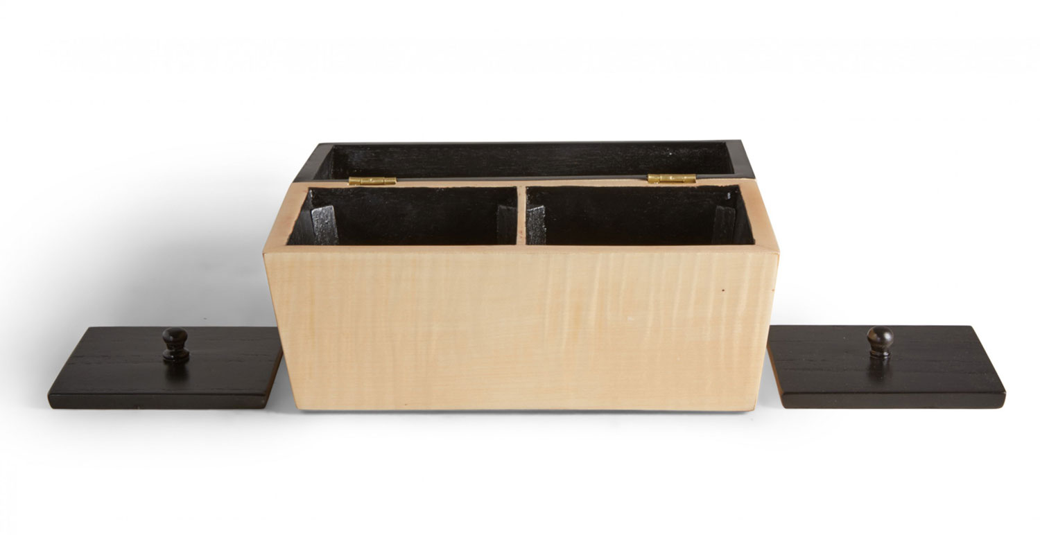 Contemporary decorative lacquered blond maple box with a rectangular profile with faceted lid and tapered sides, and a brass-hinged lid that opens to reveal two interior compartments covered with black painted wooden square lids with turned knobs. (Available in different finishes: 062882-062887)