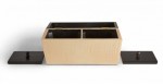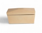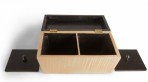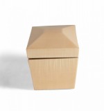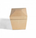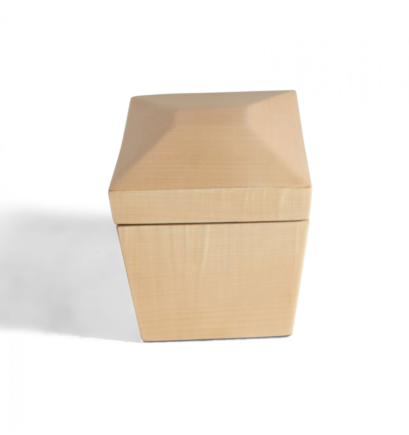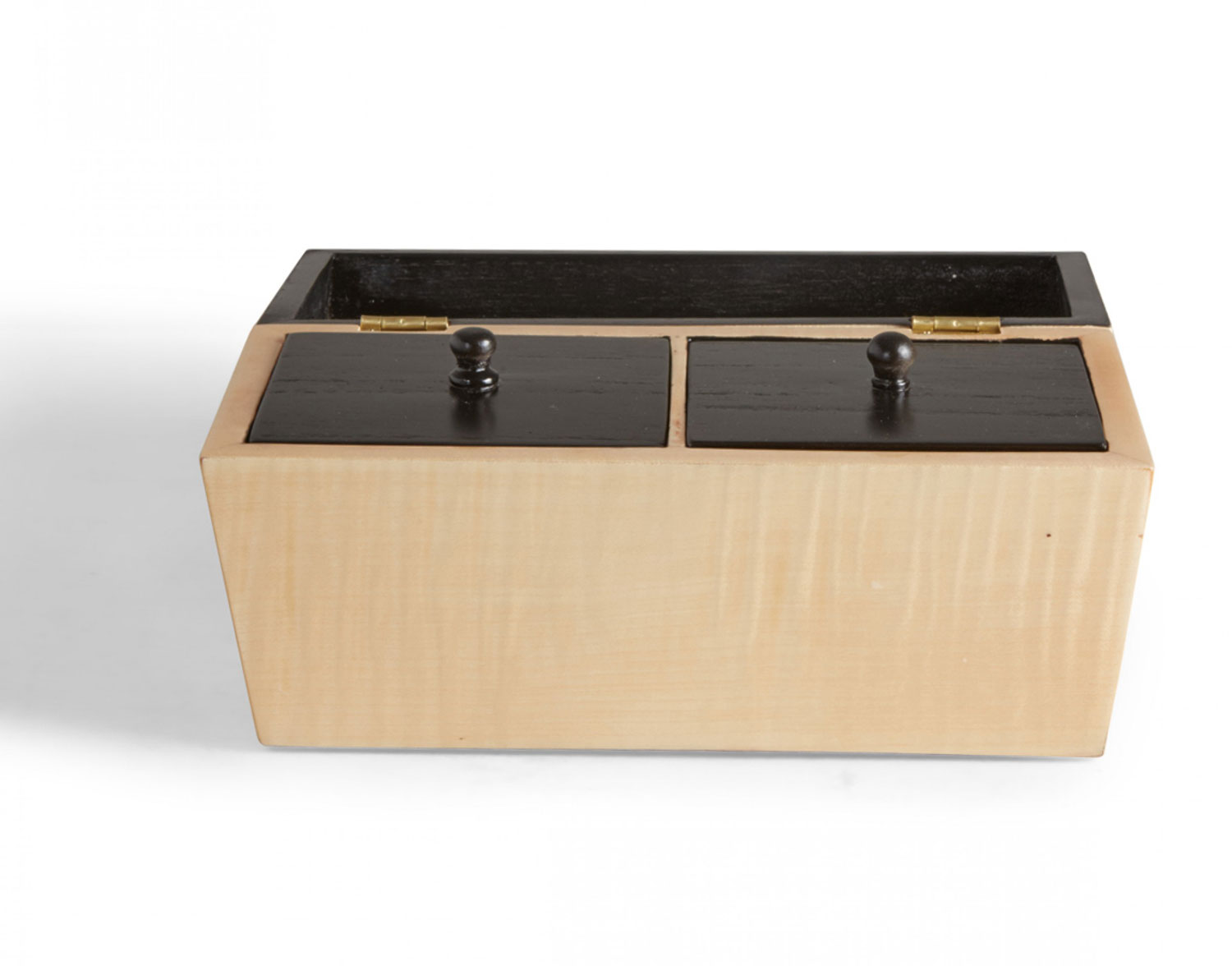 Contemporary decorative lacquered blond maple box with a rectangular profile with faceted lid and tapered sides, and a brass-hinged lid that opens to reveal two interior compartments covered with black painted wooden square lids with turned knobs. (Available in different finishes: 062882-062887).