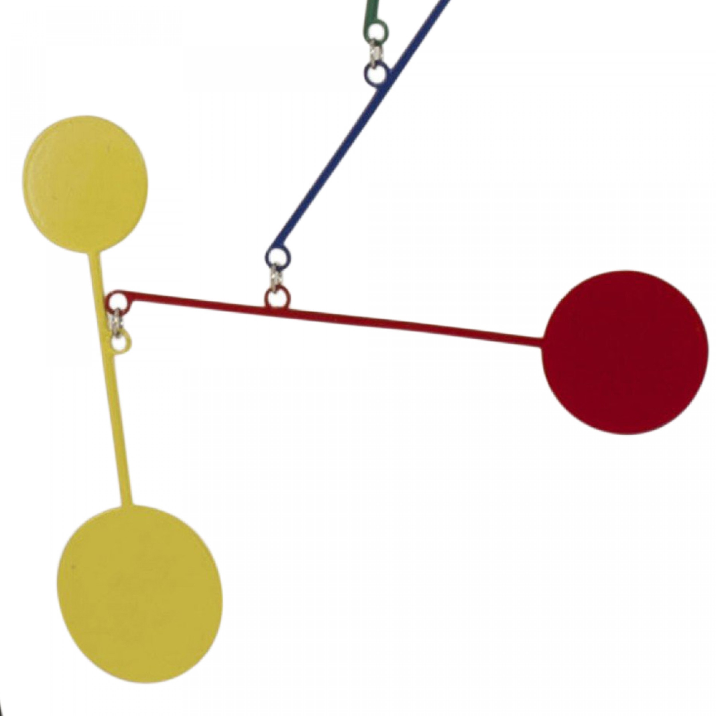Contemporary metal table sculpture of standing circles in red, yellow, green, and blue balanced with a large white circle on a black triangular shaped base.