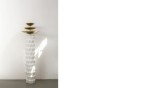 Contemporary floor lamp with circular column made with staggered white terracotta geometric blocks raising a three tiered graduated organically shaped brass canopies (ROOMS)