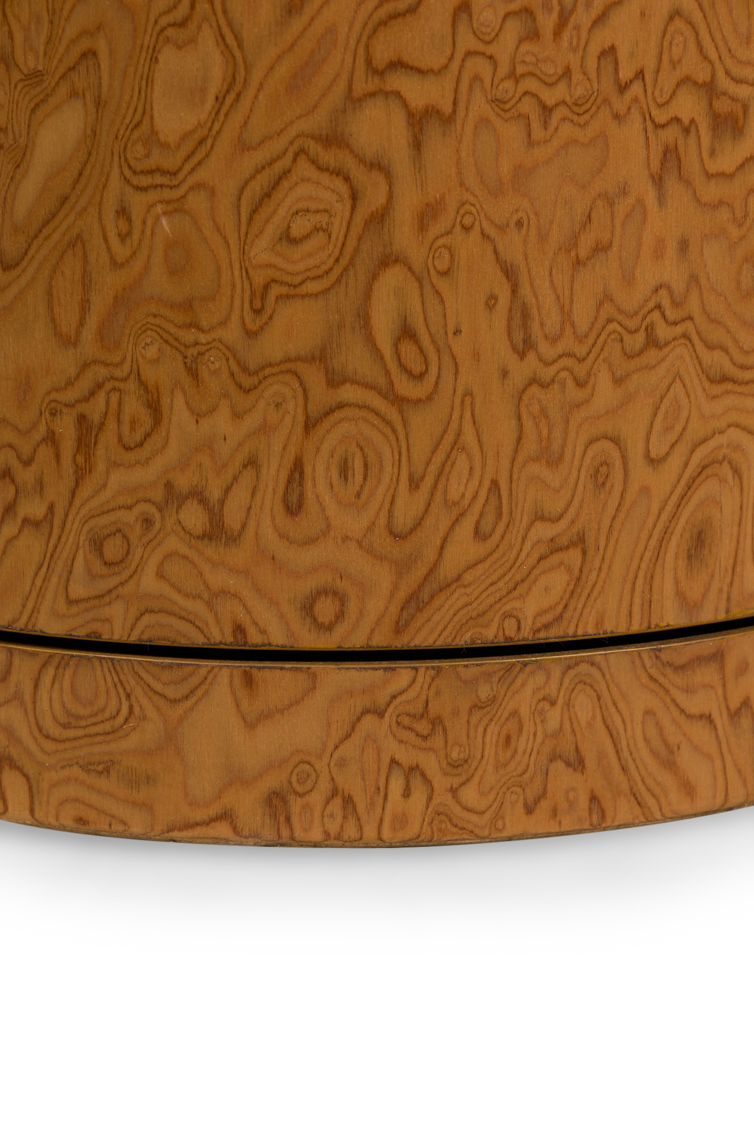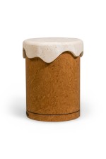 Contemporary side table featuring a travertine top shaped like a melted snowcap over a burl veneer base (MARBLE BALLOON)