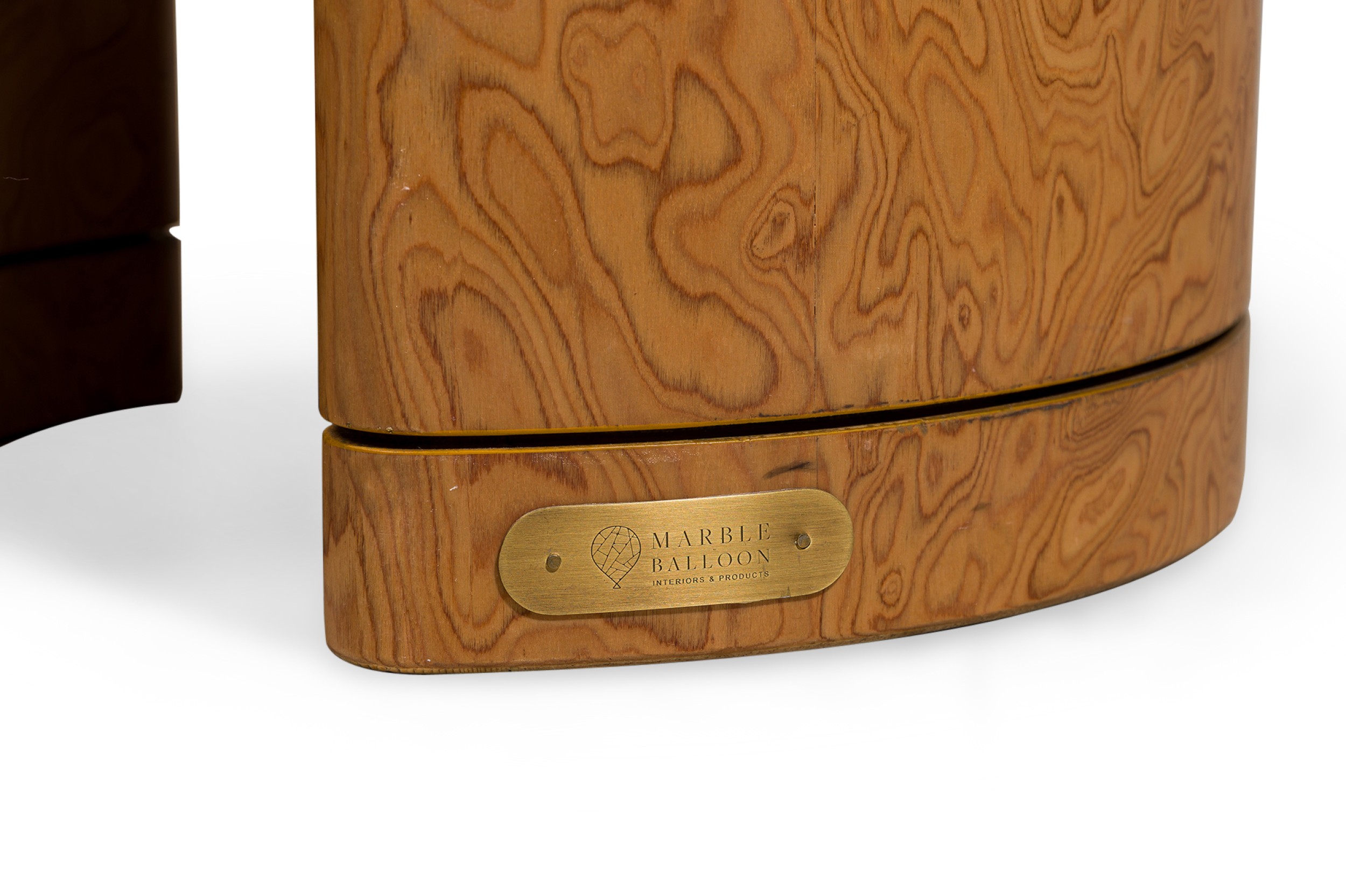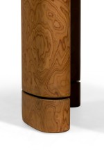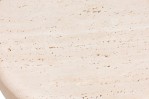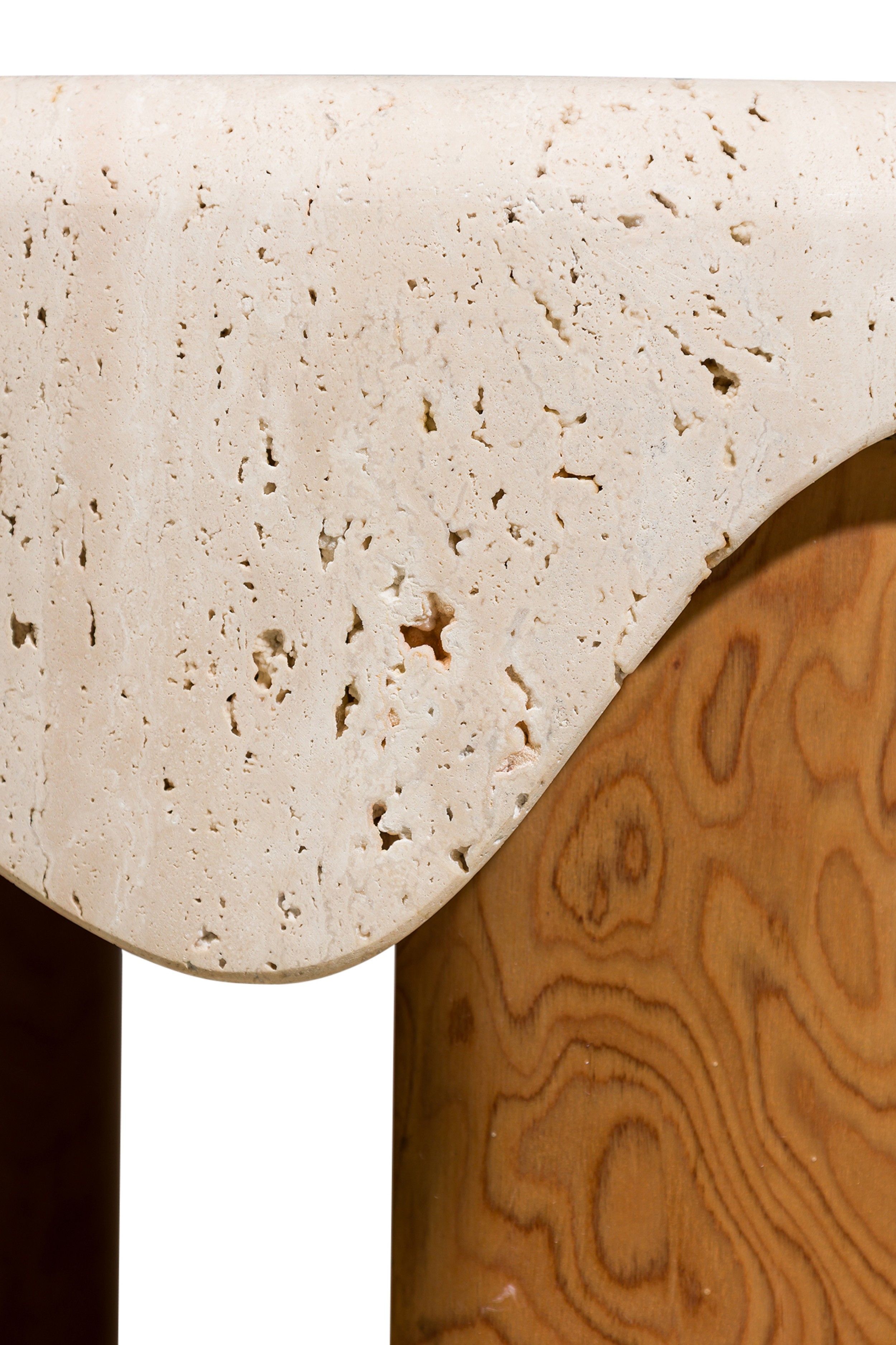 Contemporary side table featuring a travertine top shaped like a melted snowcap over a burl veneer base (MARBLE BALLOON).