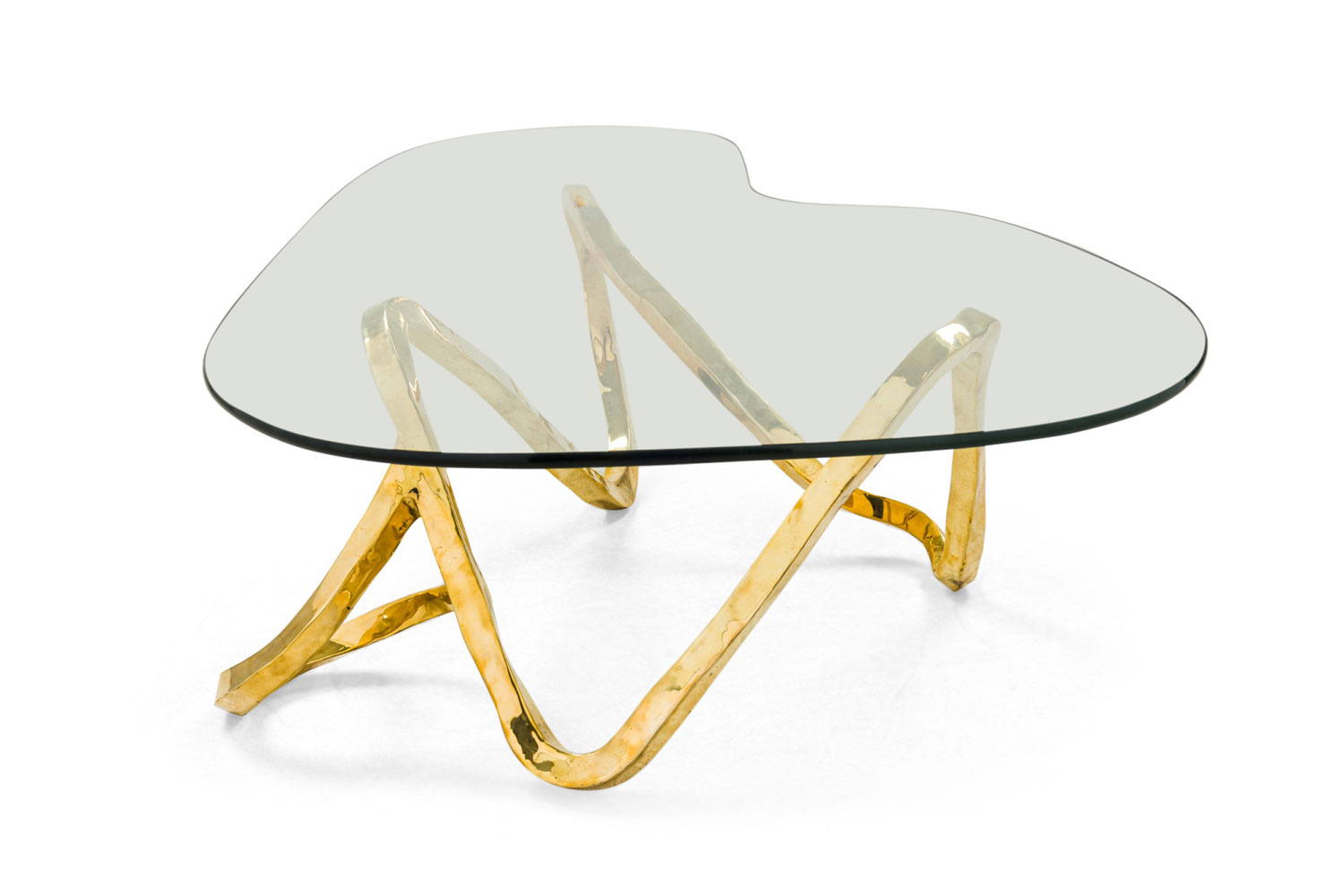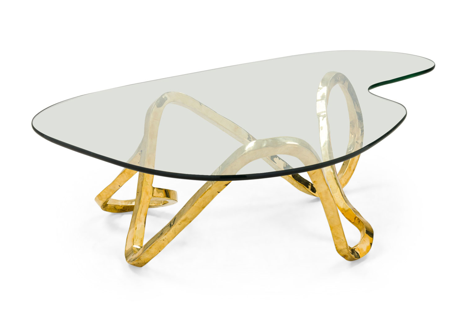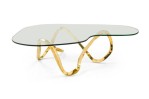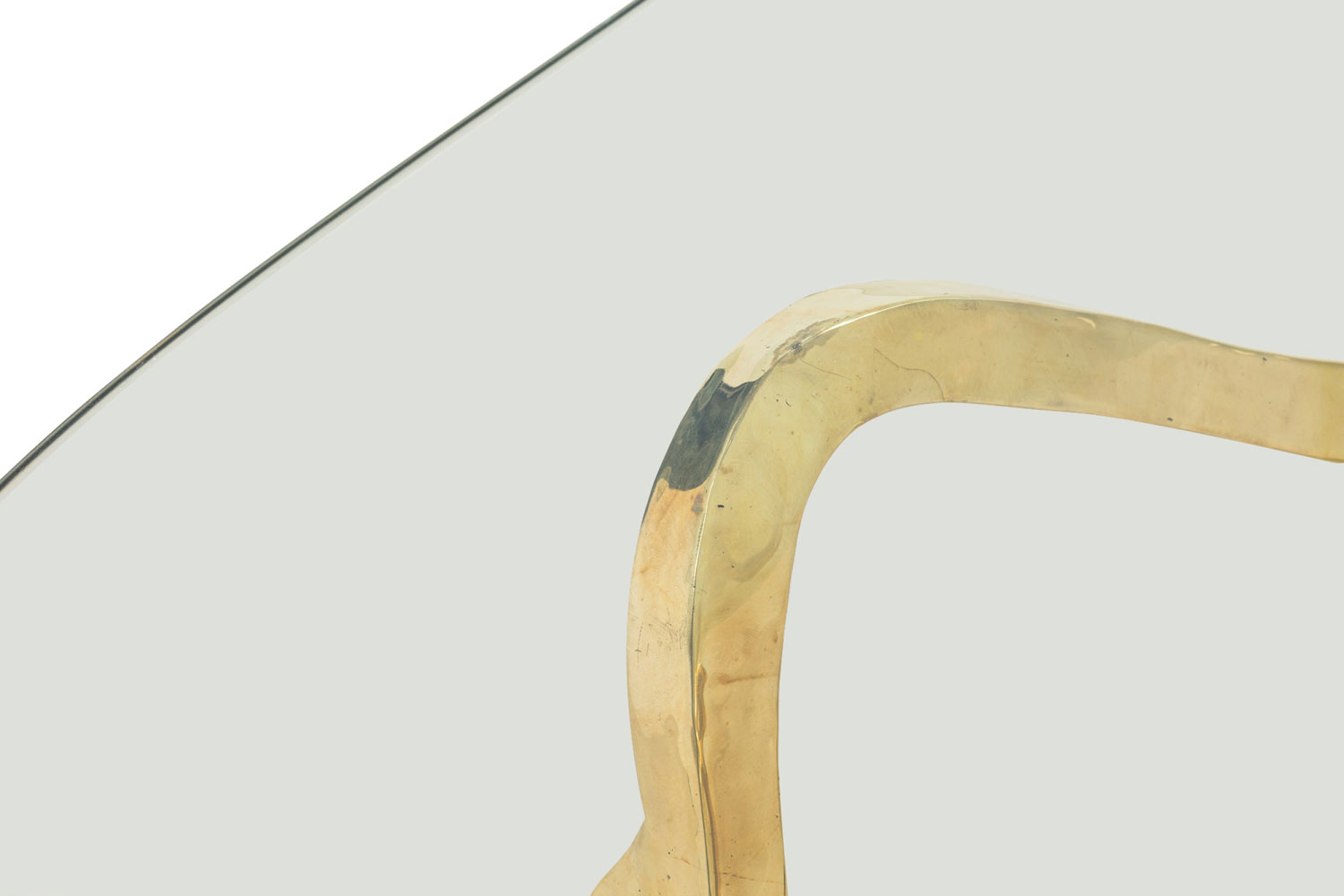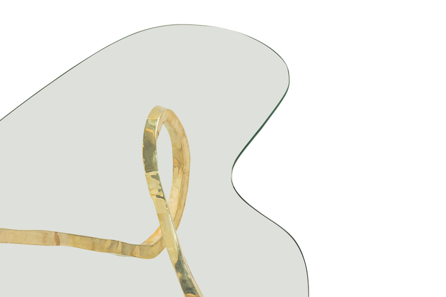 3 Contemporary / Modern "Porto" biomorphic coffee tables with looping abstract bases constructed from polished bronze supporting an organic form clear glass table top. (PRICED EACH).