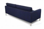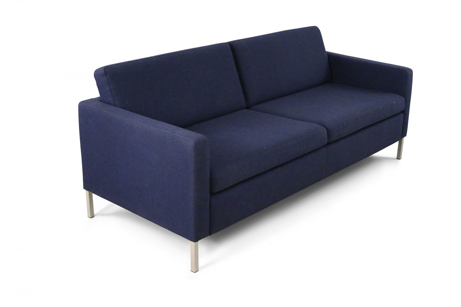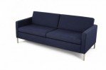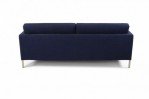 Contemporary 3-seat sofa with navy blue upholstery, silver metal legs, and two removable seat and back cushions.