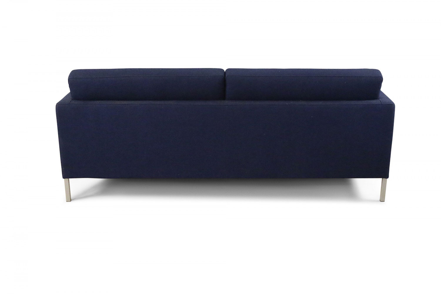 Contemporary 3-seat sofa with navy blue upholstery, silver metal legs, and two removable seat and back cushions..