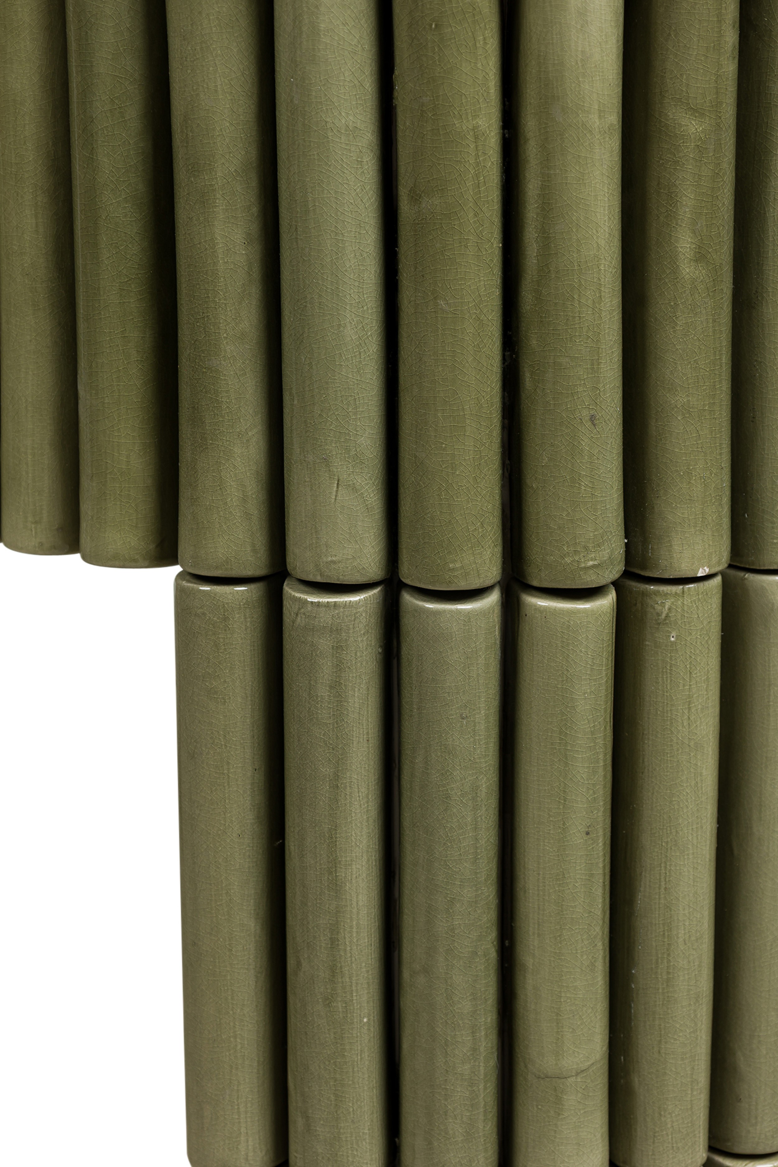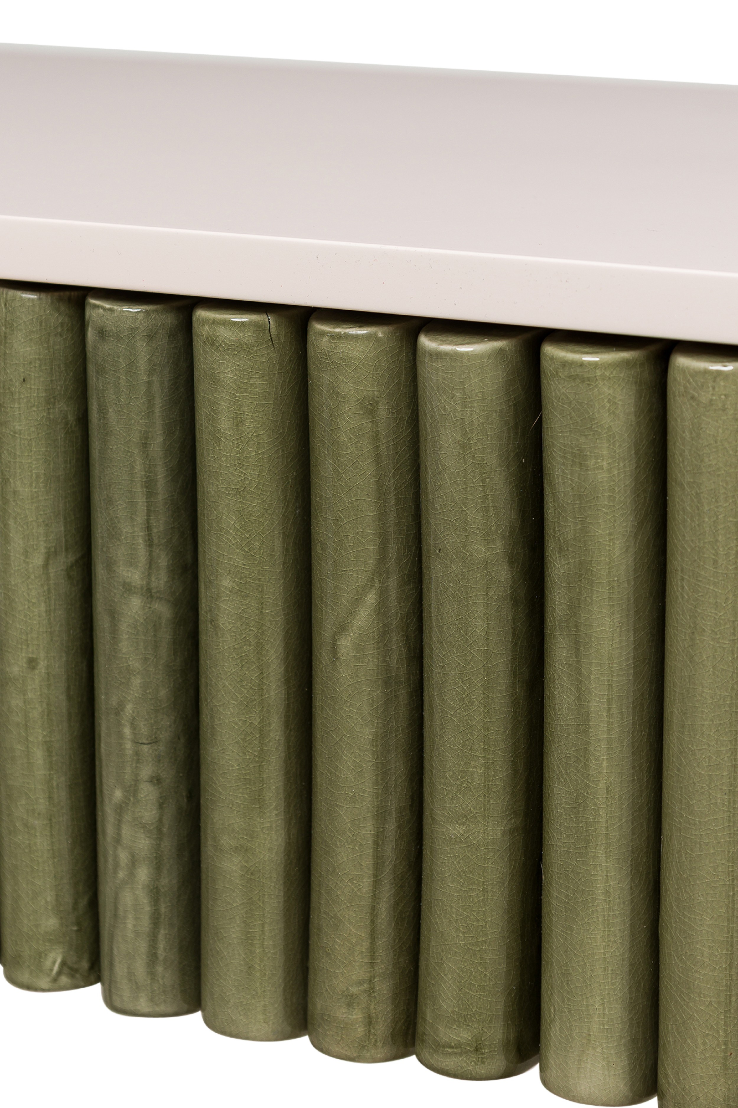 "Contemporary console featuring a lacquered top and the body ornamented with round ceramic handmade pieces, painted in a unique craquele glaze (DOOQ) This piece is represented by PHILIA and offered in partnership with Newel