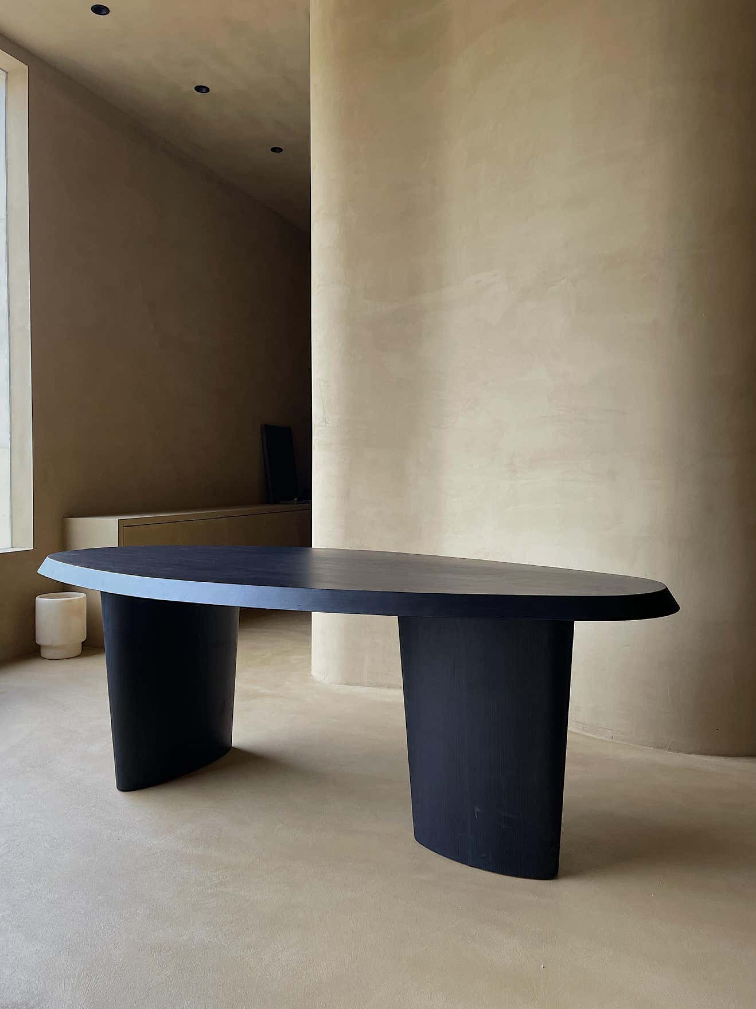 Contemporary oval MDF dining table with an elliptical top supported by two supporting legs (KAR STUDIO).