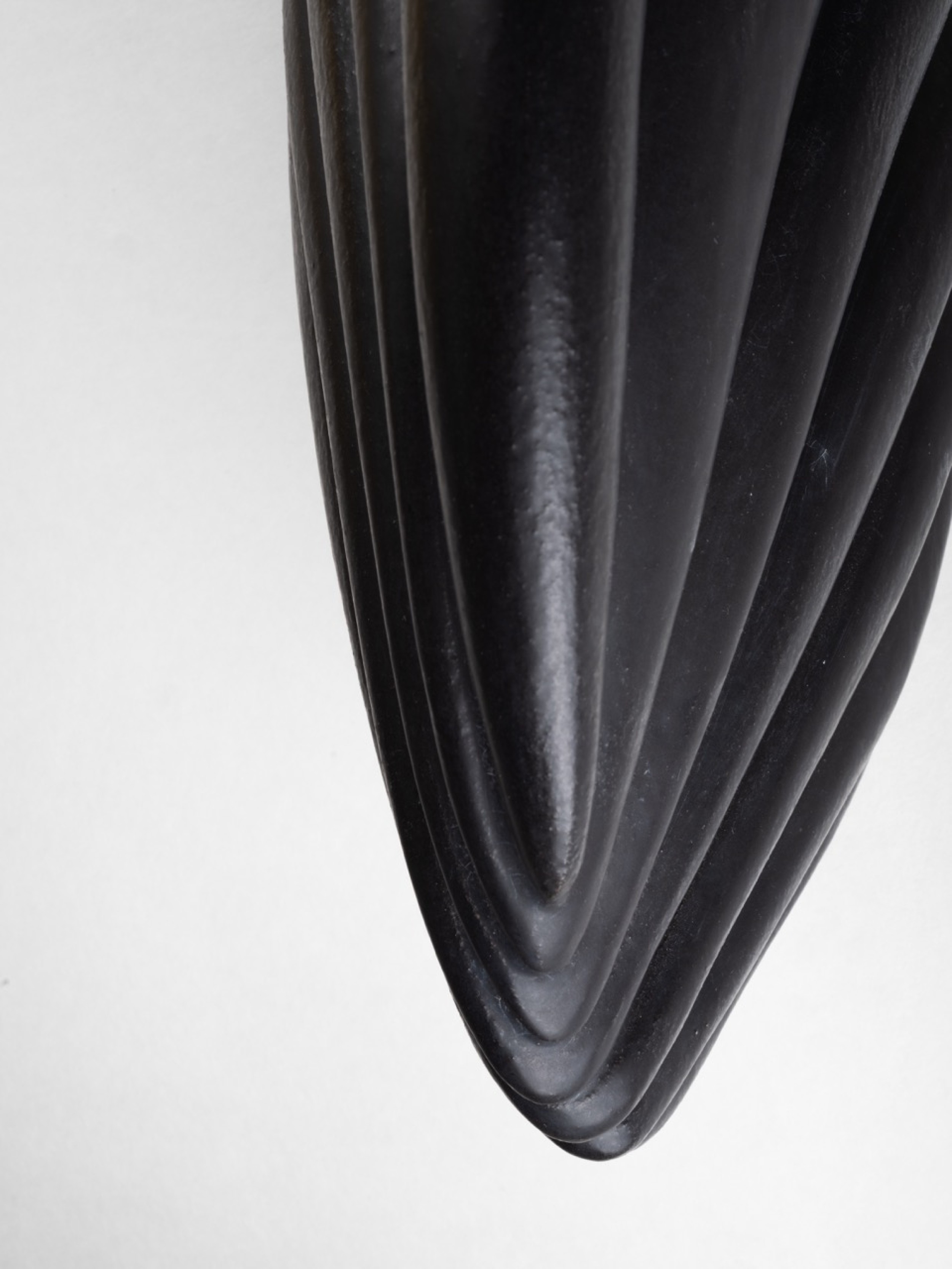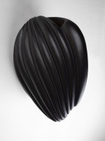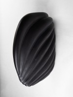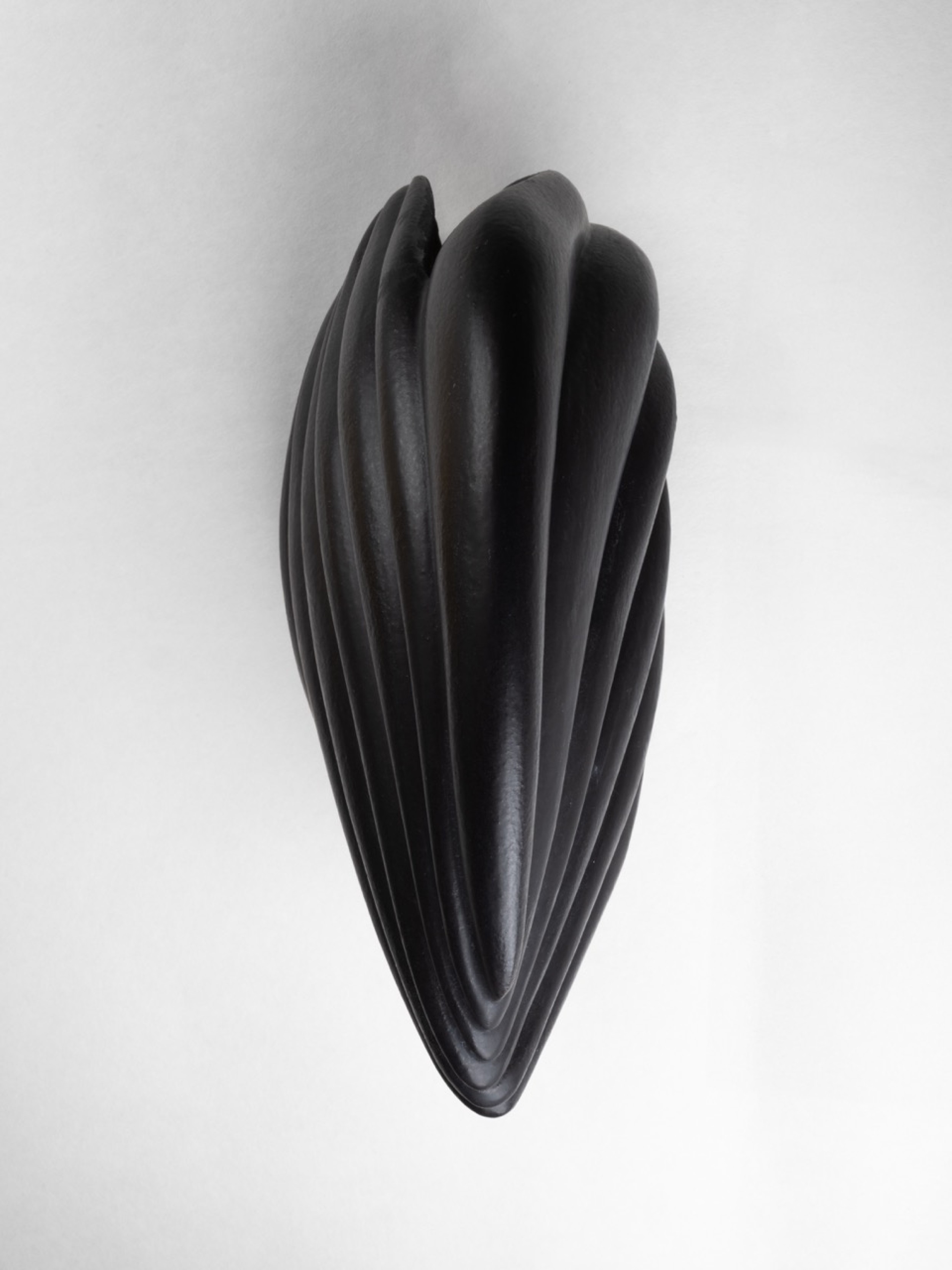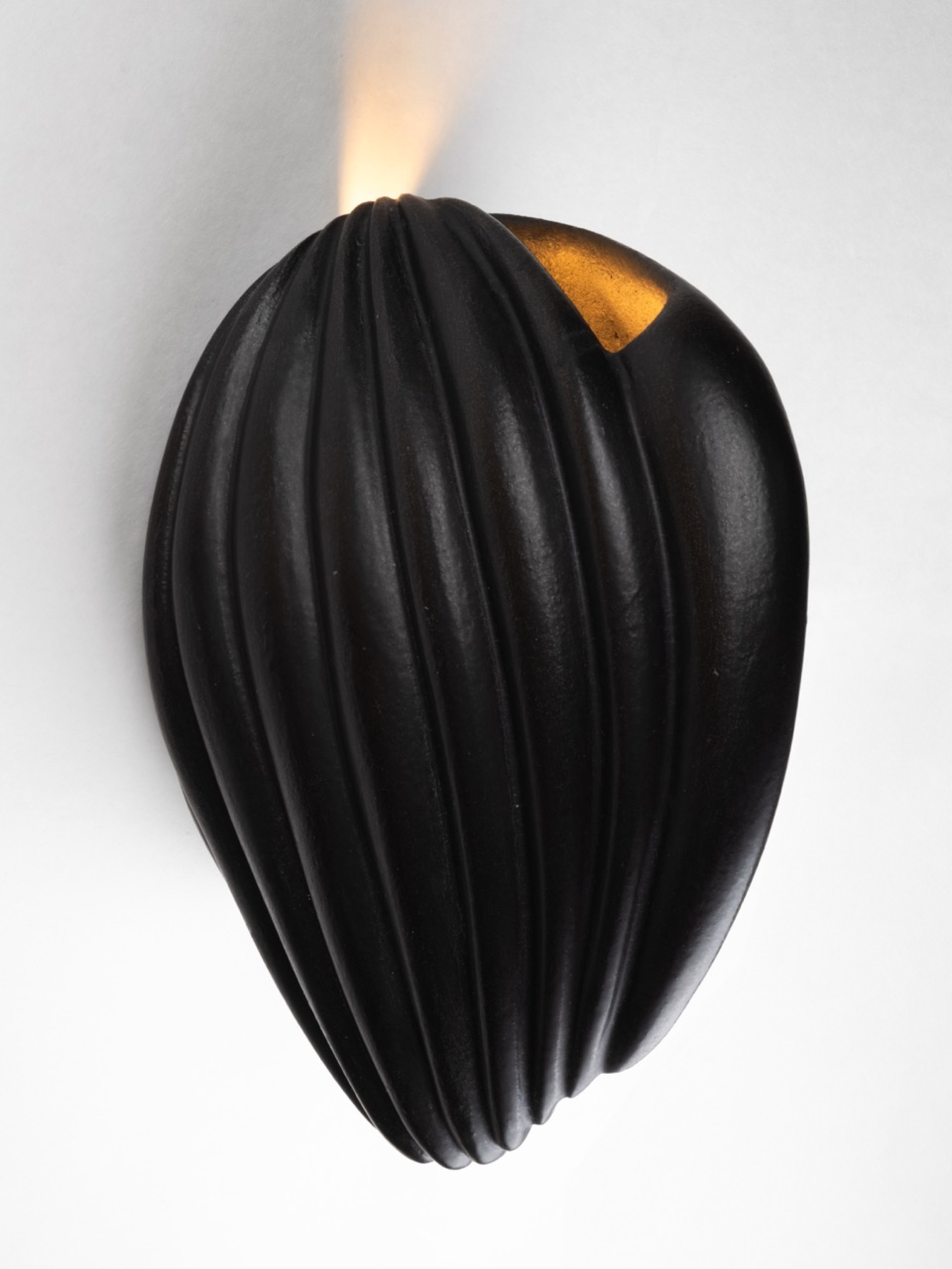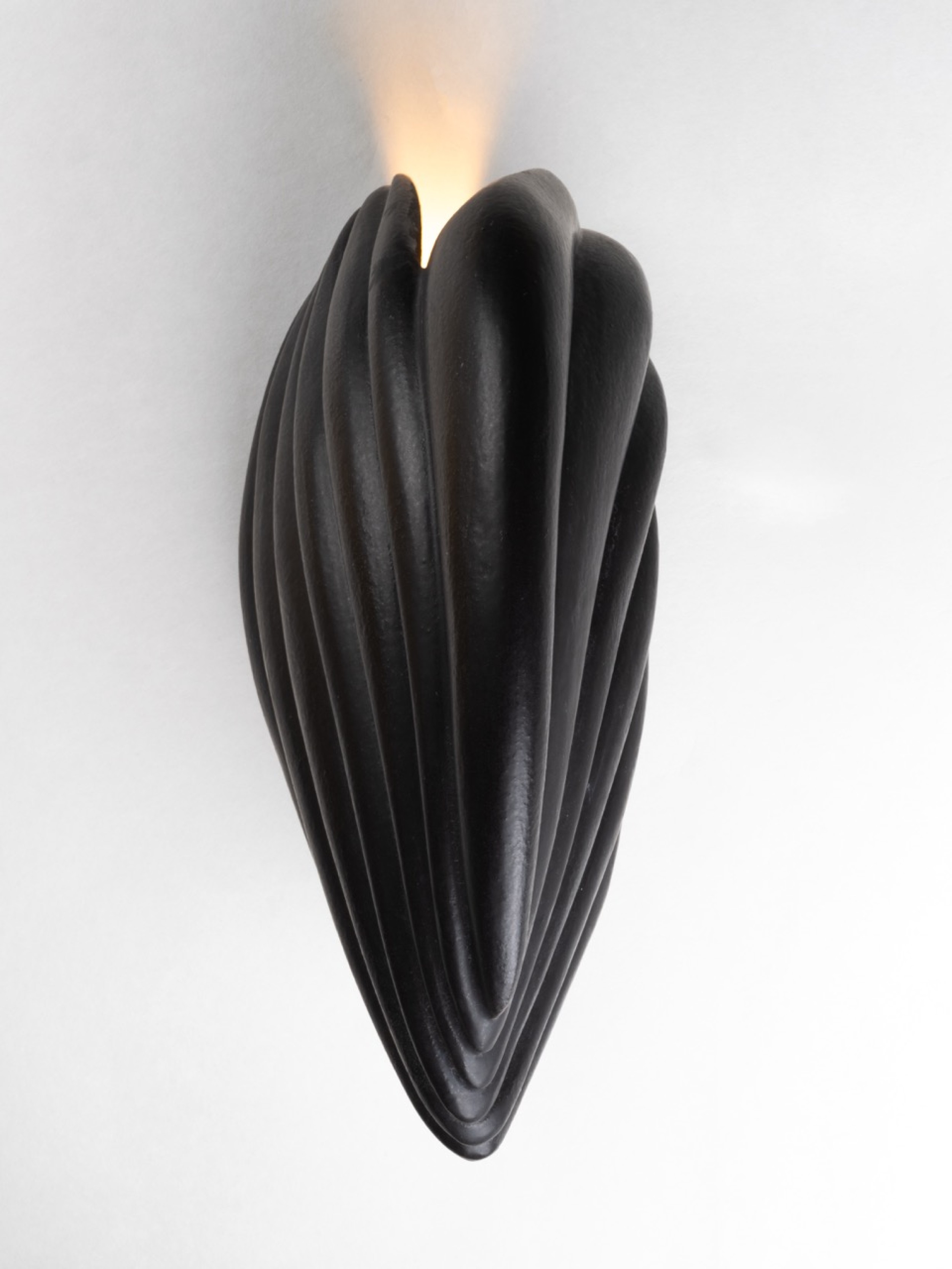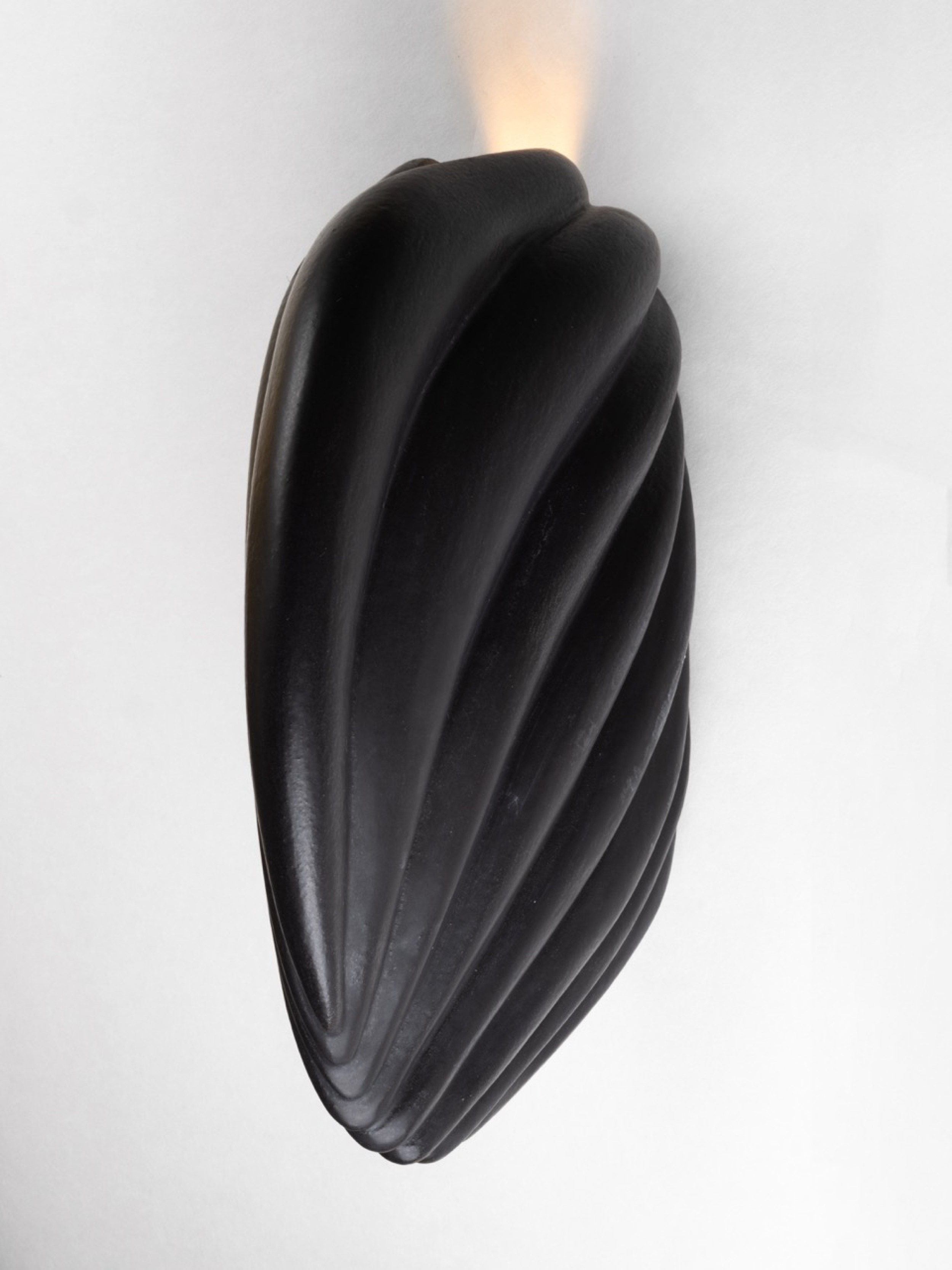 Contemporary ceramic wall sconce featuring a black finish with a flowing design that resembles draped fabric or natural forms like a nautilus shell bearing a small slithered opening for light illumination (ELSA FOULON)