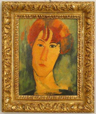 Copy of an abstract portrait painting titled "Jeune Femme Rousse" showing a girl with red hair on a green background.