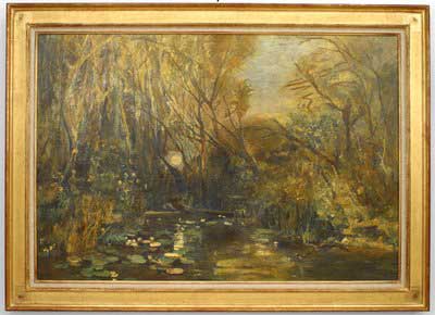 Thanks Copy of a Impressionist style landscape painting by Schindler titled,"Monlandschaft" or "Shaft of Moon Light" showing water lilys in a pond lined with trees under the moon