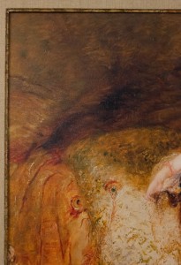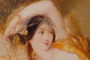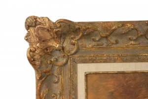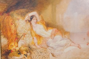 Copy of Orientalist painting of harem girl lounging on cushions with lute and fruit in a gold carved frame