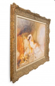 Copy of Orientalist painting of harem girl lounging on cushions with lute and fruit in a gold carved frame.