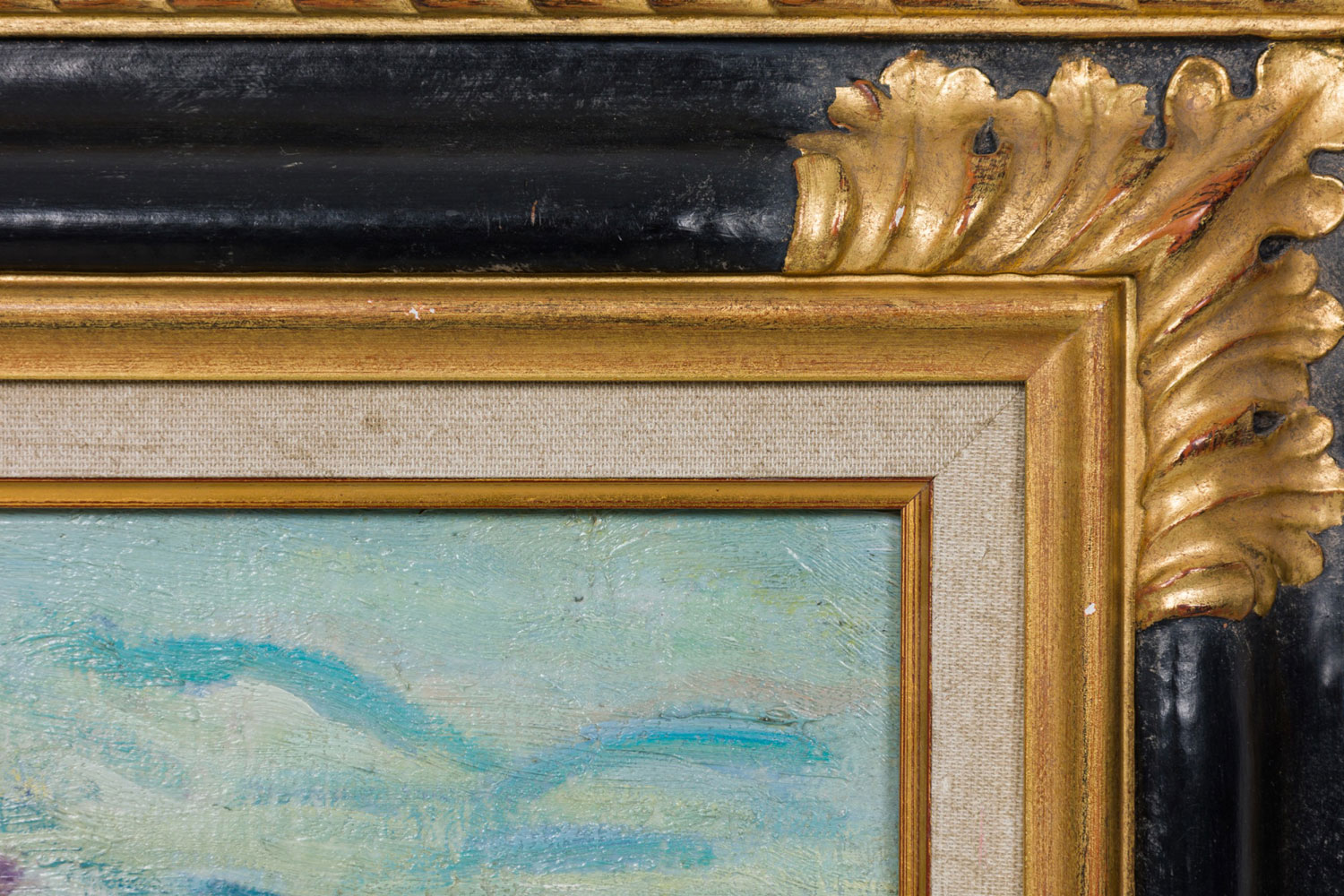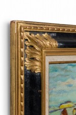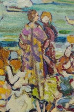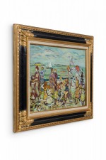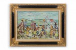 Copy of an impressionist landscape painting titled "The Inlet" showing a summer scene of bathers on a beach