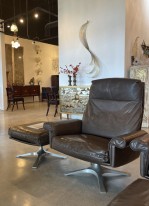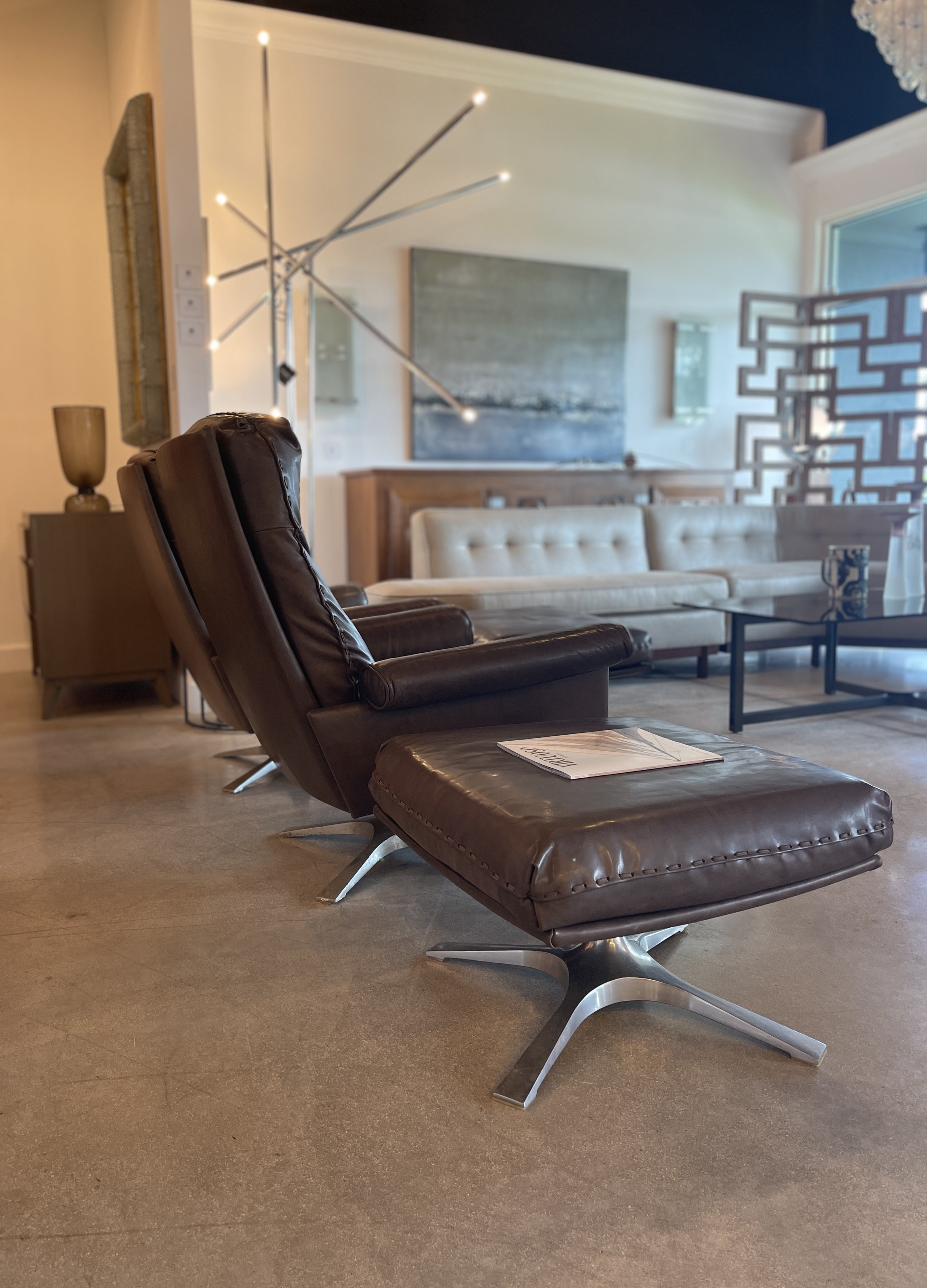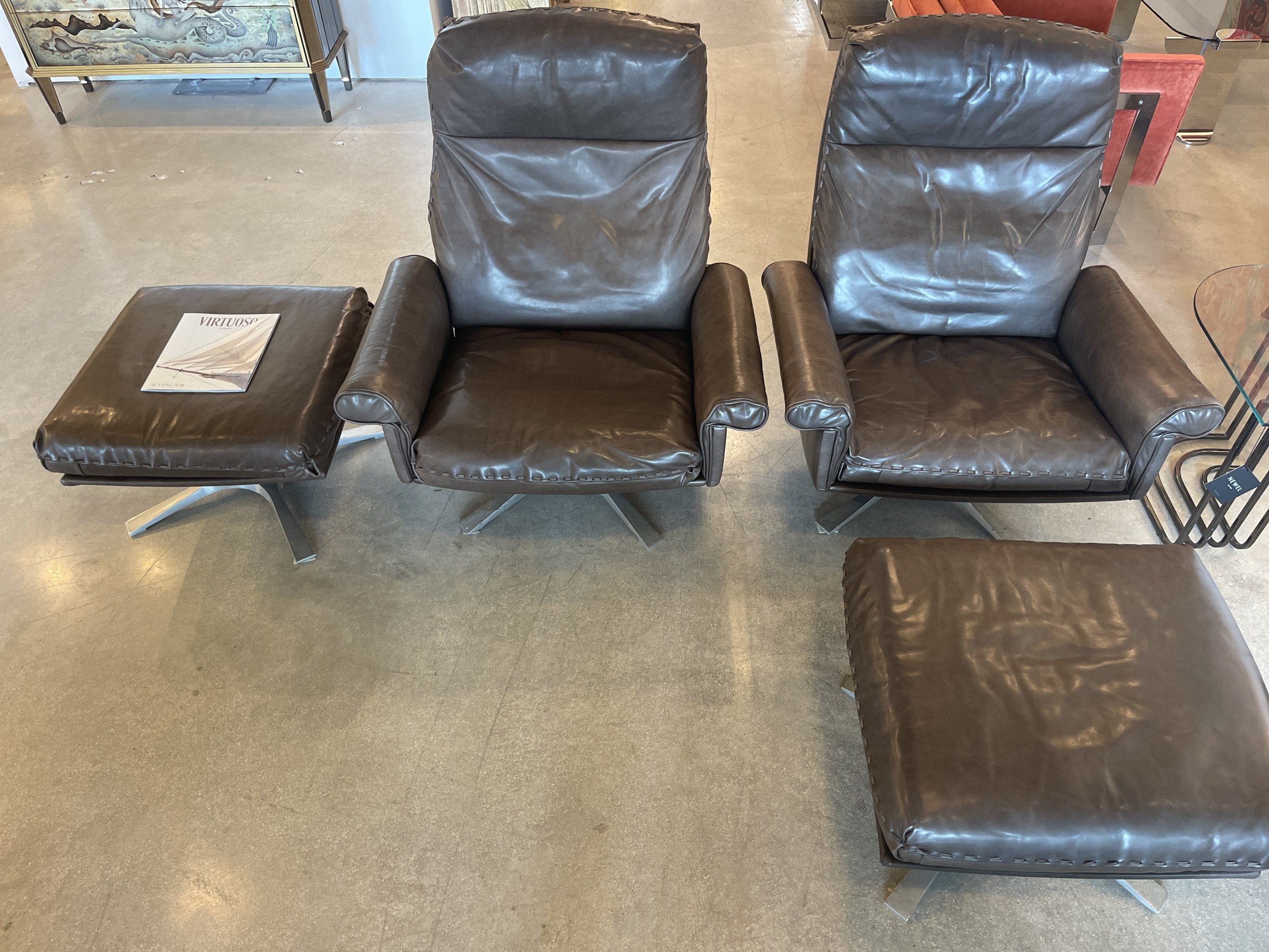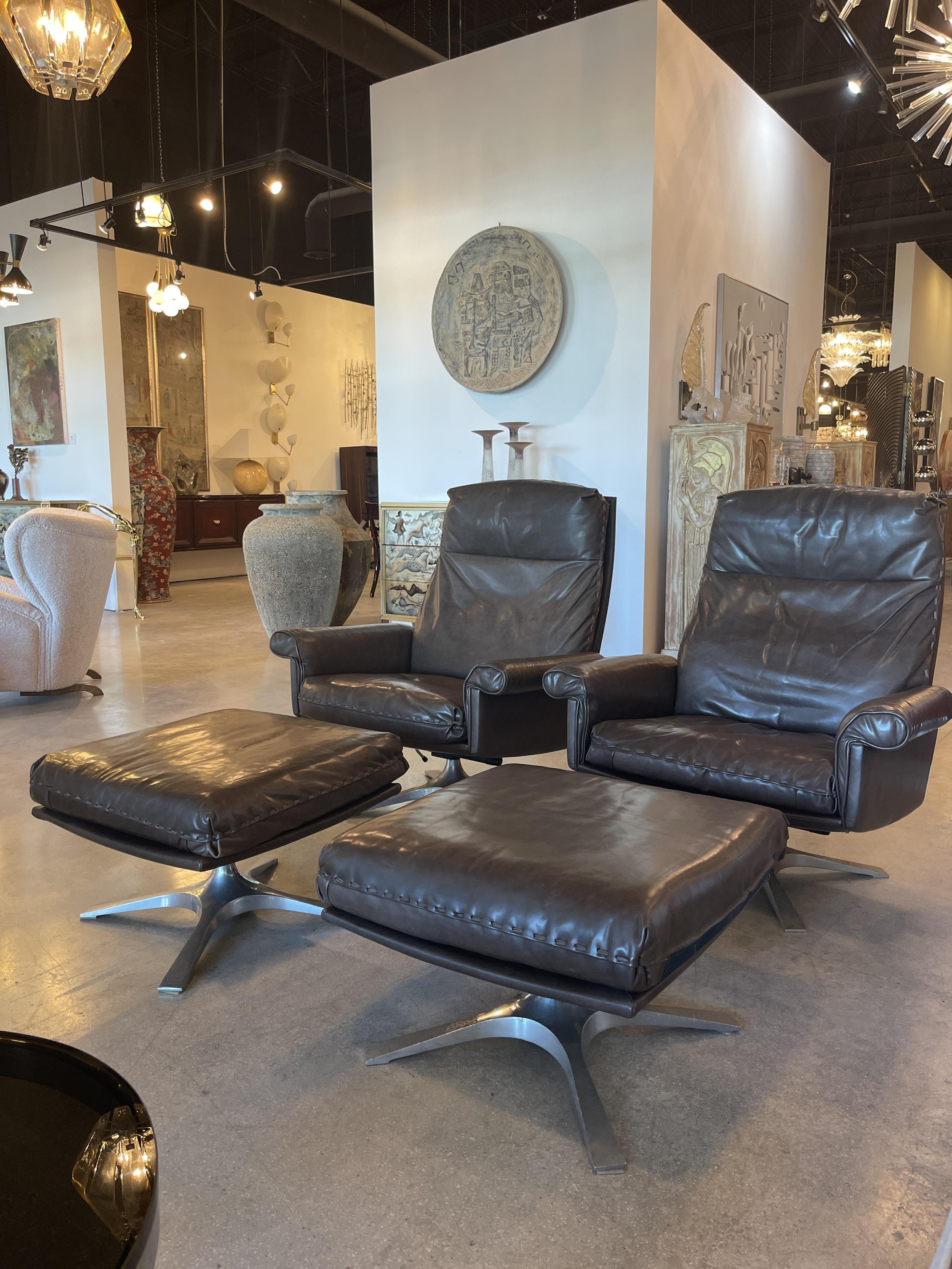 PAIR of Mid-Century (Swiss-1970s) black leather lounge / swivel armchairs and matching ottomans (24"x 24" x 17"h) resting on chrome metal bases (DE SEDE - model #S231) (PRICED AS PAIR)