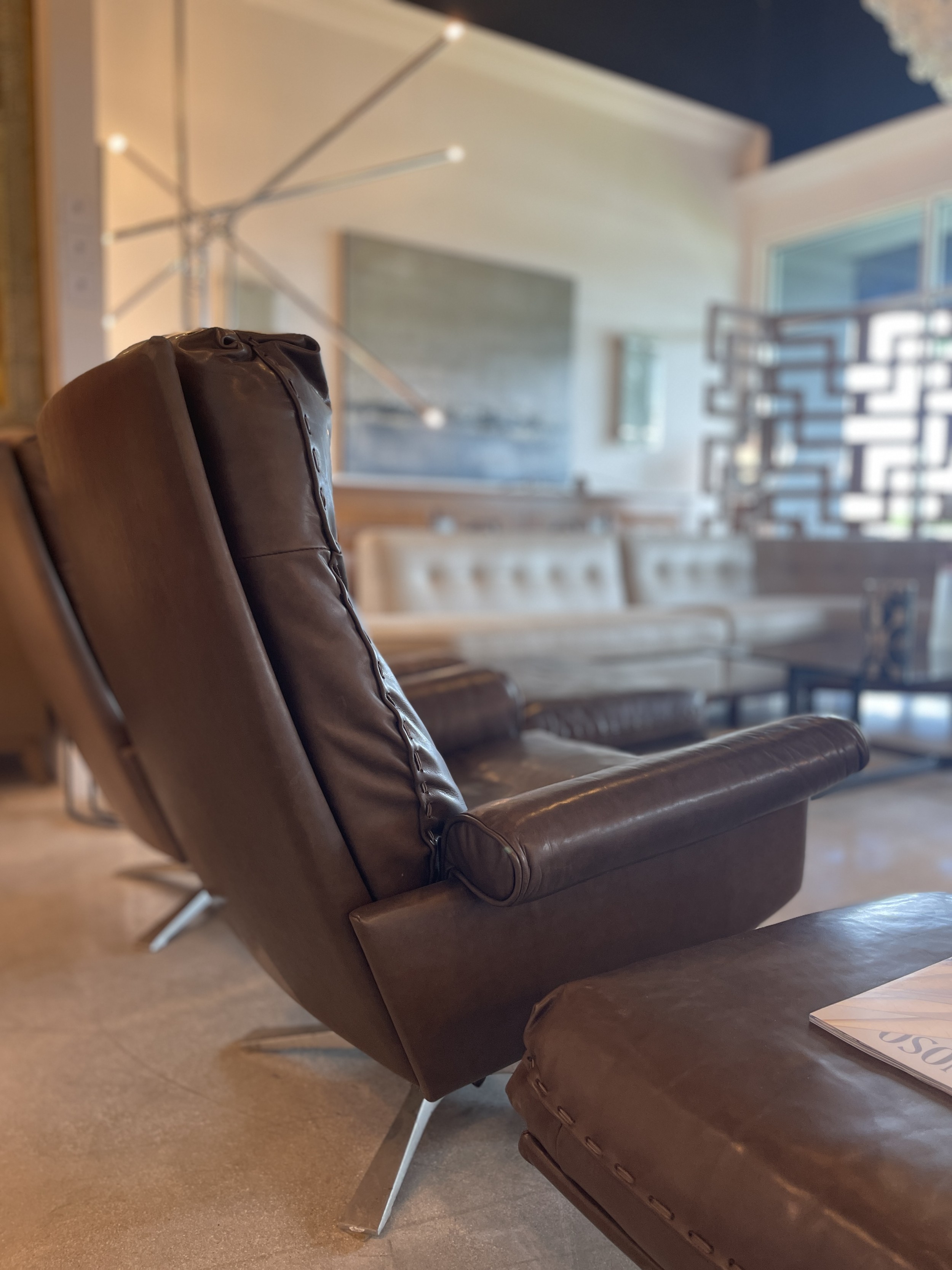 PAIR of Mid-Century (Swiss-1970s) black leather lounge / swivel armchairs and matching ottomans (24"x 24" x 17"h) resting on chrome metal bases (DE SEDE - model #S231) (PRICED AS PAIR).