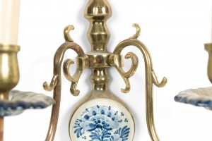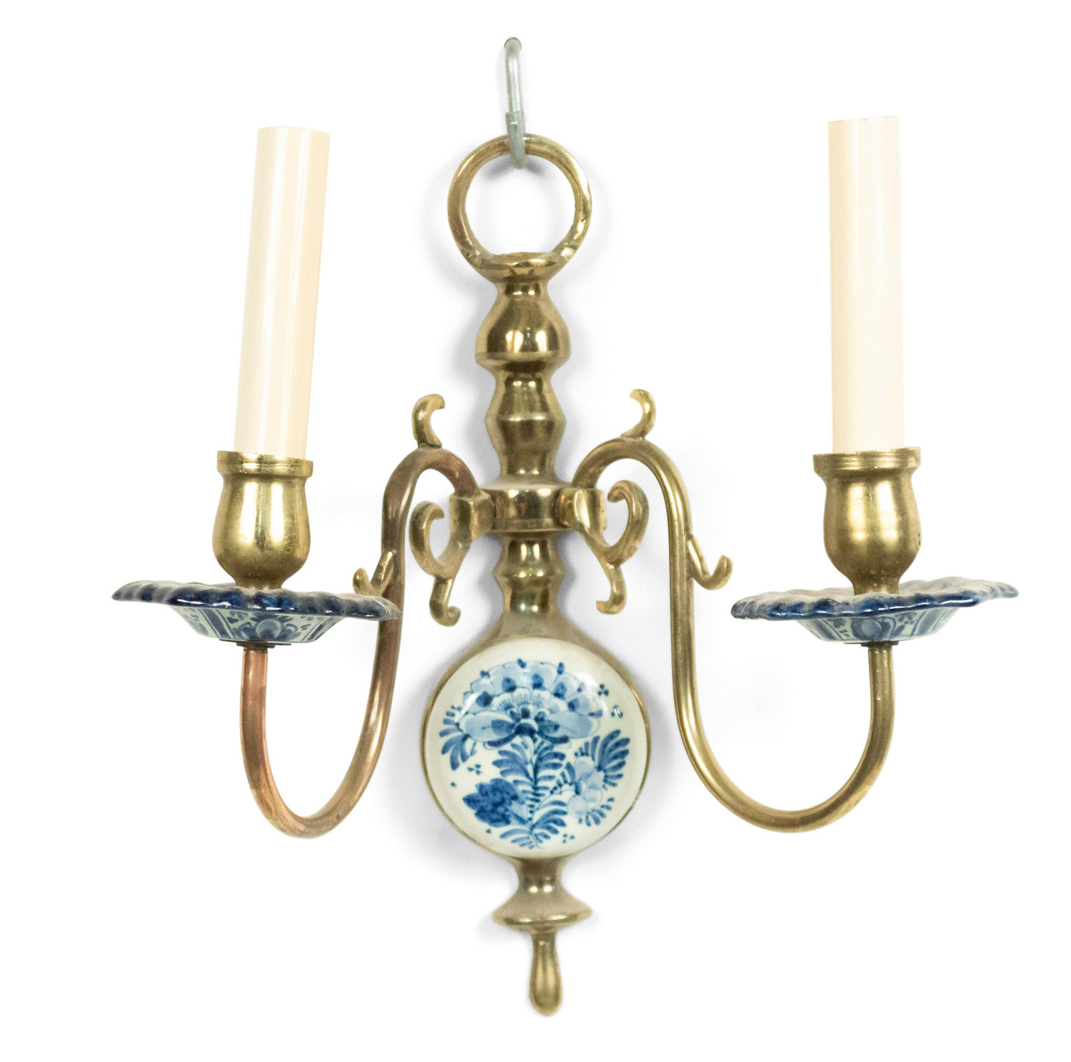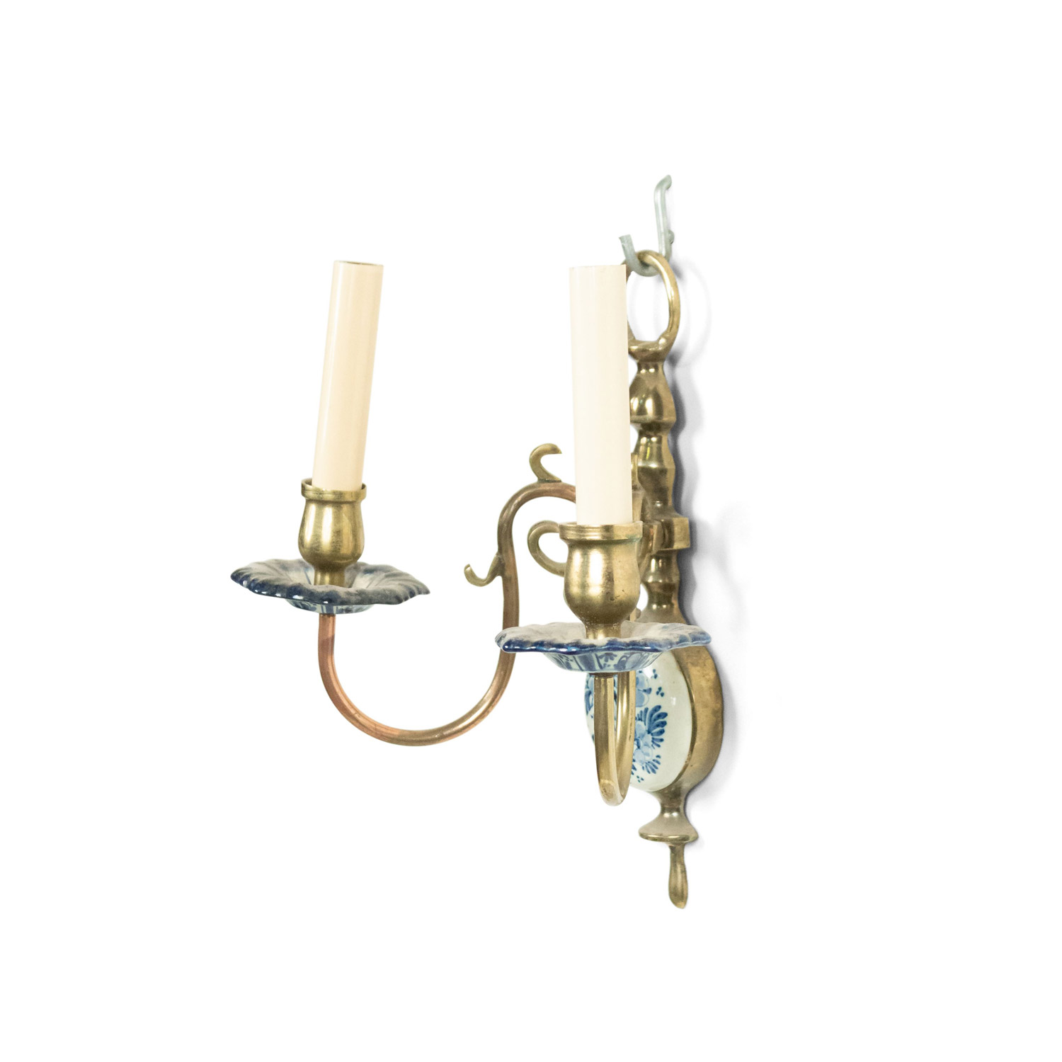 Dutch Delft Blue Porcelain and Brass Wall Sconce