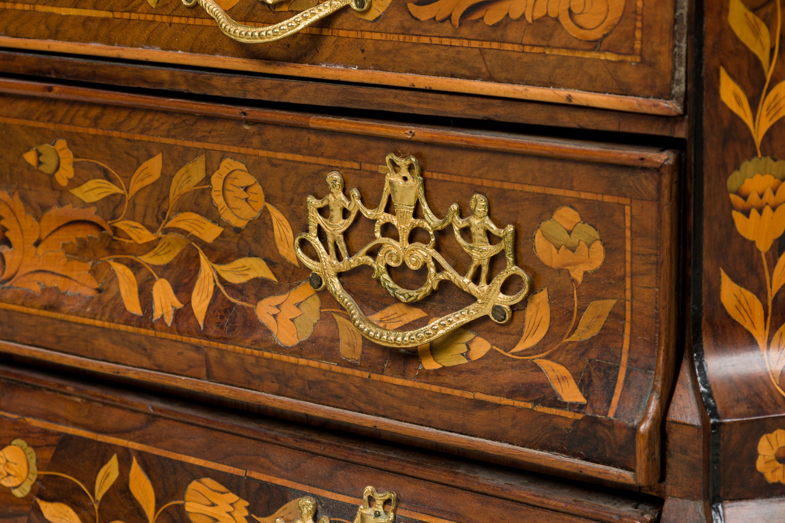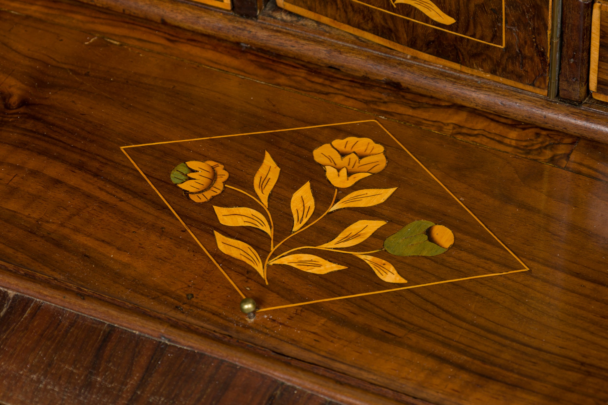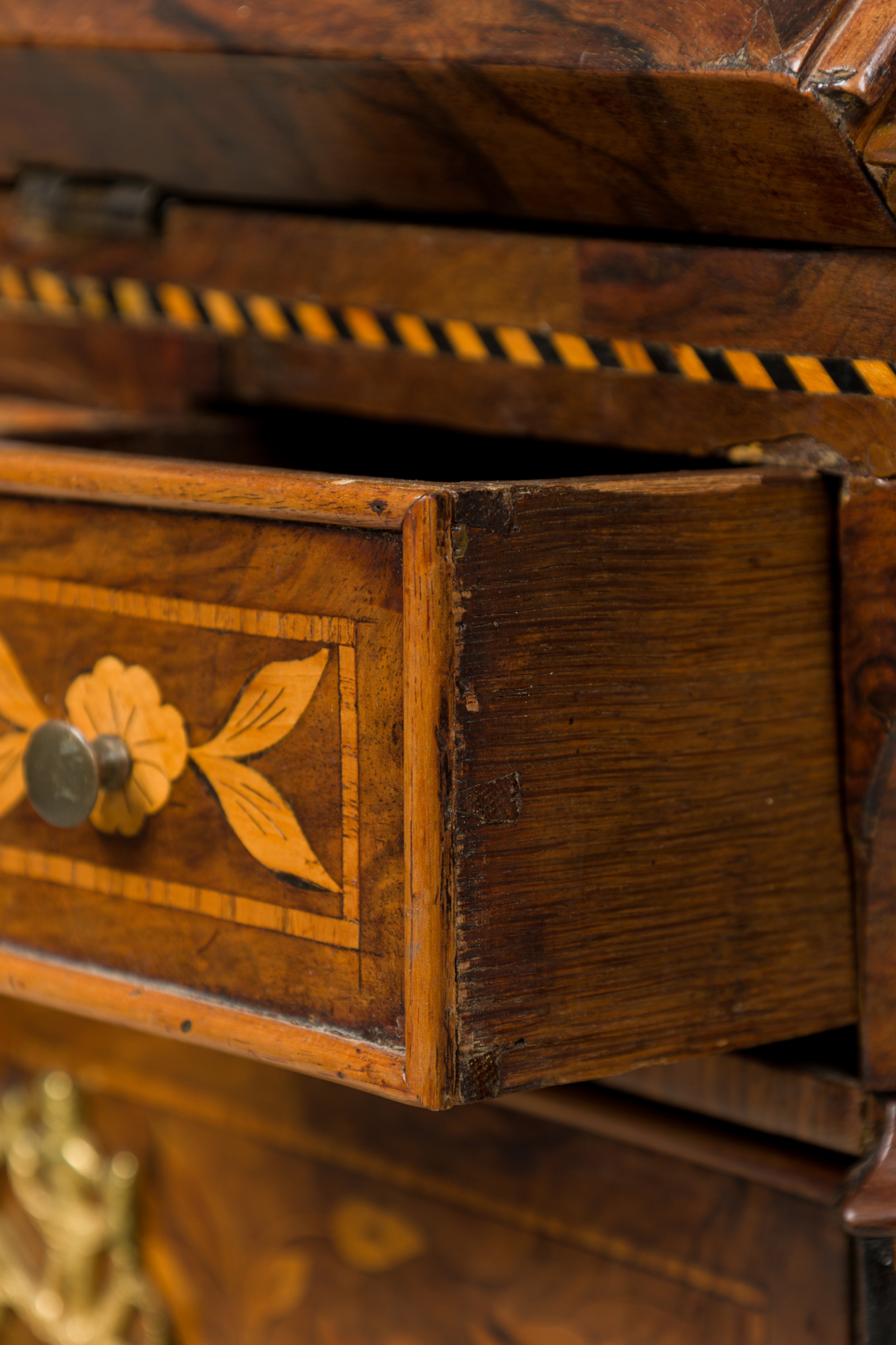 Dutch Rococo (Late 18th Century) drop front desk / secretary with elaborate foliate marquetry inlay, with the slant front opening to a desk with a green leather inset surface in front of a series of small drawers and compartments, over four lower drawers mounted with elaborate brass drawer pulls and resting on carved paw feet.