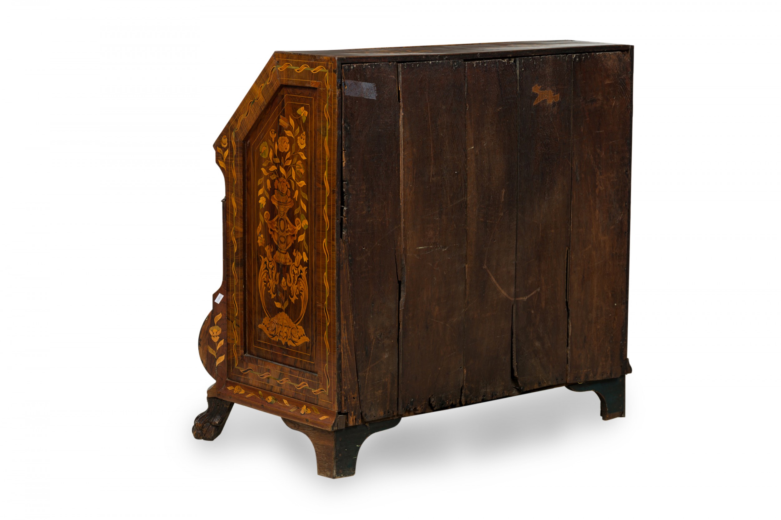 Dutch Rococo (Late 18th Century) drop front desk / secretary with elaborate foliate marquetry inlay, with the slant front opening to a desk with a green leather inset surface in front of a series of small drawers and compartments, over four lower drawers mounted with elaborate brass drawer pulls and resting on carved paw feet..