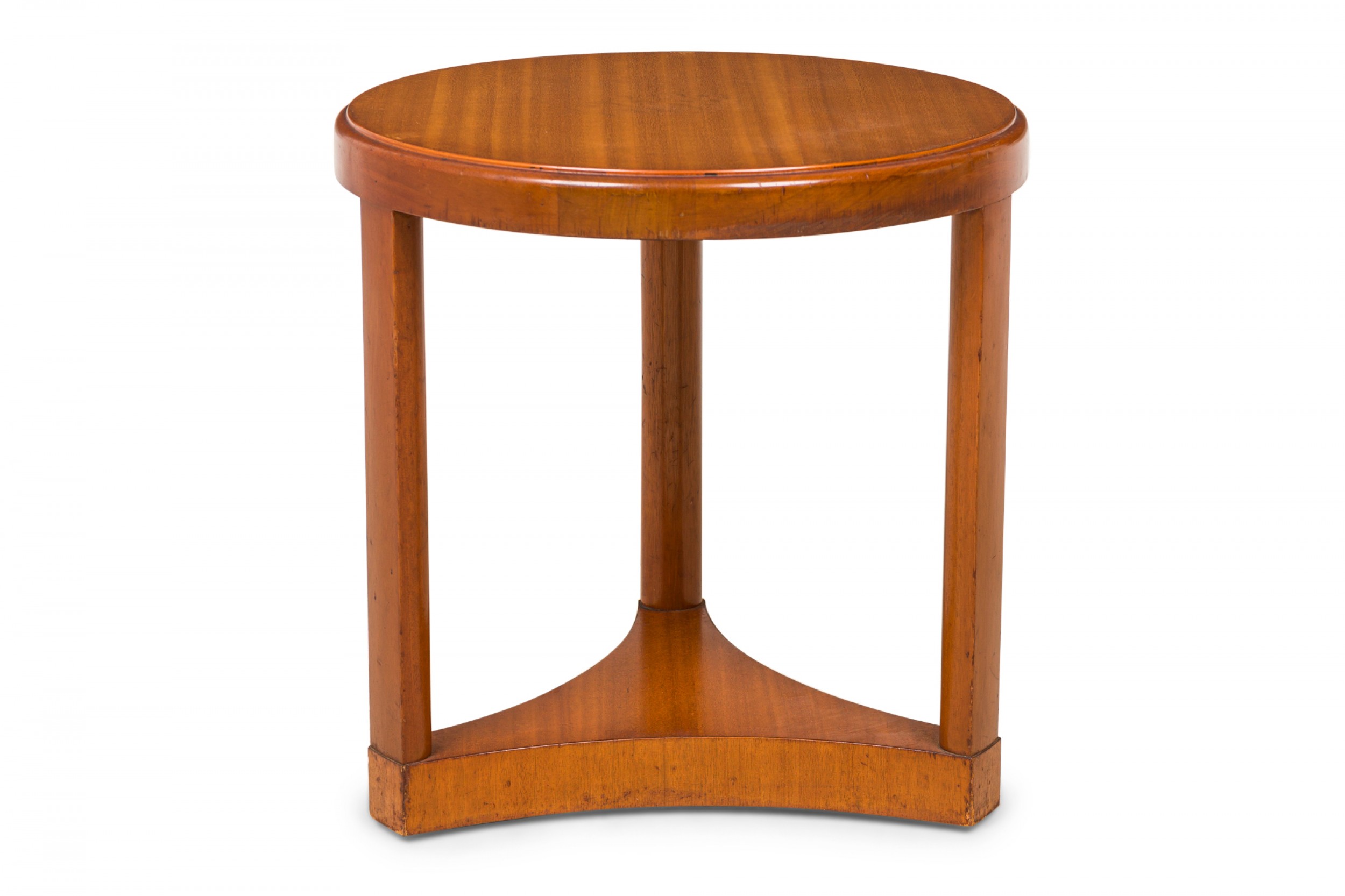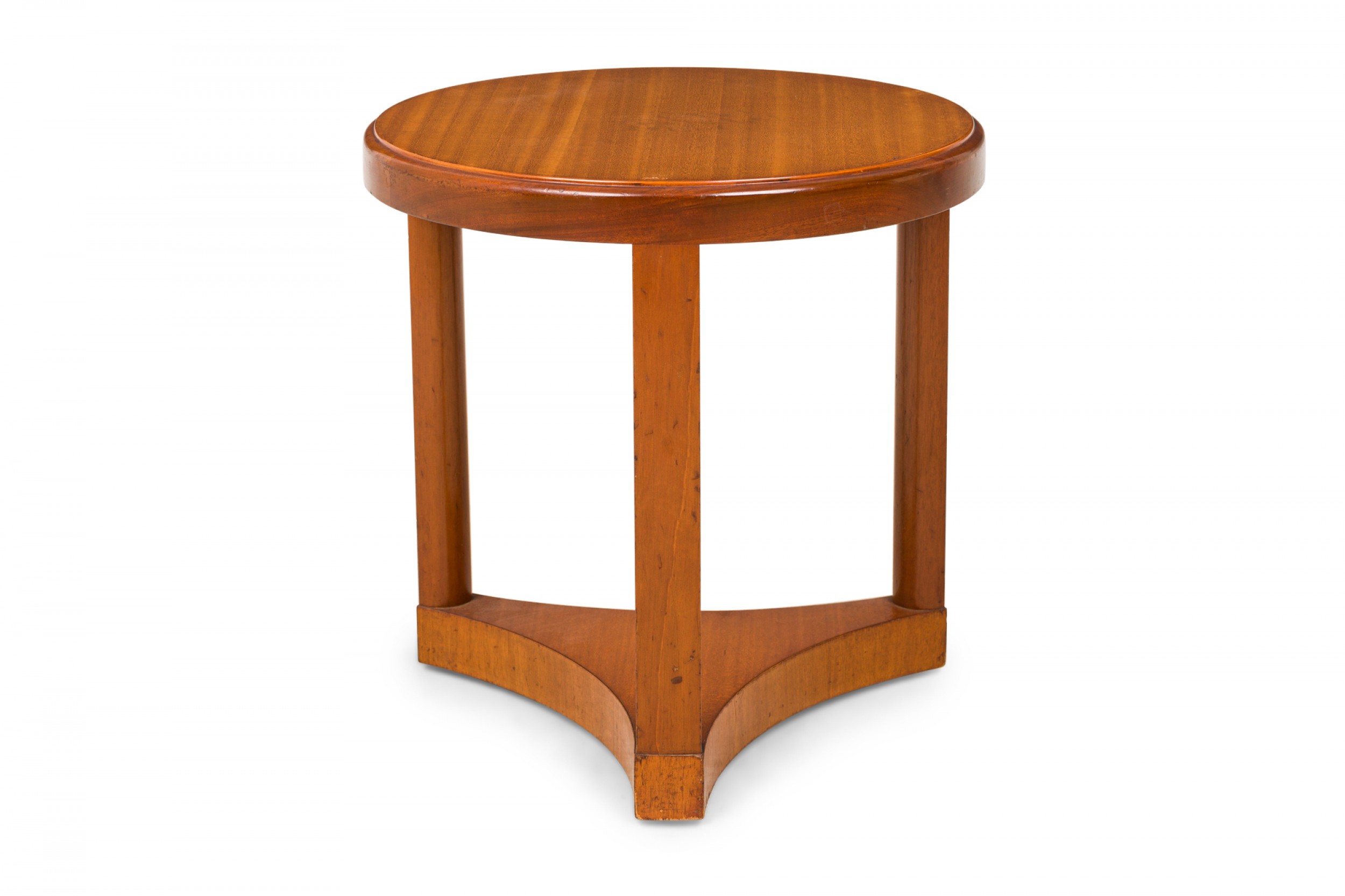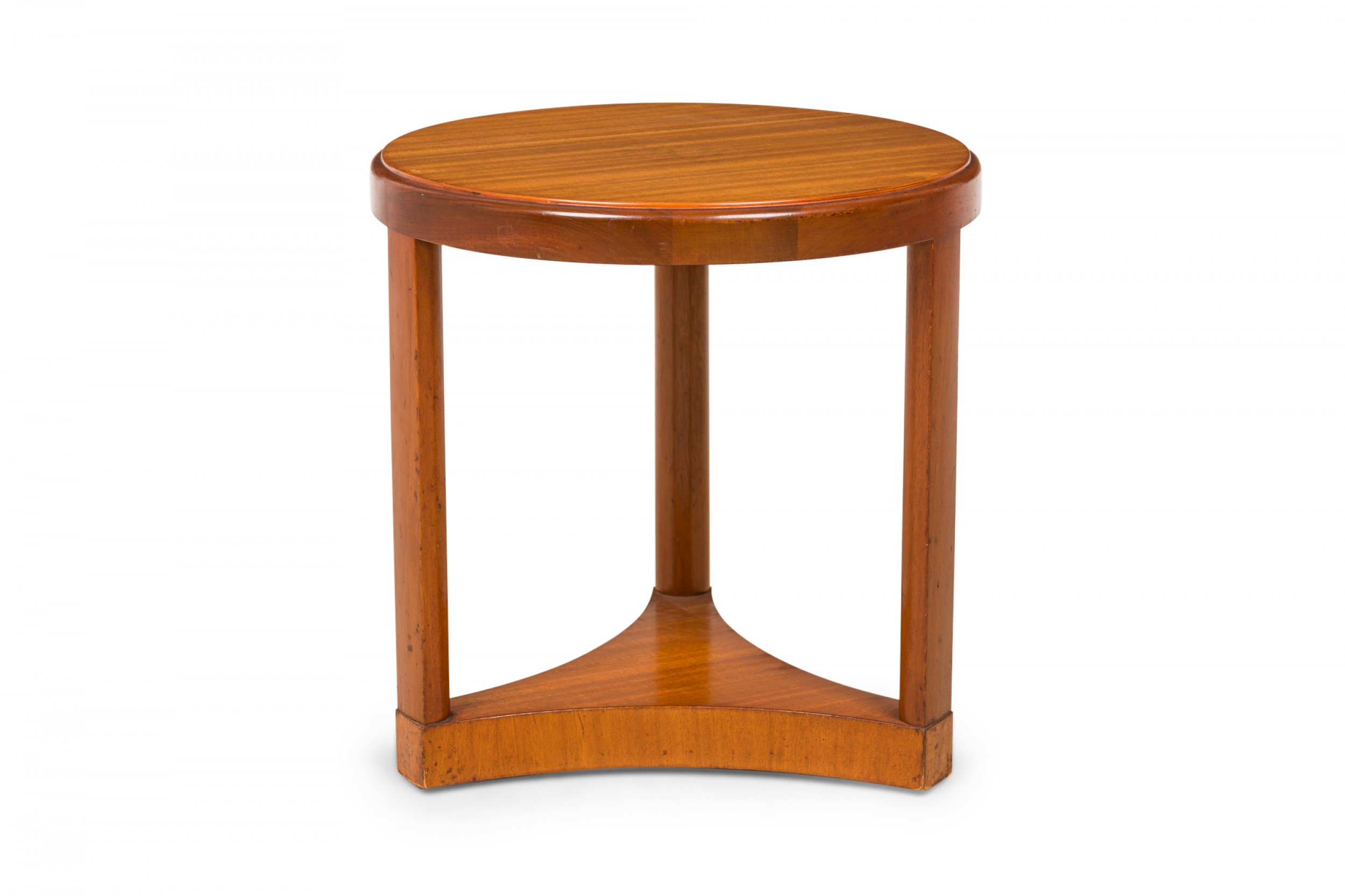 American Mid-Century round wooden side / end table with a circular top with beveled edge resting on three vertical rectangular supports connected to a triangular scooped side base. (EDWARD WORMLEY)(Similar shorter table: DUF0637)