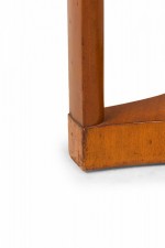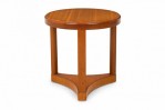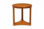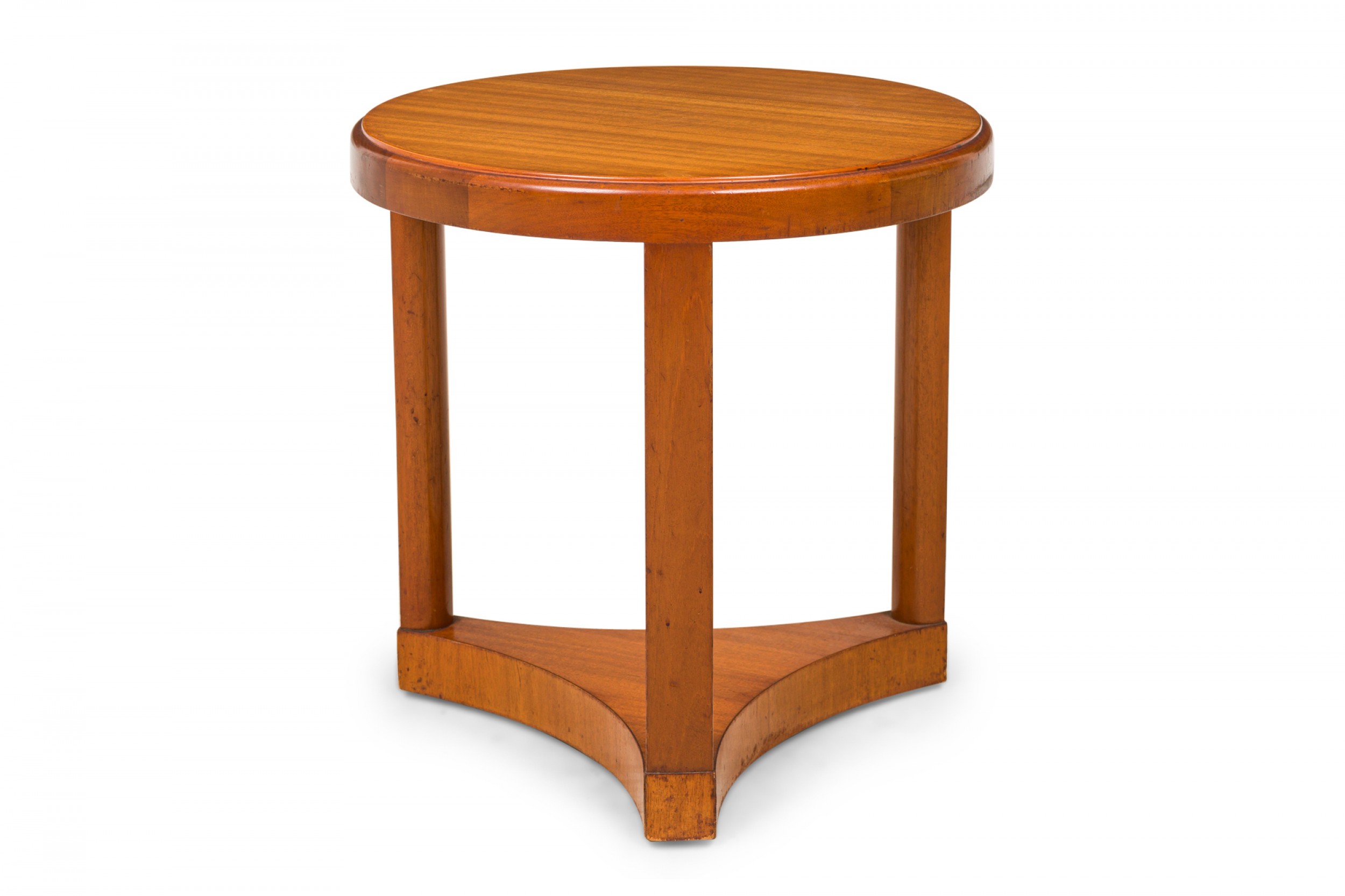 American Mid-Century round wooden side / end table with a circular top with beveled edge resting on three vertical rectangular supports connected to a triangular scooped side base. (EDWARD WORMLEY)(Similar shorter table: DUF0637).