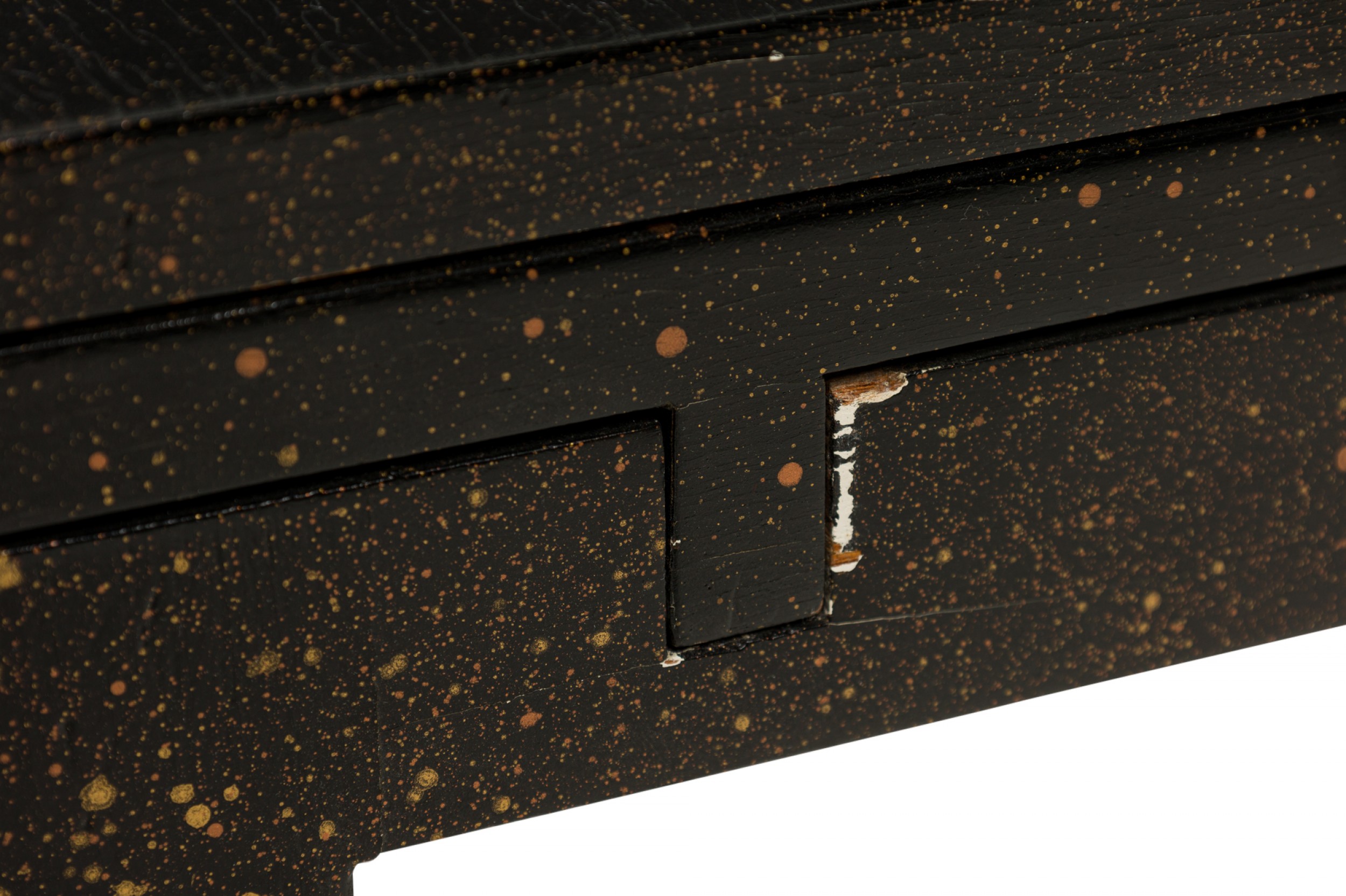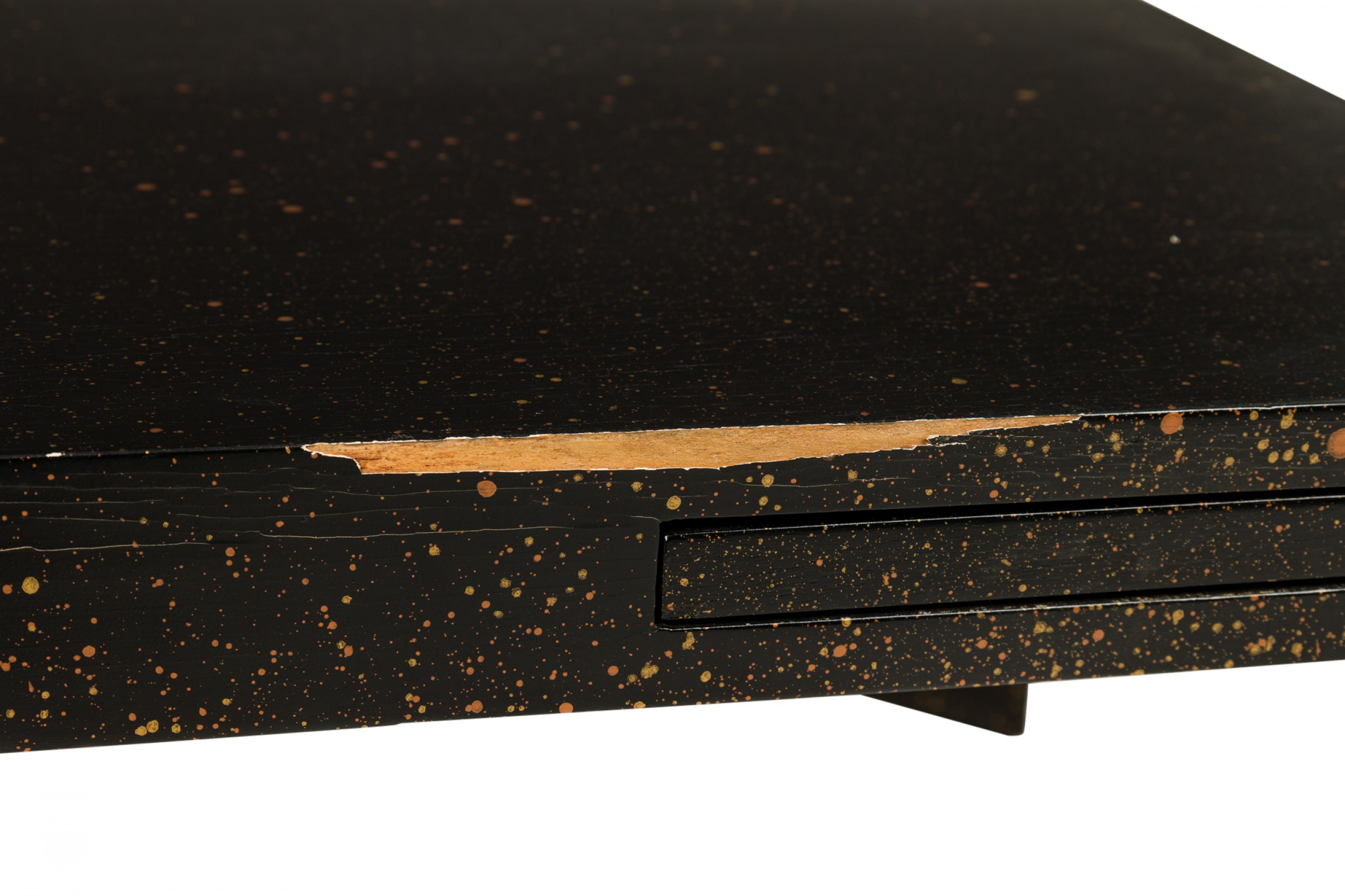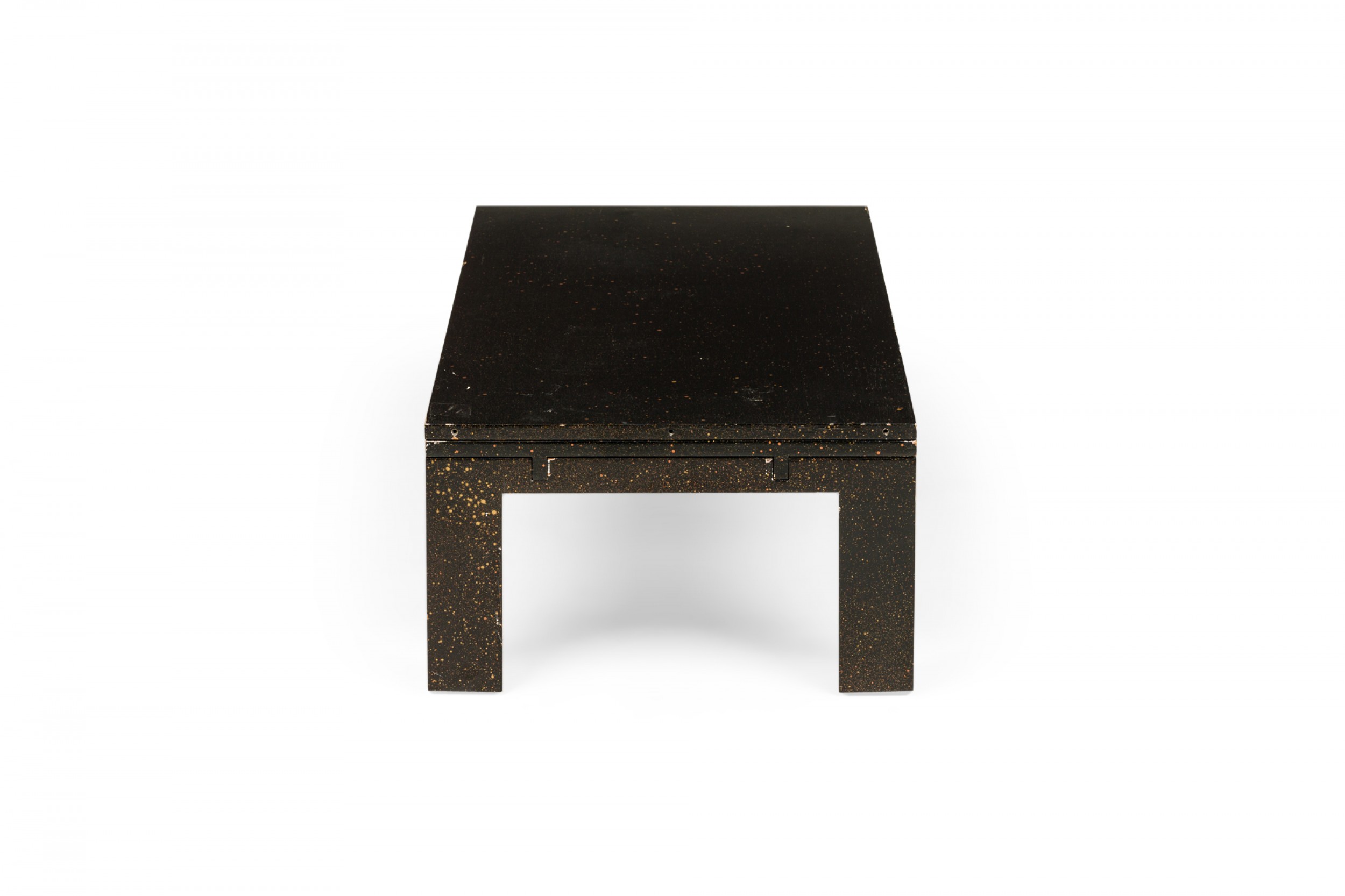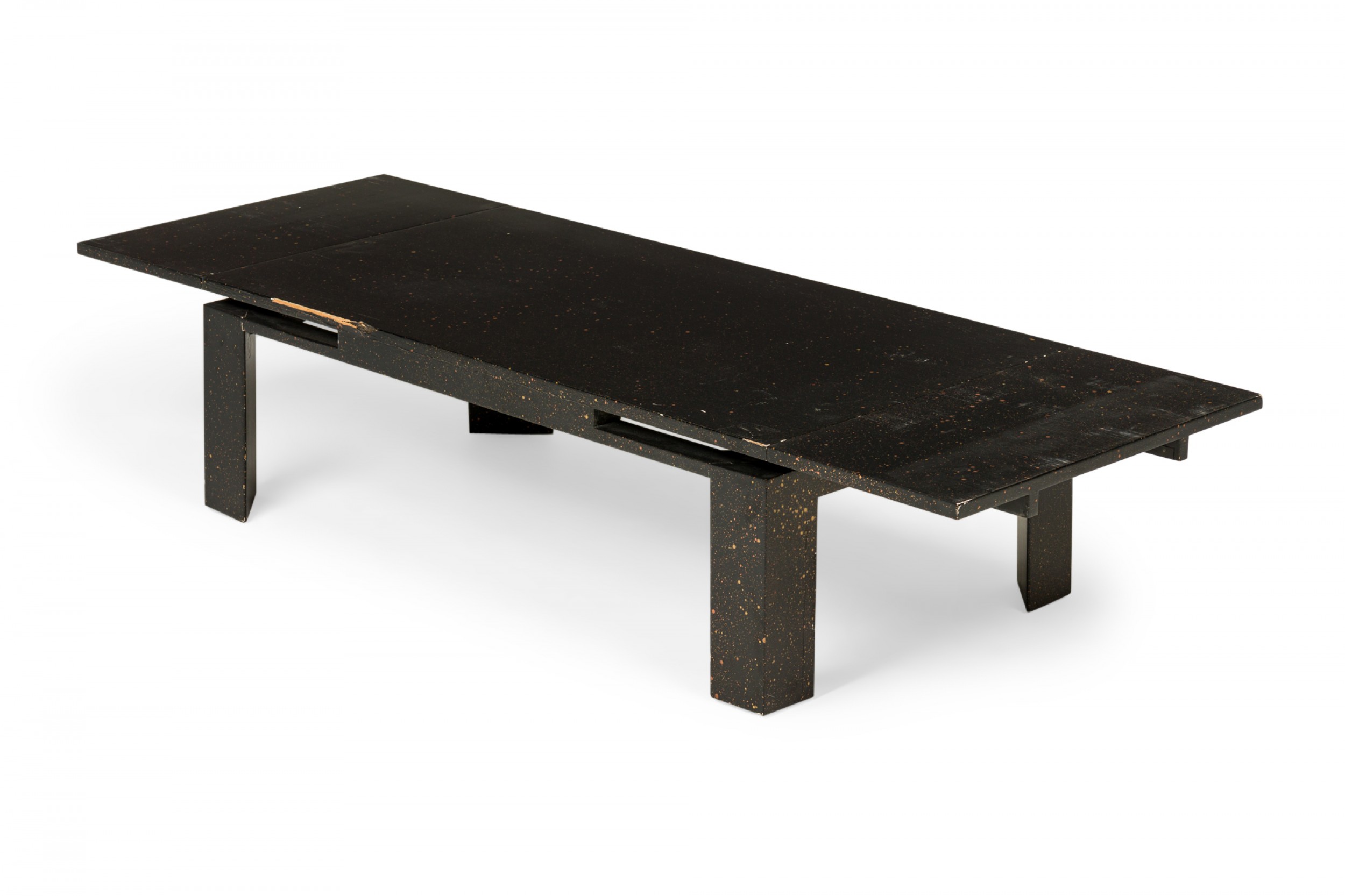 American Mid-Century black painted white speckled wooden refectory coffee / cocktail table with a rectangular top and two concealed pull out leaves on either side. (EDWARD WORMLEY FOR DUNBAR FURNITURE COMPANY)(Similar pieces: DUF0720, DUF0737).