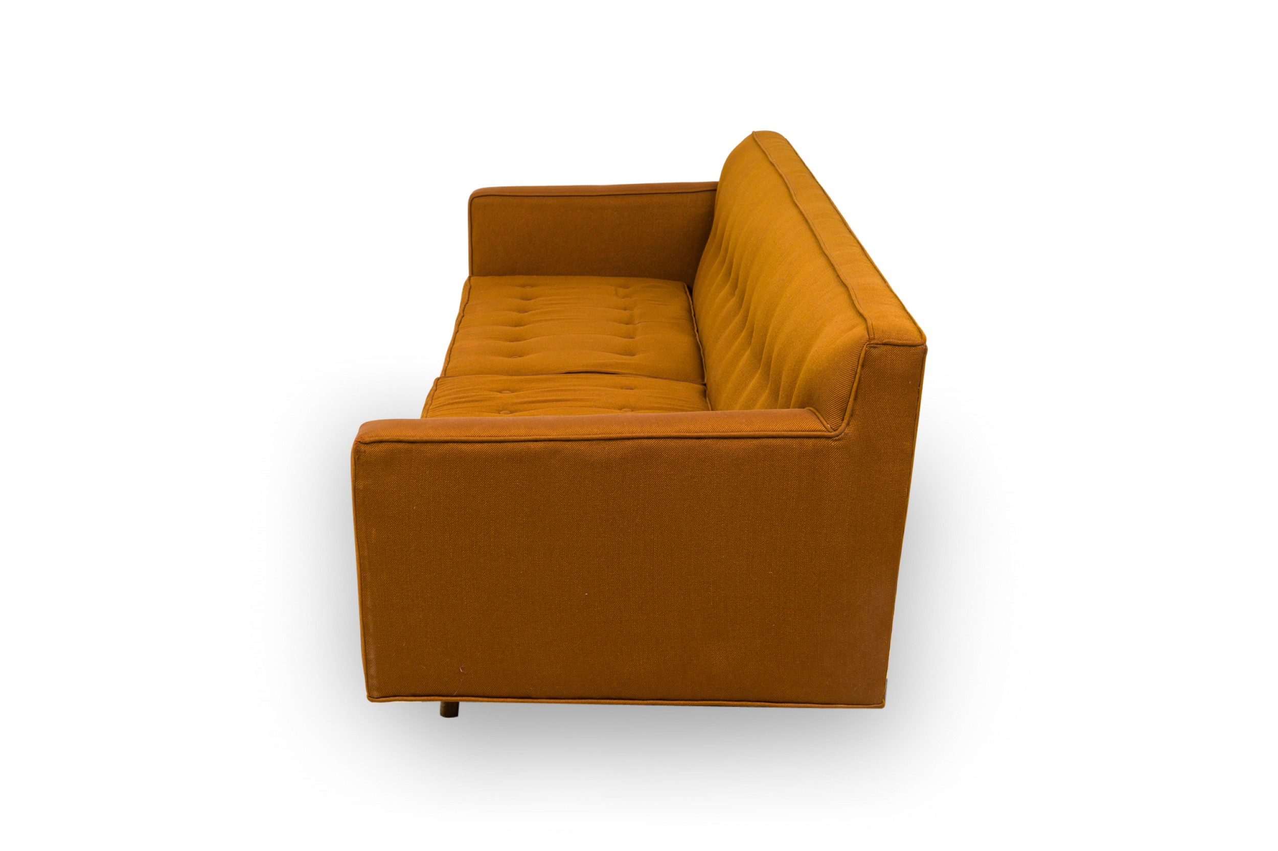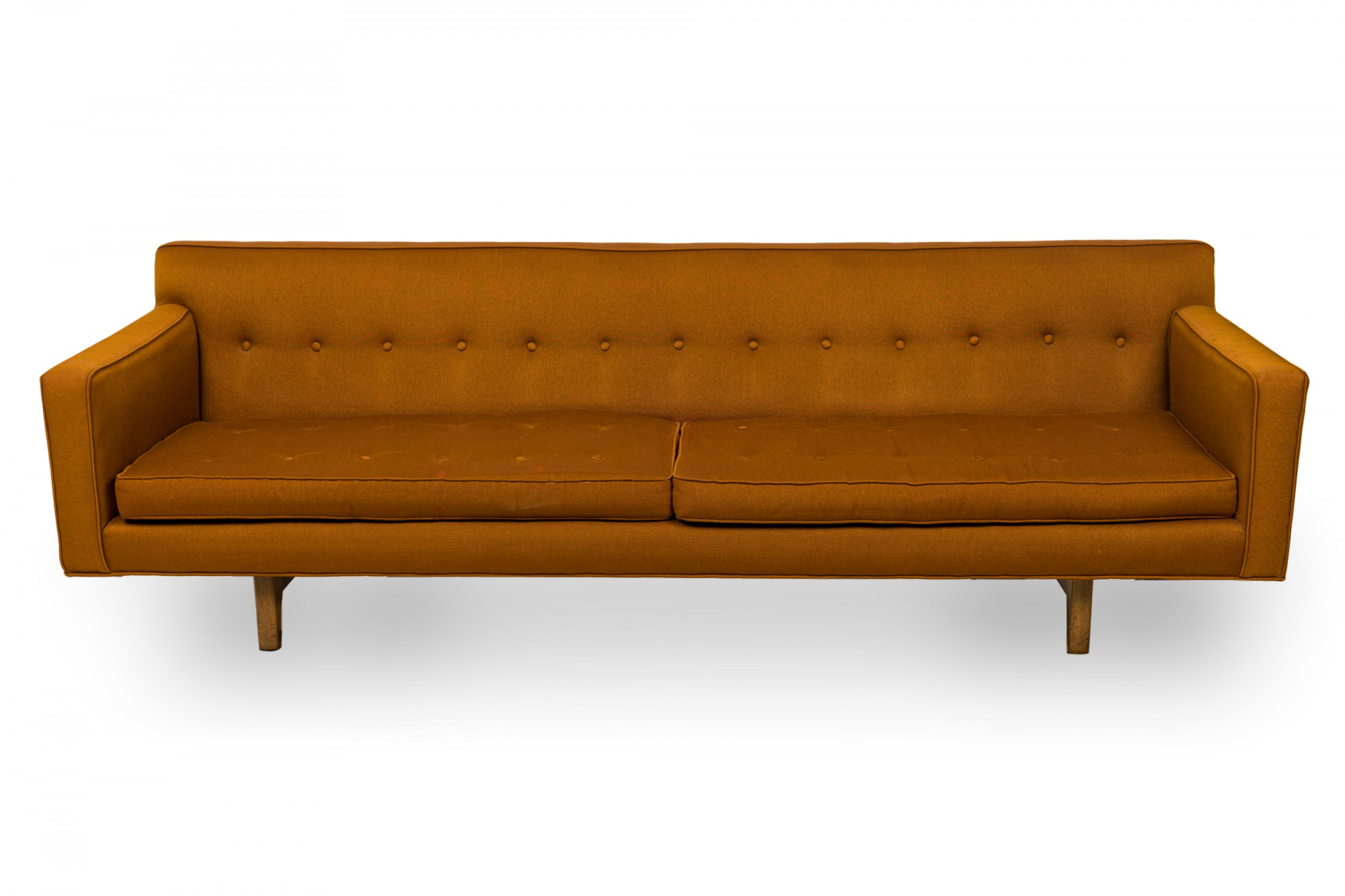 American Mid-Century 3-seat sofa with brown button tufted fabric upholstery, and two removable seat cushions resting on a floating wooden base. (EDWARD WORMLEY FOR DUNBAR FURNITURE COMPANY)