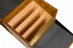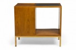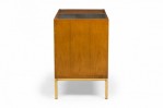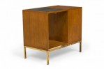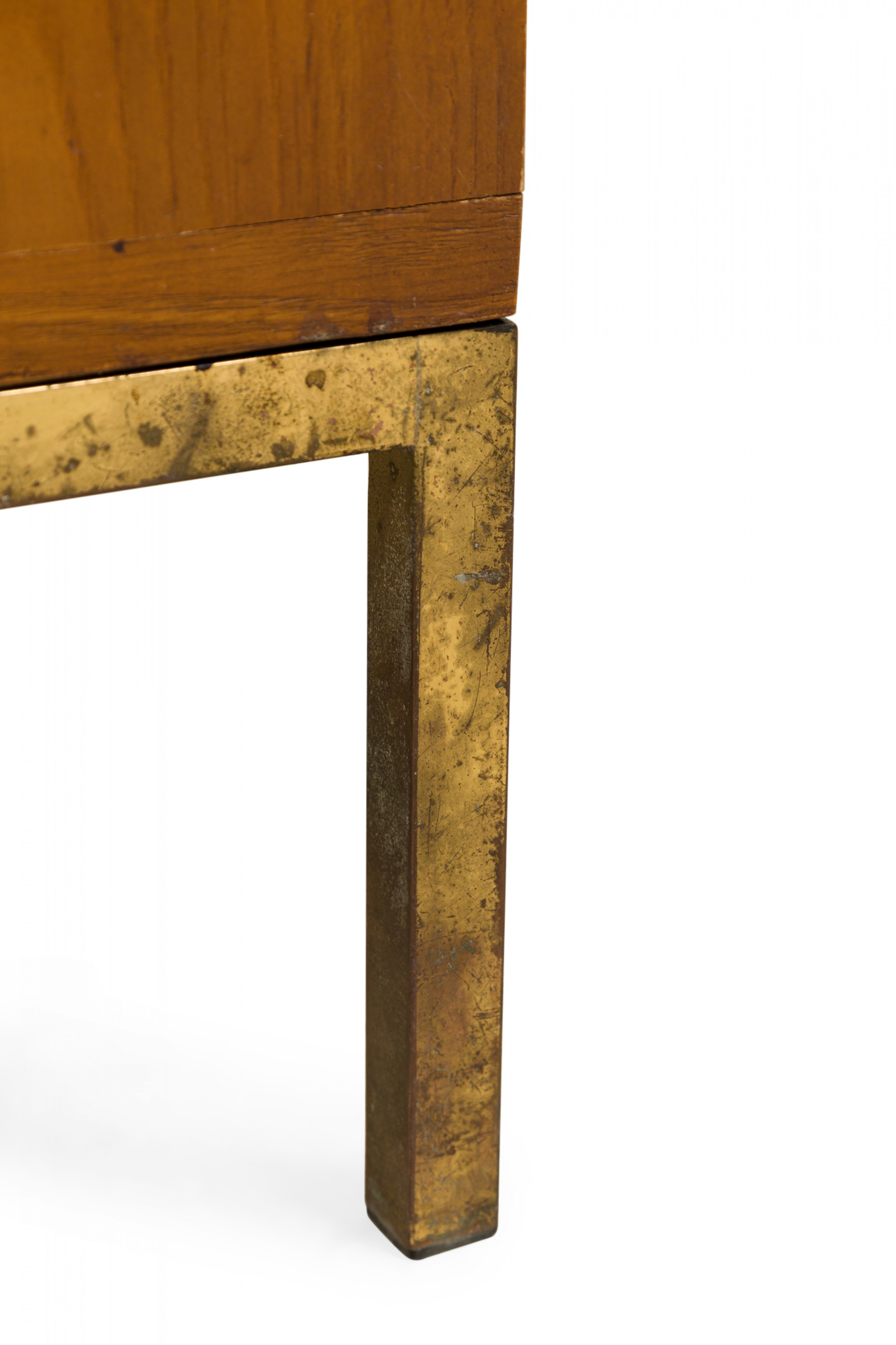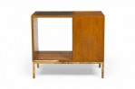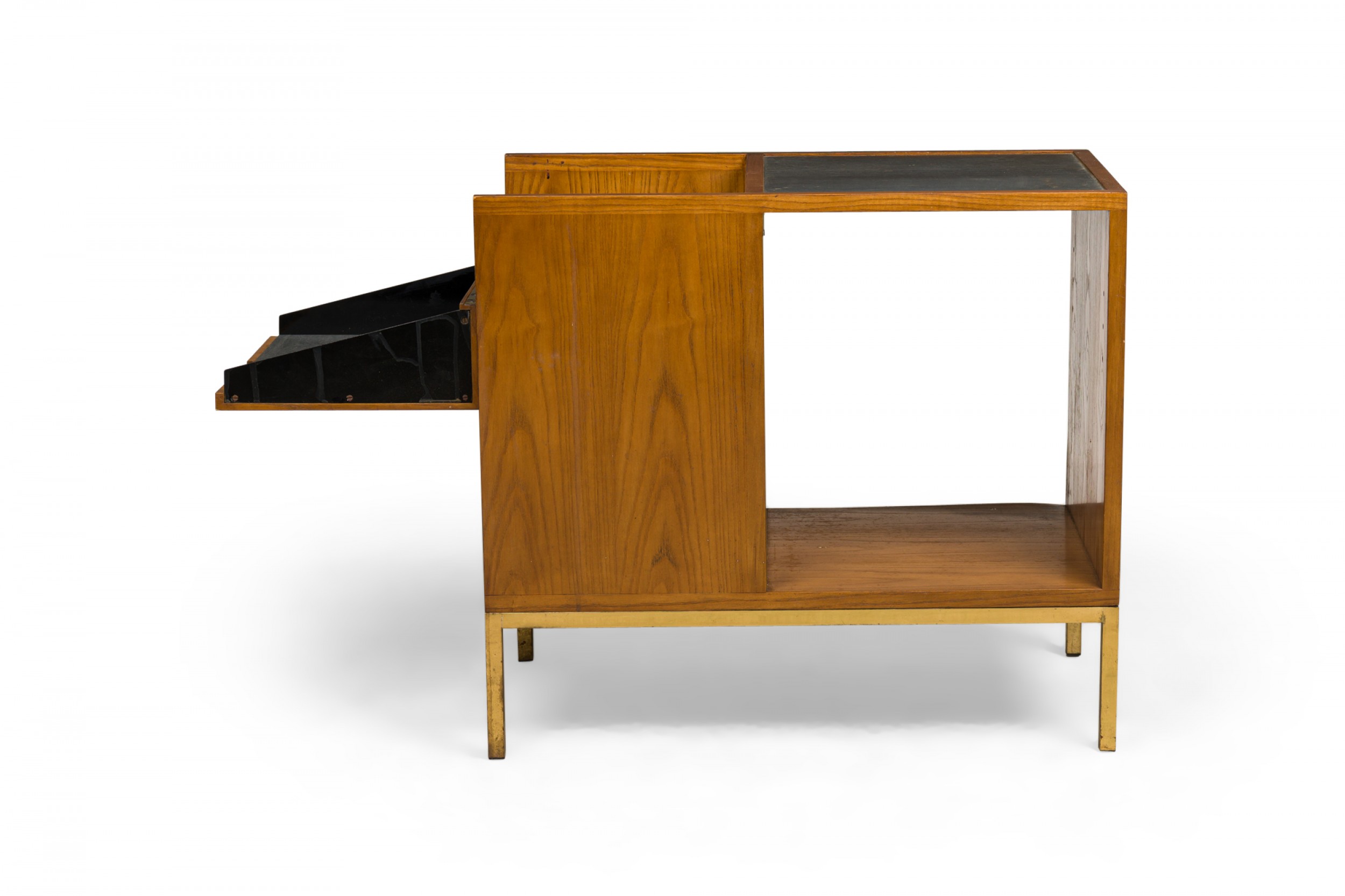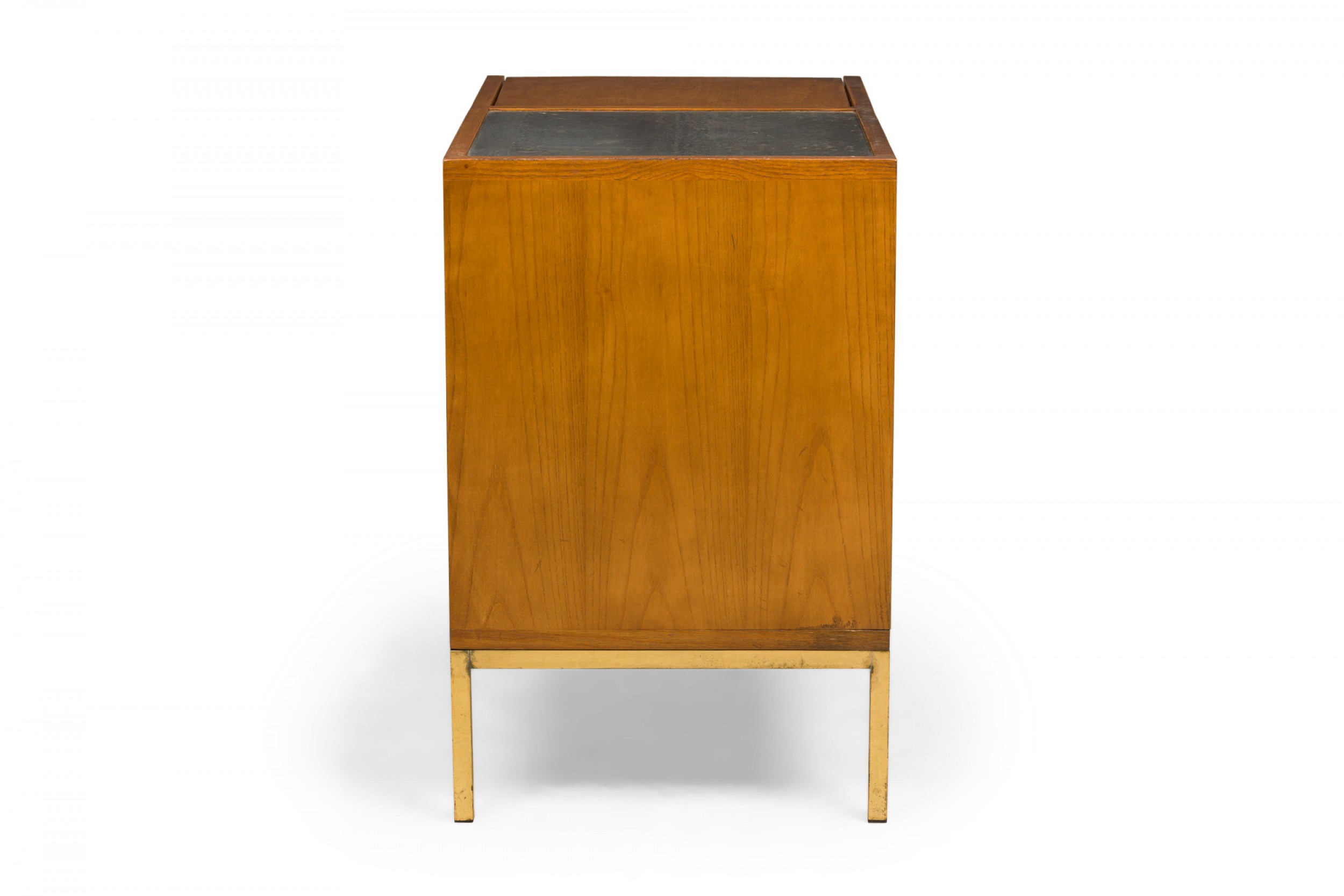 American Mid-Century dry bar cabinet with a walnut case featuring a left-hand closed cabinet next to an open shelf compartment topped with a gray slate serving area, all resting on a polished brass bracket base. (EDWARD WORMLEY FOR DUNBAR FURNITURE COMPANY)