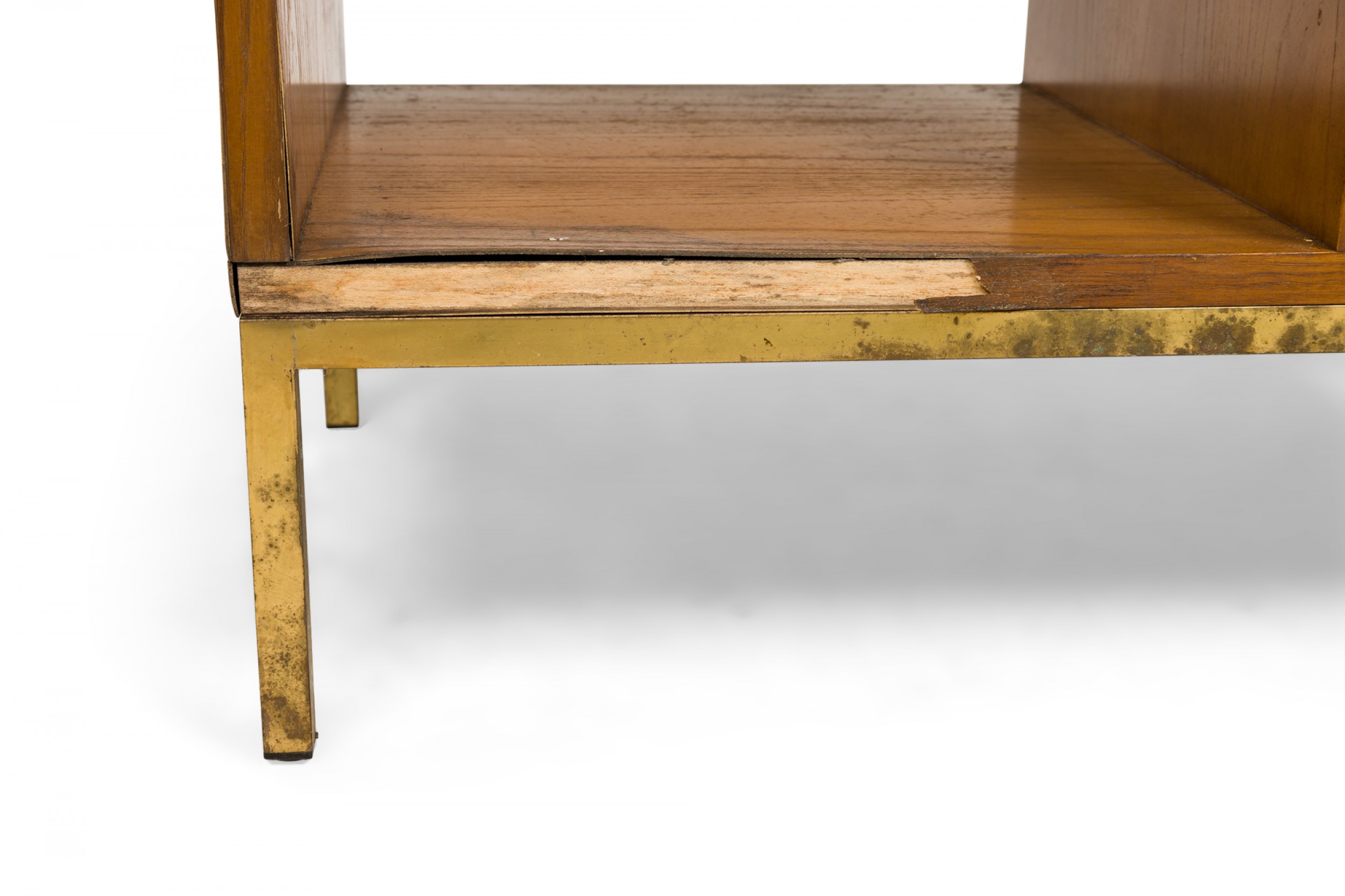 Style: Mid-Century Materials & Techniques: Brass, metal, wood Category: Cabinets & Case Goods, Dining Room, Bar Condition: Minor tarnish to base, some wear to finish. Missing piece of veneer on lower shelf. Good; Wear consistent with age and use