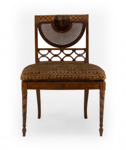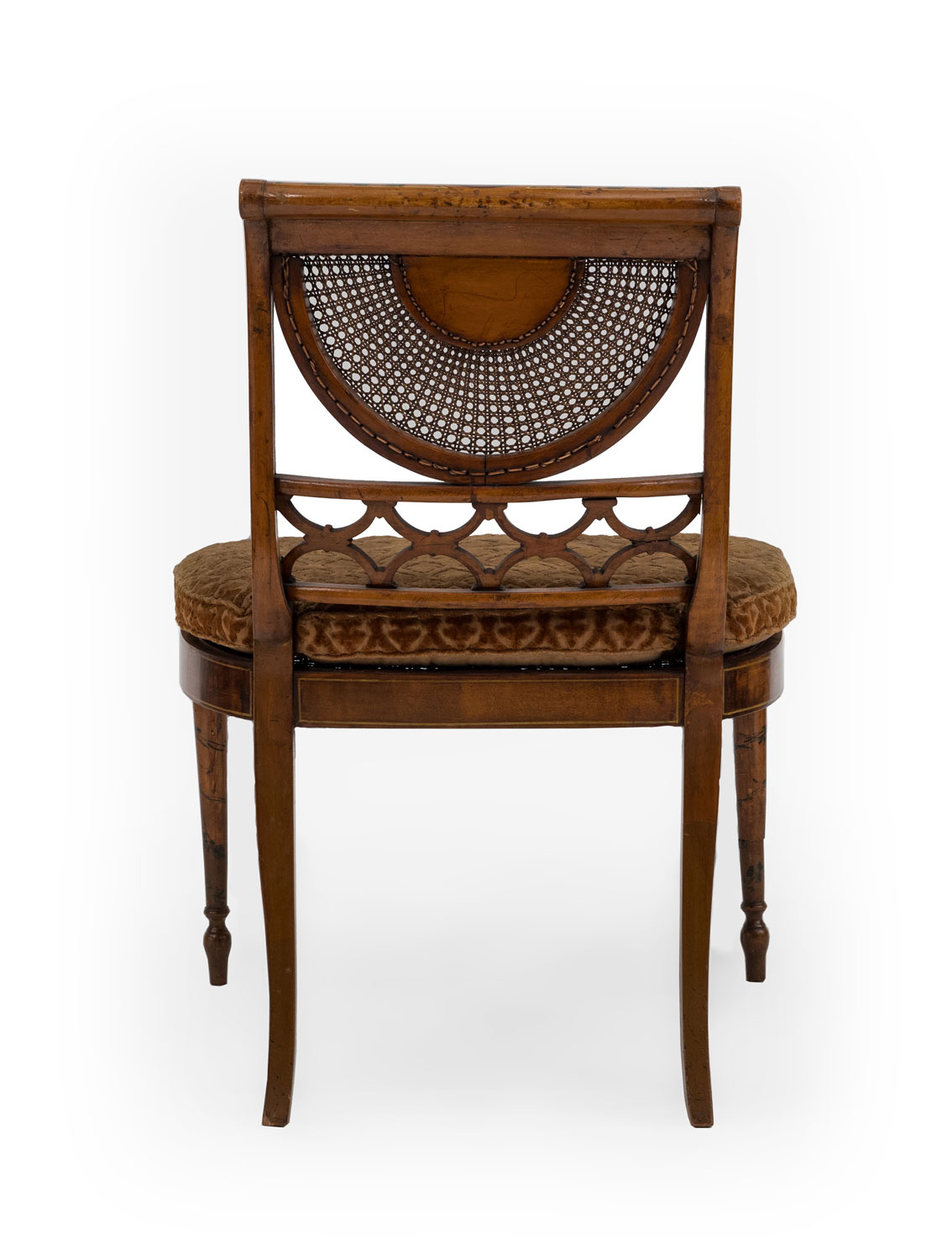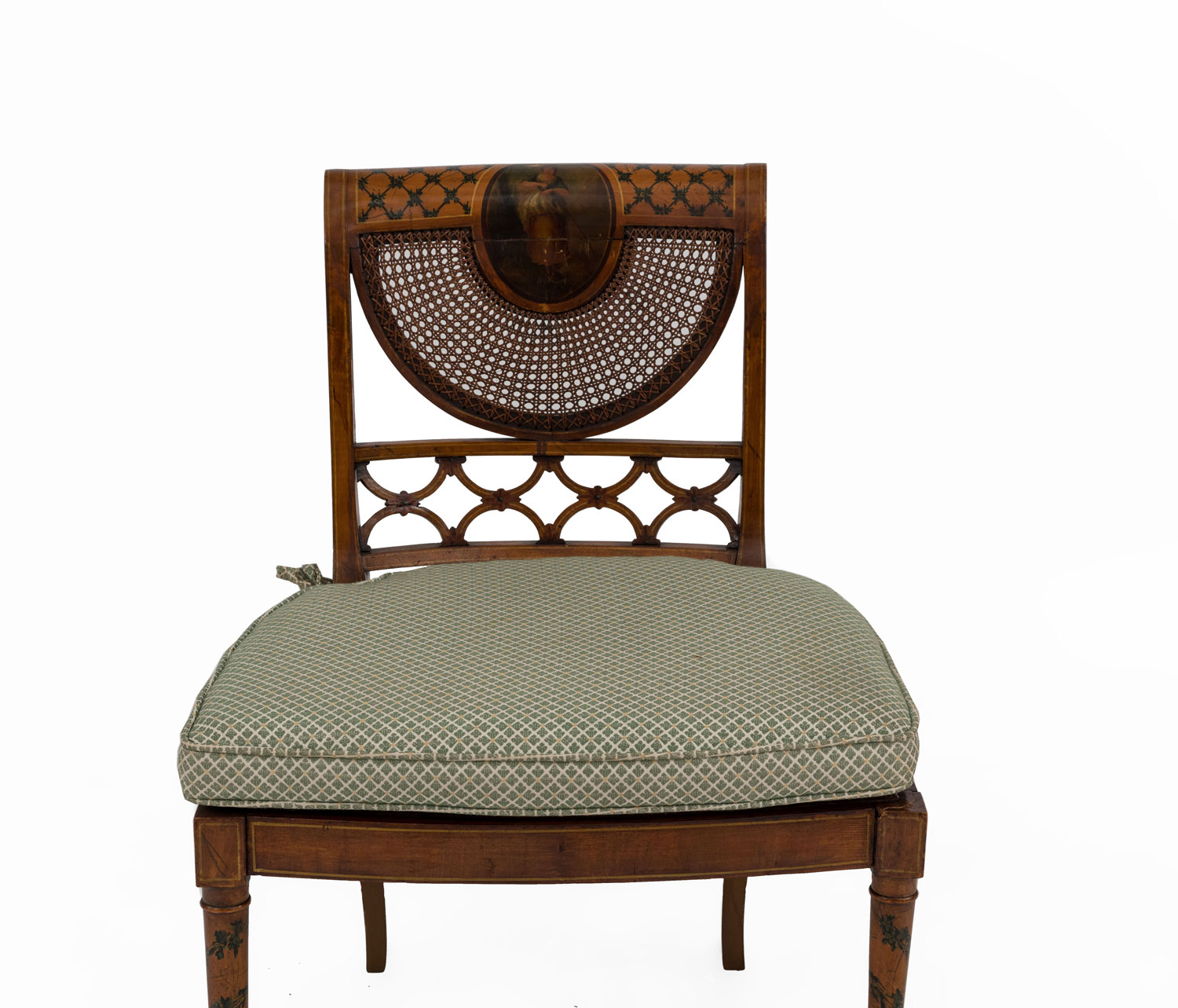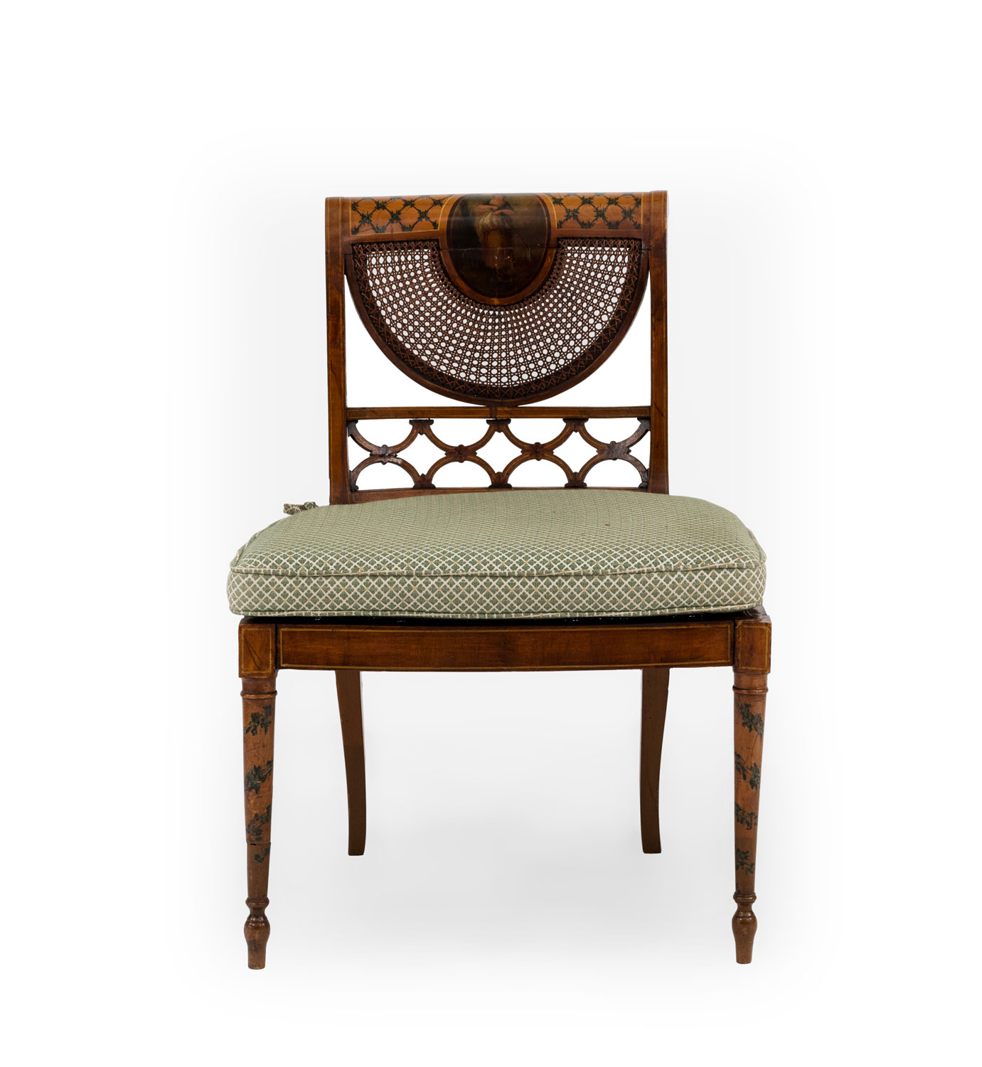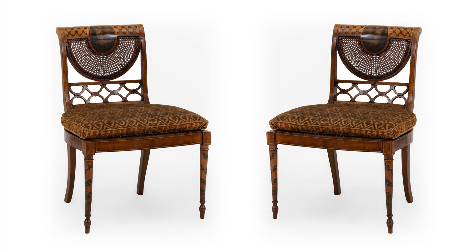 PAIR of English Adam style (18/19th Cent) satinwood and cane back side chairs with painted panels (PRICED PER PAIR) (SEE ALSO: matching loveseat: 037850A, matching armchairs: 037850B)